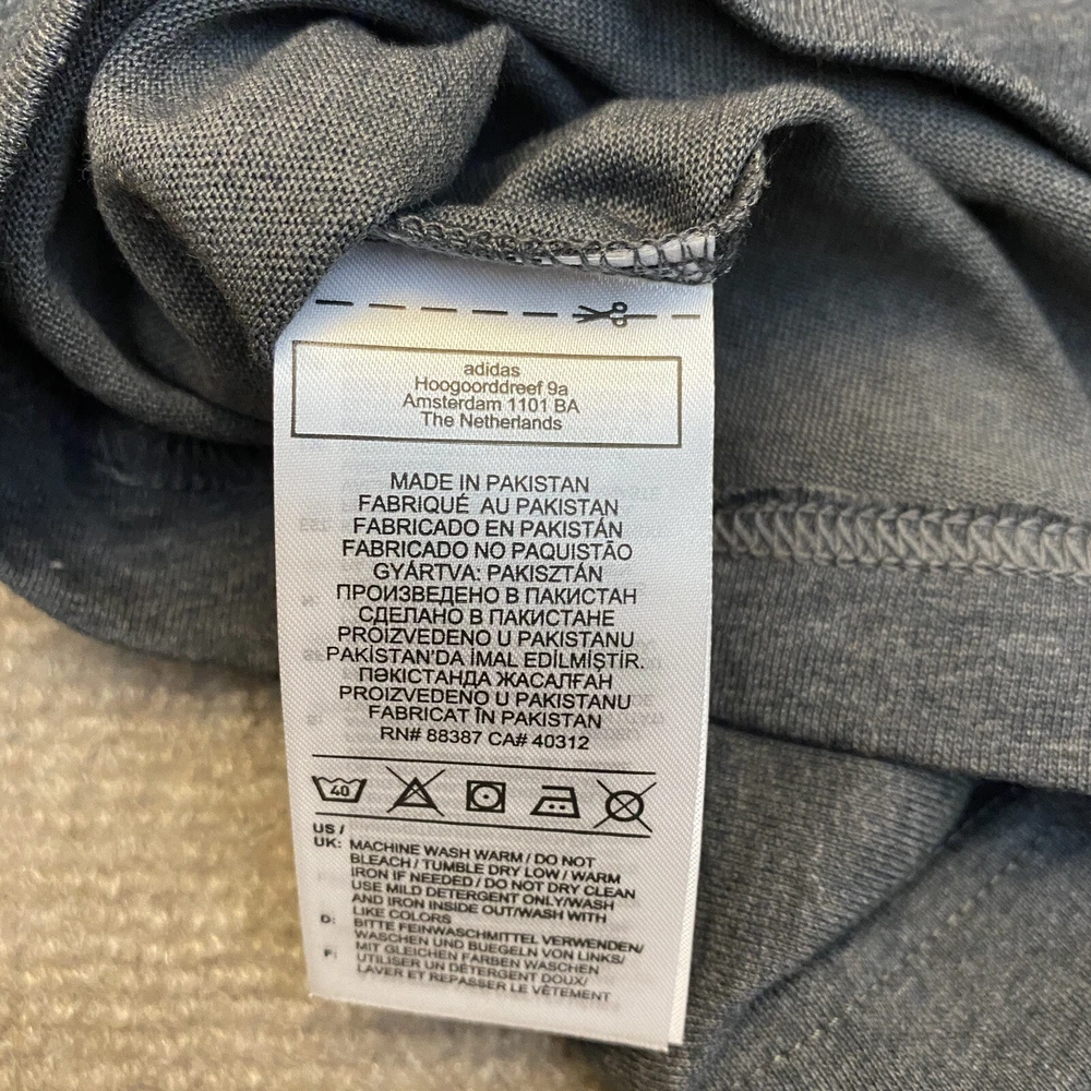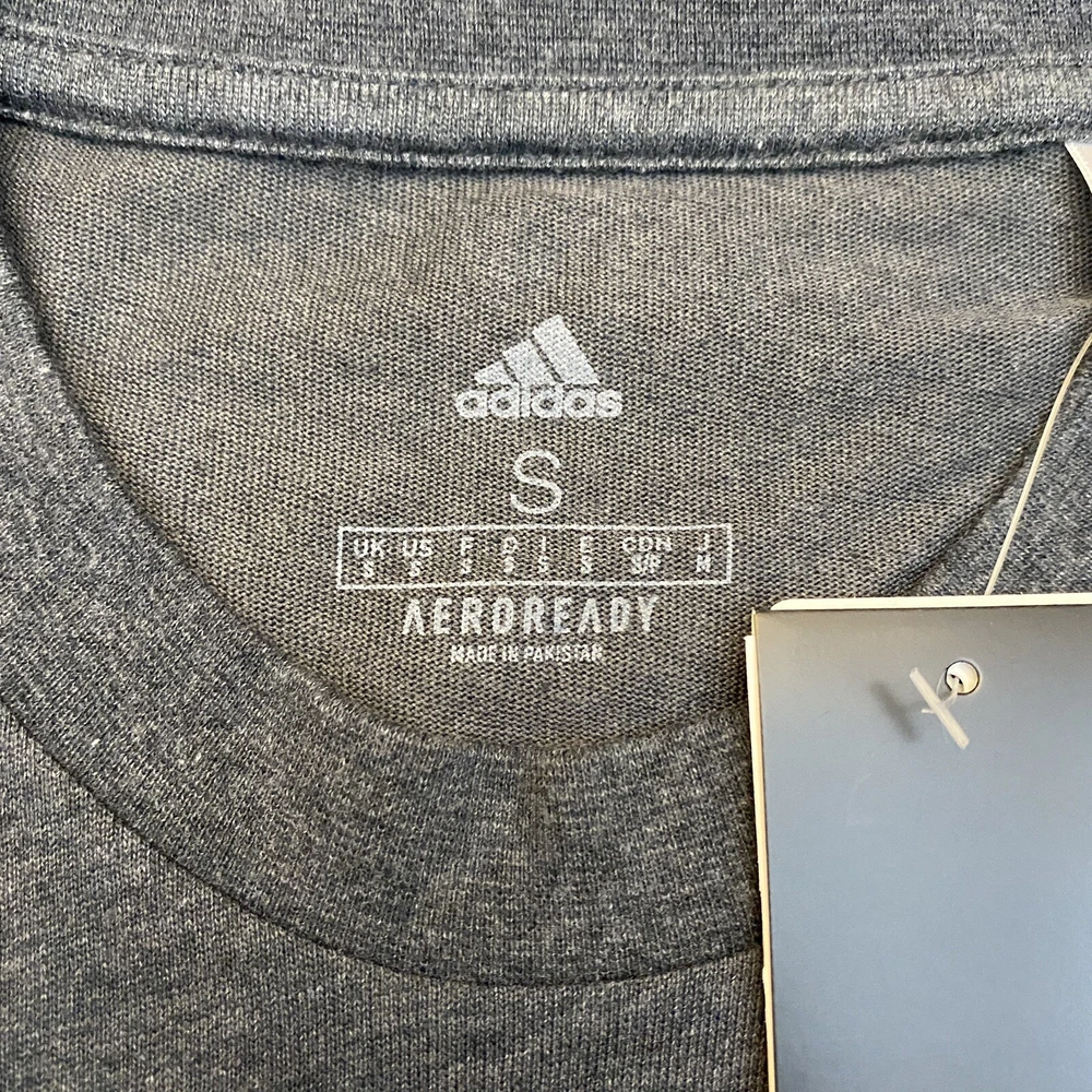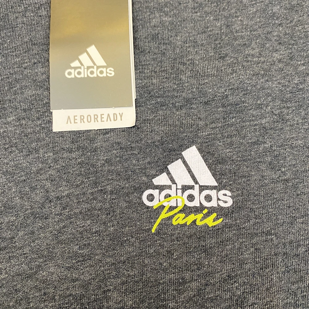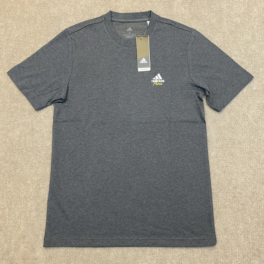 Product Line: adidas Performance Tee Accents: Logo Theme: Paris Size Type: Regular Type: T-Shirt Size: S Neckline: Crew Neck Material: Cotton Blend Brand: adidas Fit: Regular Department: Men Features: Breathable, Collarless, Contrasting Trim Sleeve Length: Short Sleeve Color: Gray Vintage: No Pattern: Solid