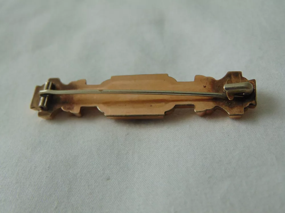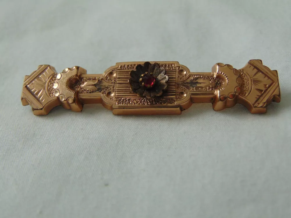 measures 2-1/3 inches across. very ornate Etruscan Revival design and style. genuine Garnet mounted in center of brooch. very collectible.