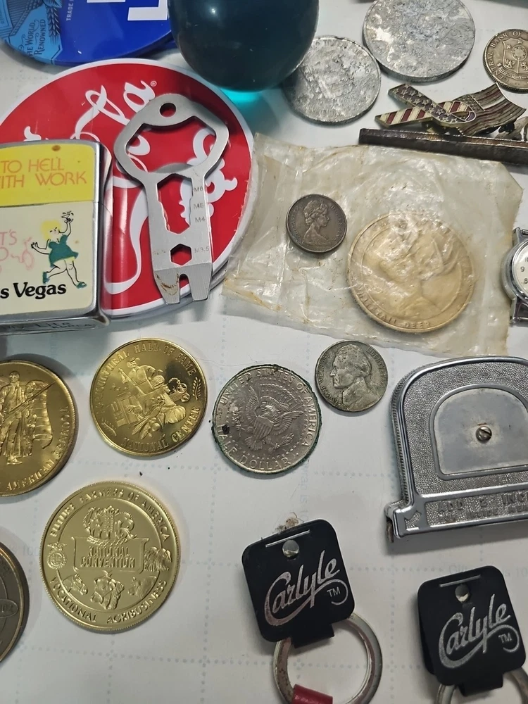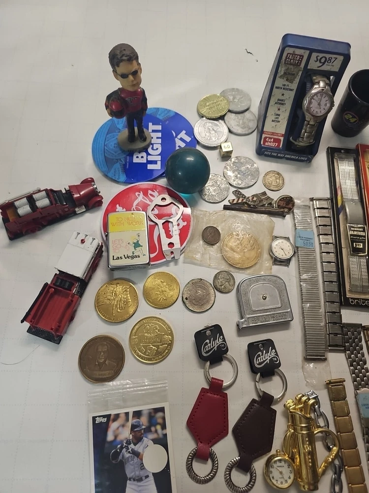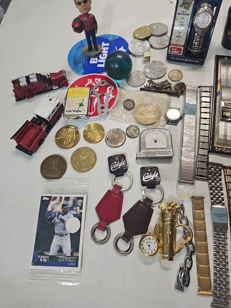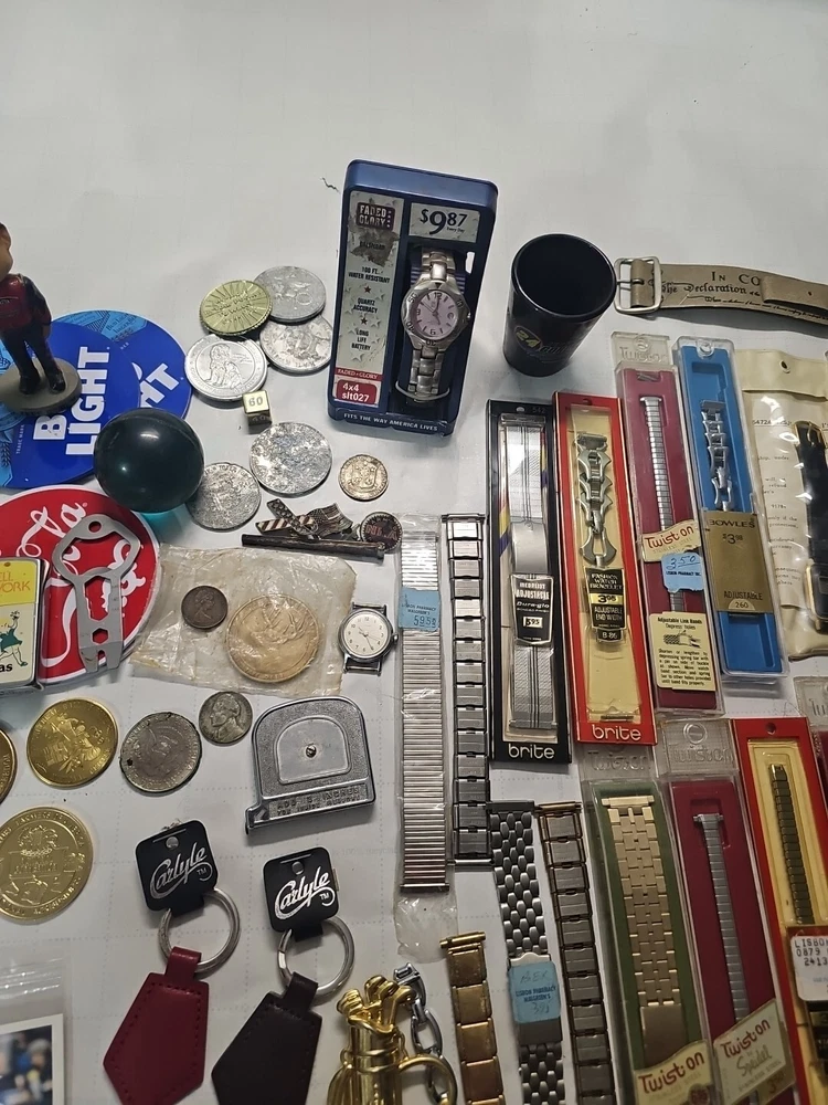 This lot includes a variety of antique and vintage items from an estate, such as coins, collectibles, and wristwatches. It is a mix of different items that have been collected over time and is perfect for someone interested in a diverse collection of unique pieces.