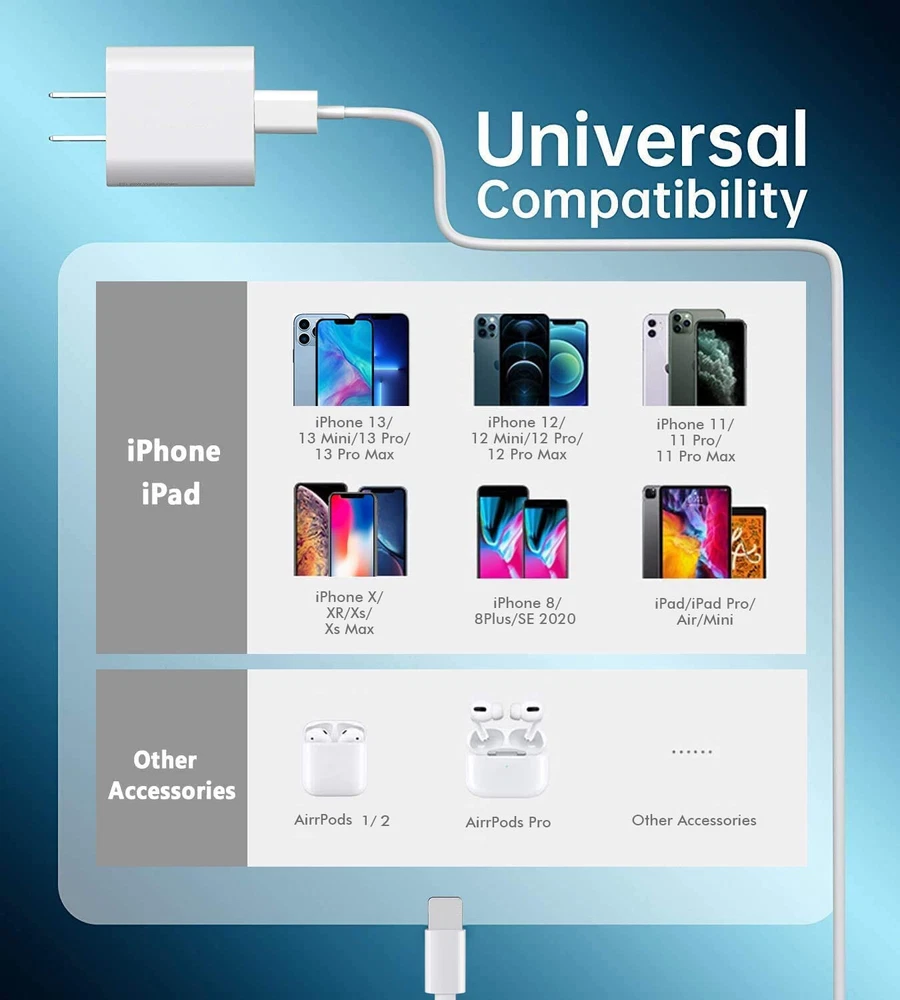 Specification: Type: PD Fast Charger, Wall Charger , Power Adapter,Car Charger,Charger Adapter,USB-C Cable, Charging & Data Sync Cable, Type-C, USB Cable, USB-C to iPhone Cable Features: Fast Charge, Lightweight Color: White Length: 1m/3ft,2m/6ft Ultra-Fast Charging : 20W USB-C For iPhone fast charger, For iPhone 14/14 plus/14 pro/14 pro max/ 13/13 Mini/13 Pro/13 Pro Max/iPhone 12/12 Mini/12 Pro/12 Pro Max/11/11 Pro/11 Pro Max/XS/XS Max/ XR/X/8 Plus/8 up to 50% in just 30 minutes, which saves more than 1 hour for you, when compared to the 5W original charger. Fast Charging & Data Transfer : Top quality For iPhone cable is made of excellent copper cord, which charge For iPhone safely and fast. Work perfectly with wall charger or computer. It not only a safe For iPhone charge cable, but also a fast transferring For iPhone data cable. Tangle-free 6 Foot length is convenient for usage while charging and sync at home/office/travel in bed, hotel rooms, and more. Safety Protection: The Charger Internal High-Quality Chips Protect Your Devices from Heating, Short-circuiting, and over Charging. Our Technology Teams Make Tens of Thousands of Tests to Ensure Users and Devices Safety . Universal Compatibility: 20W USB-C power adapter & C to iPhone cable set, compatible with for iP hone 14/14 plus/14 pro/14 pro max/13 /13 Mini/13 Pro/13 Pro Max/ iPhone 12/12 Mini/12 Pro/12 Pro Max/11/11 Pro/11 Pro Max/XS/XS Max/ XR/X/8 Plus/8, For iPad Pro/Air/ Mini and More. Travel Ready :` Lightweight and pocket-size, USB-C wall charger with 3/6FT charger cable maximizes portability wherever you go. And a wide range of 100-240V input makes it ideal for world travel. Comprehensive Compatibility : With the Corey kin 20W wall charger to access the fast charging for iPhone 14/14 plus/14 pro/14 pro max/13/13 Mini/13 Pro/13 Pro Max/iPhone 12/12 Mini/12 Pro/12 Pro Max/11/11 Pro/11 Pro Max/XS/XS Max/ XR/X/8 Plus/8/7/7 Plus/6; for iPad Pro 10.5”/for iPad Air 3 10.5”/for iPad Mini5 7.9” and More.
