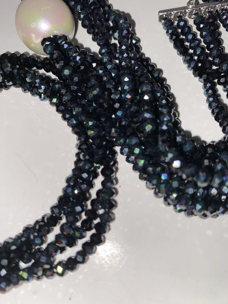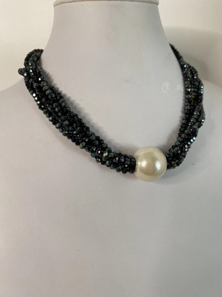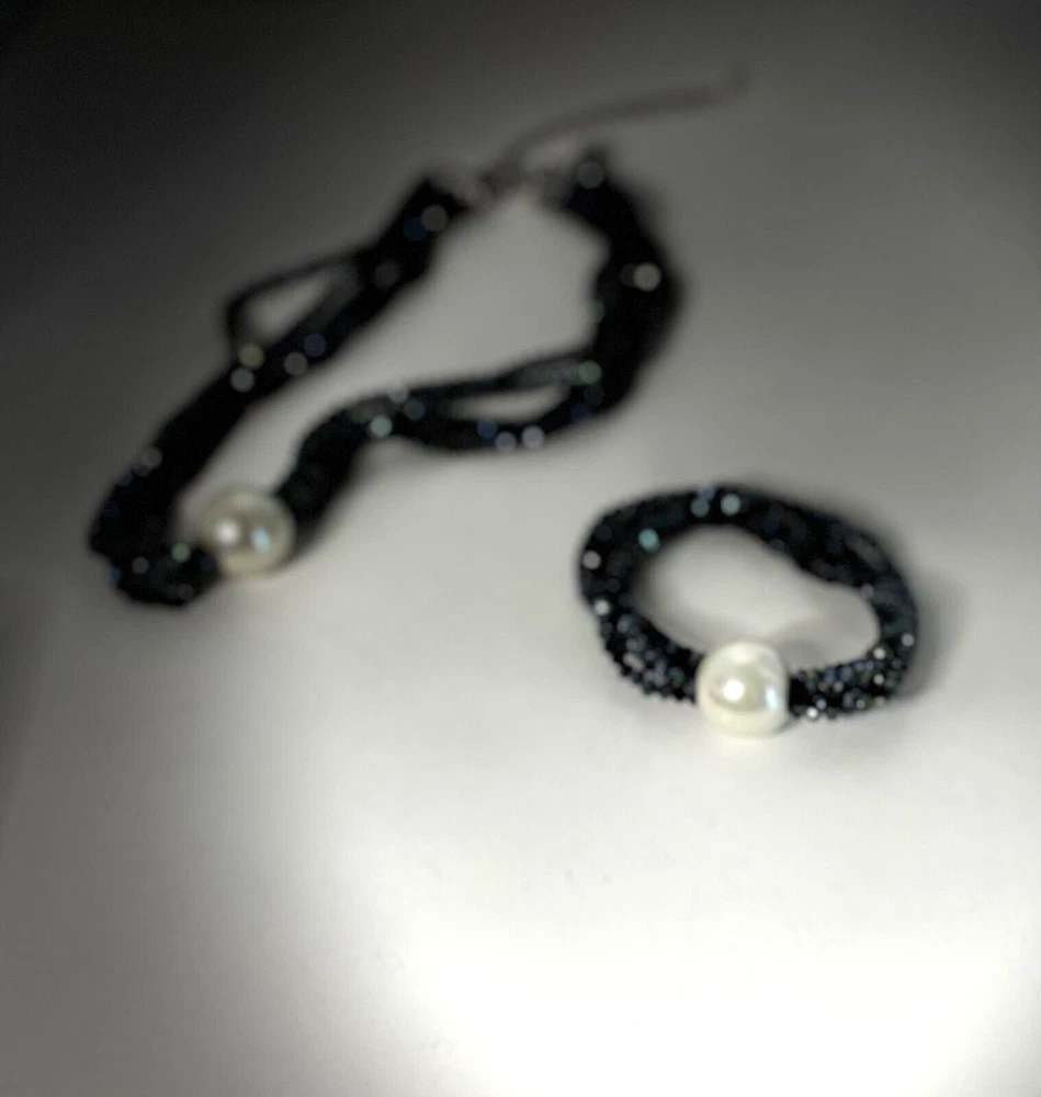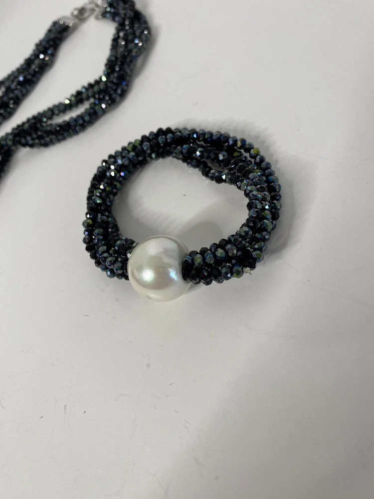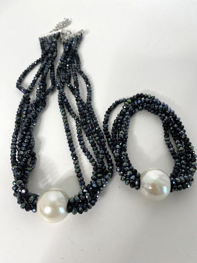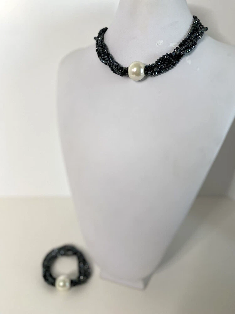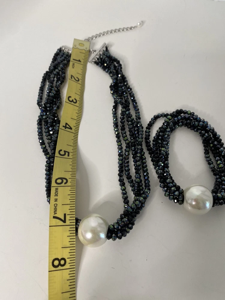 This black beaded necklace and bracelet set features one large pearl pendant. The jewelry set is handcrafted with metal and acrylic beads, perfect for occasions like engagements, graduations, and birthdays. The lobster closure ensures easy wearing, while the bar pendant design adds a touch of elegance to the overall beaded style.