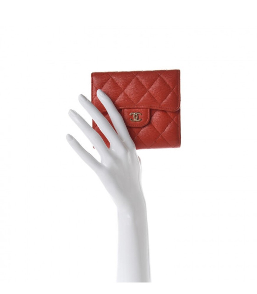 Size Base length: 4.50 in Height: 4.25 in Width: 1.00 in Description This is an authentic CHANEL Caviar Quilted Compact Flap Wallet in Red. This stylish compact wallet is crafted of luxurious diamond quilted caviar leather in red. The wallet features a small polished light gold Chanel CC logo and a flap pocket. The wallet opens to red interior with card slots and a bill pocket. This is a perfect wallet, ideal for everyday use, with the one of a kind style, from Chanel! Condition very good
