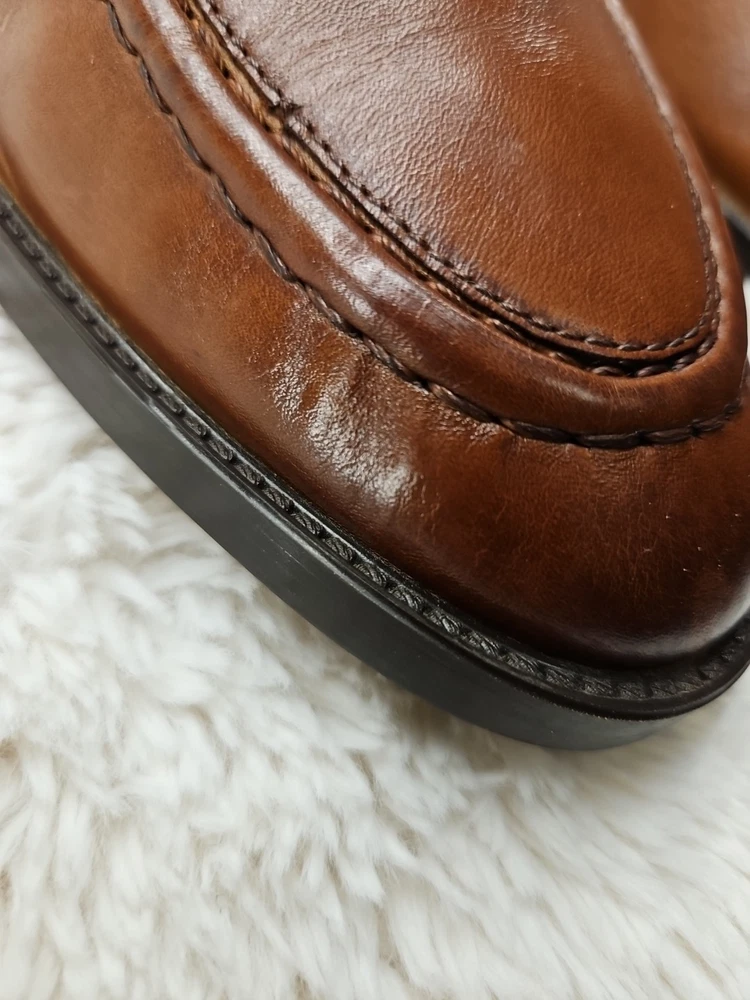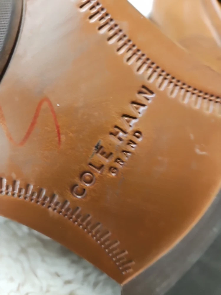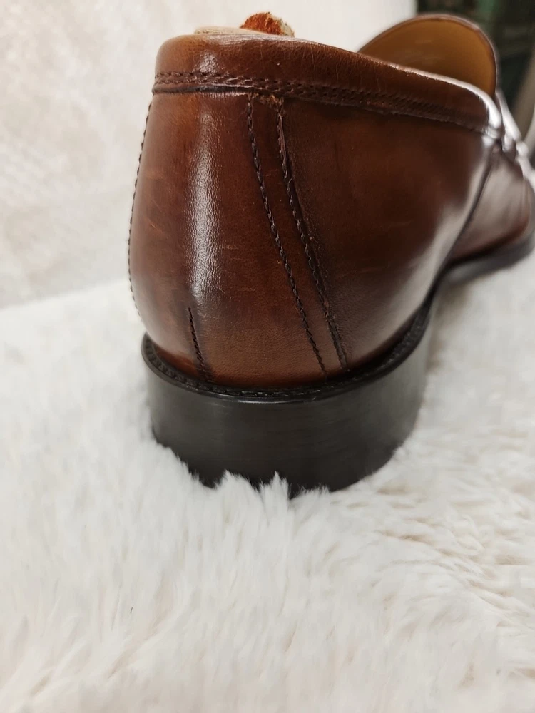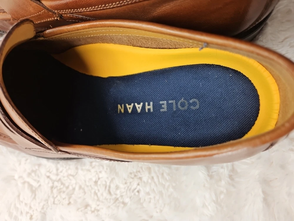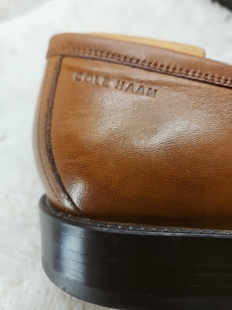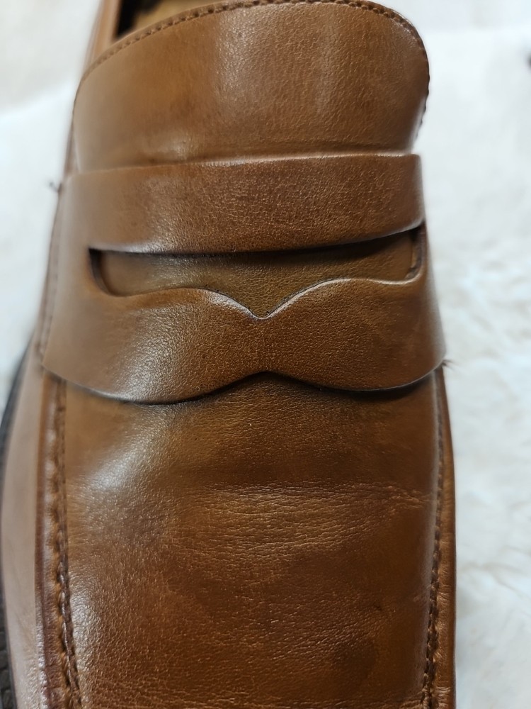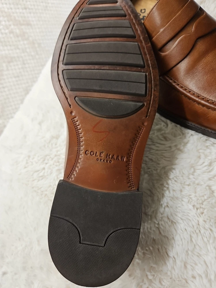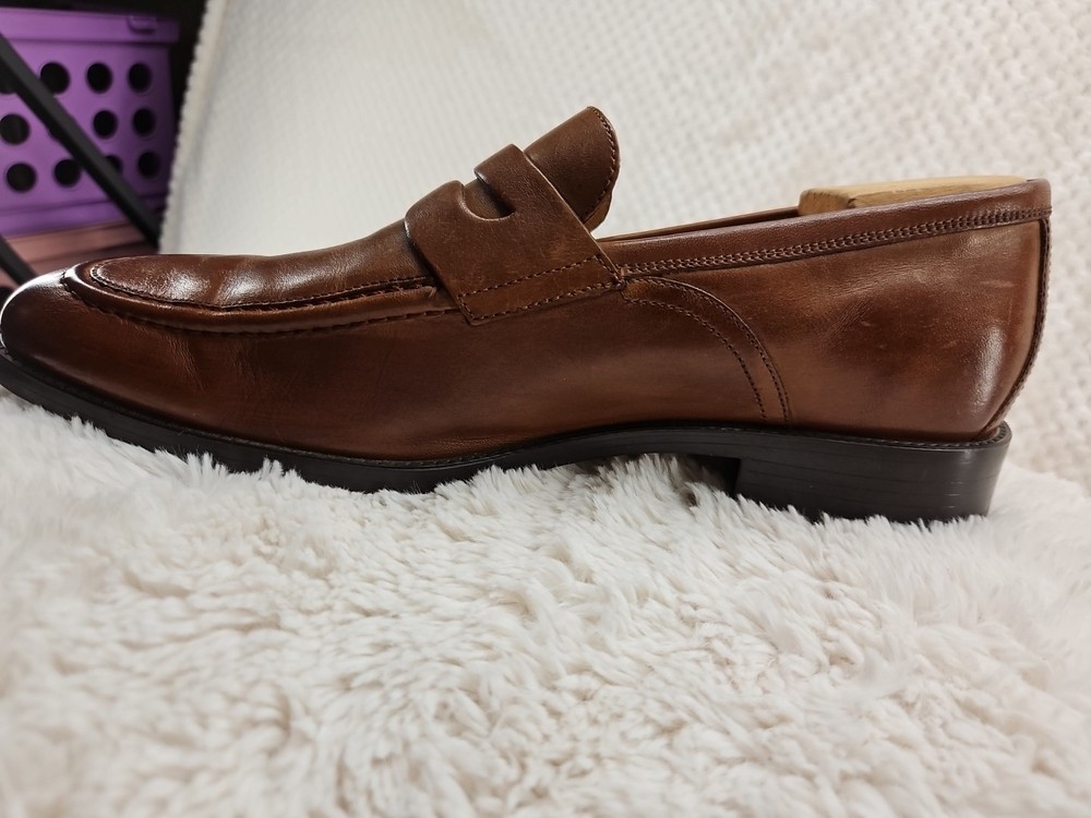 Cole Haan Hawthorne Brown Penny Loafer in size 9.5 for men. This slip-on dress shoe features an almond toe shape, solid pattern, and a leather upper with leather lining. The outsole is made of leather and rubber for slip resistance. It offers cushioned comfort and arch support, making it suitable for all-day wear in summer, fall, and spring. The shoe is part of the Cole Haan Grand product line. These shoes are gently used and beautiful to see...A perfect fit for today's brown shoe/blue suit style...as you know Cole Haan is an old trusted higher end shoe which deserves a second look...these shoes show very little signs of wear....B1075