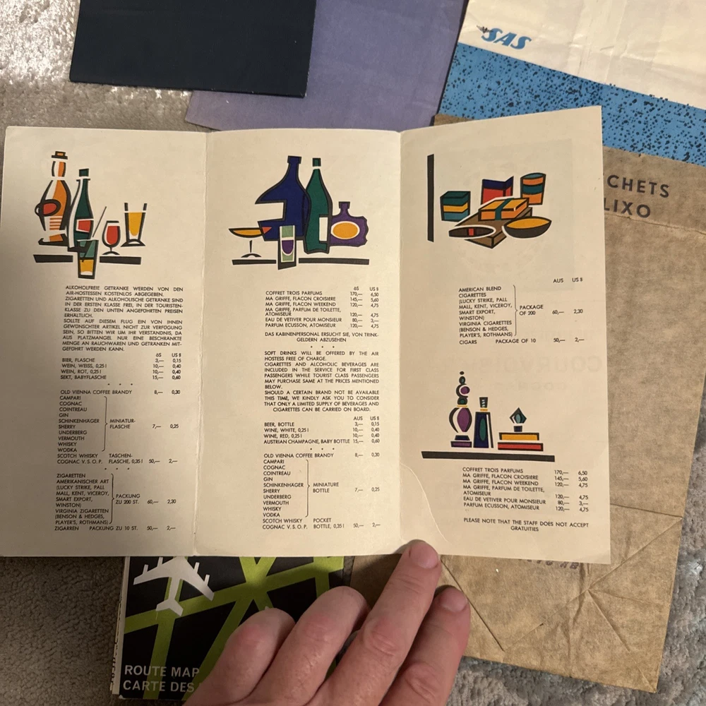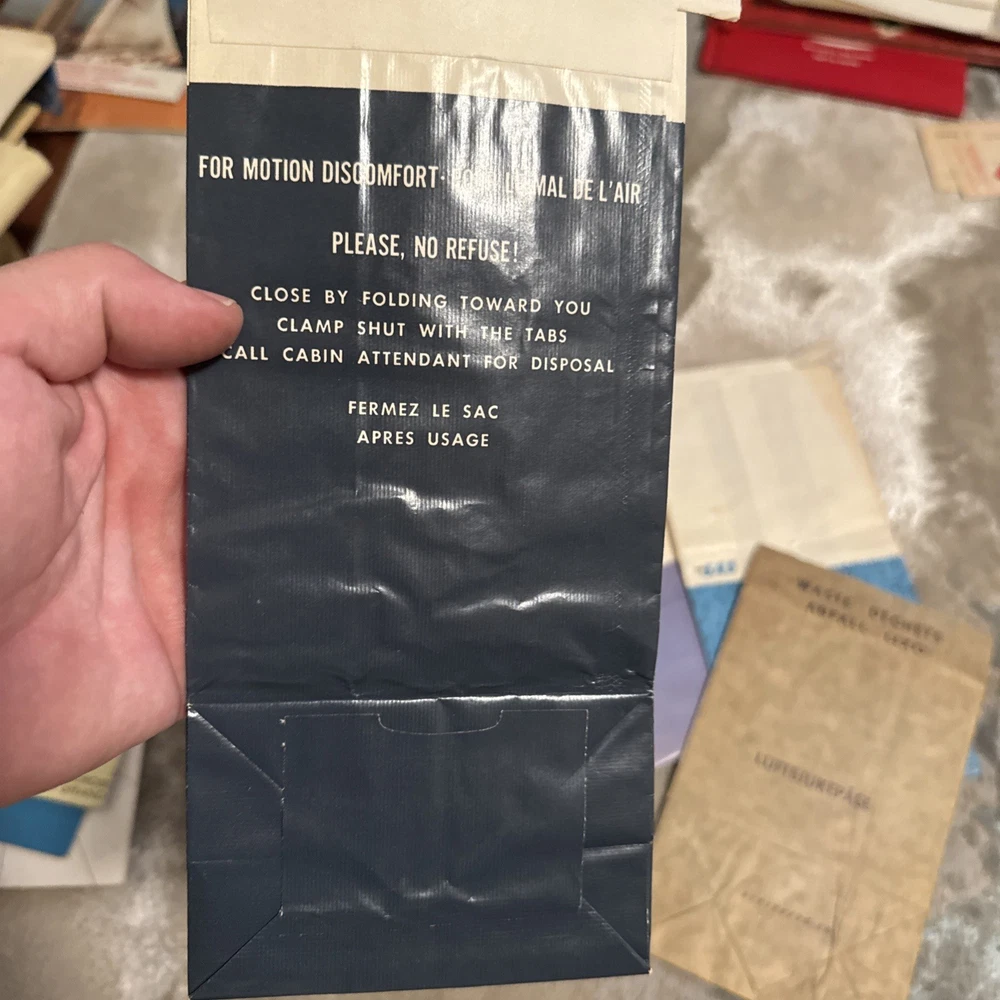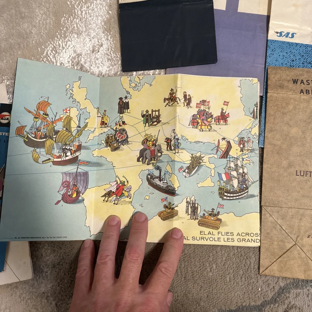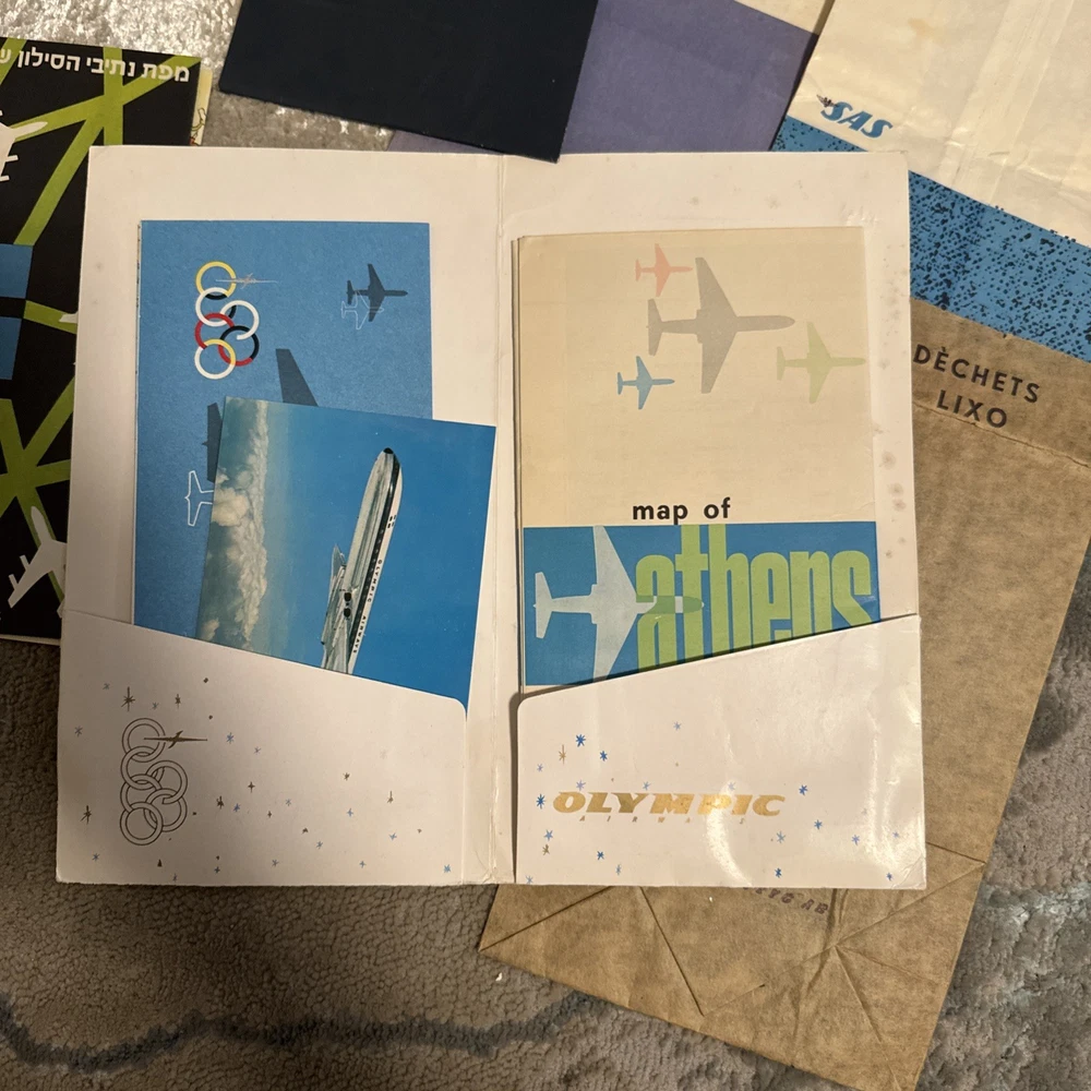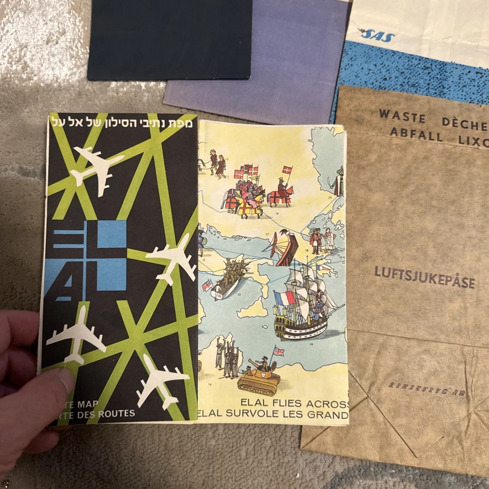 The product is a unique collection of vintage airline memorabilia, including maps, ticket jackets, and airsickness bags. These items offer a glimpse into the history and culture of air travel, providing a nostalgic look at the past. Perfect for aviation enthusiasts or collectors of vintage memorabilia, this assortment of airline-related items provides a tangible connection to a bygone era of travel.