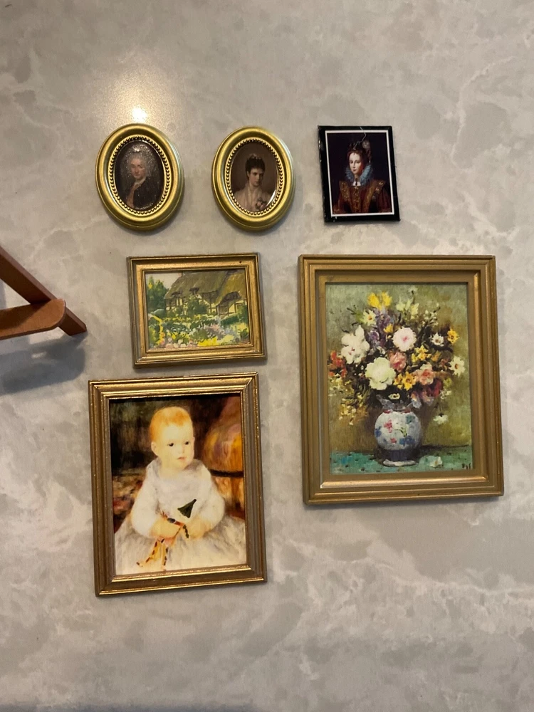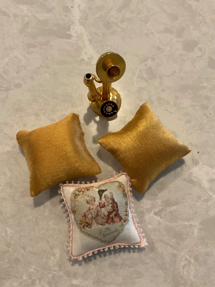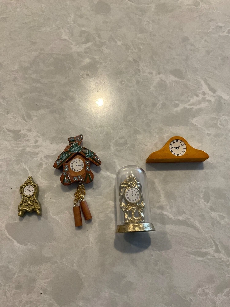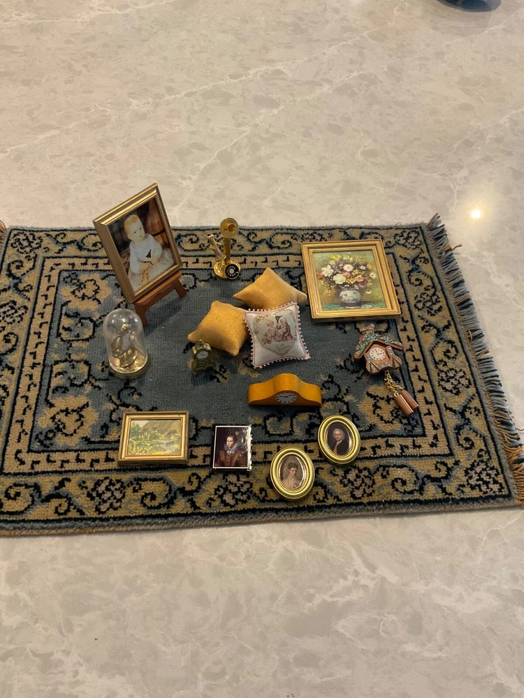 This dollhouse miniatures set includes assorted pillows, clocks, and a rug in a 1:12 scale. Perfect for adding realistic detail and charm to your dollhouse décor. The rug measures 9” by 13”. The little German style clock was handmade my me.