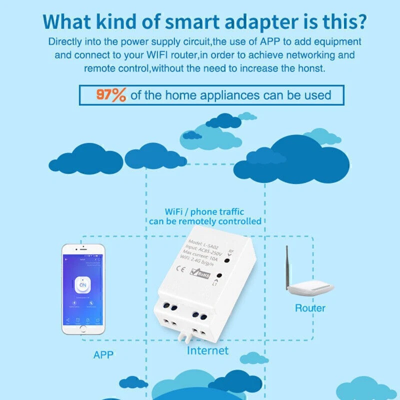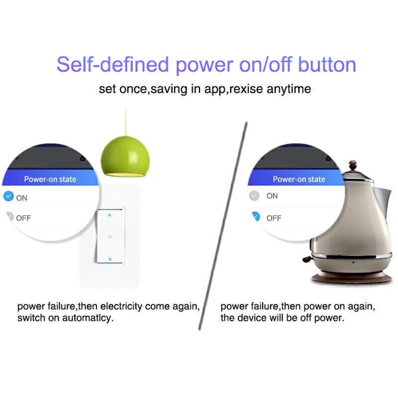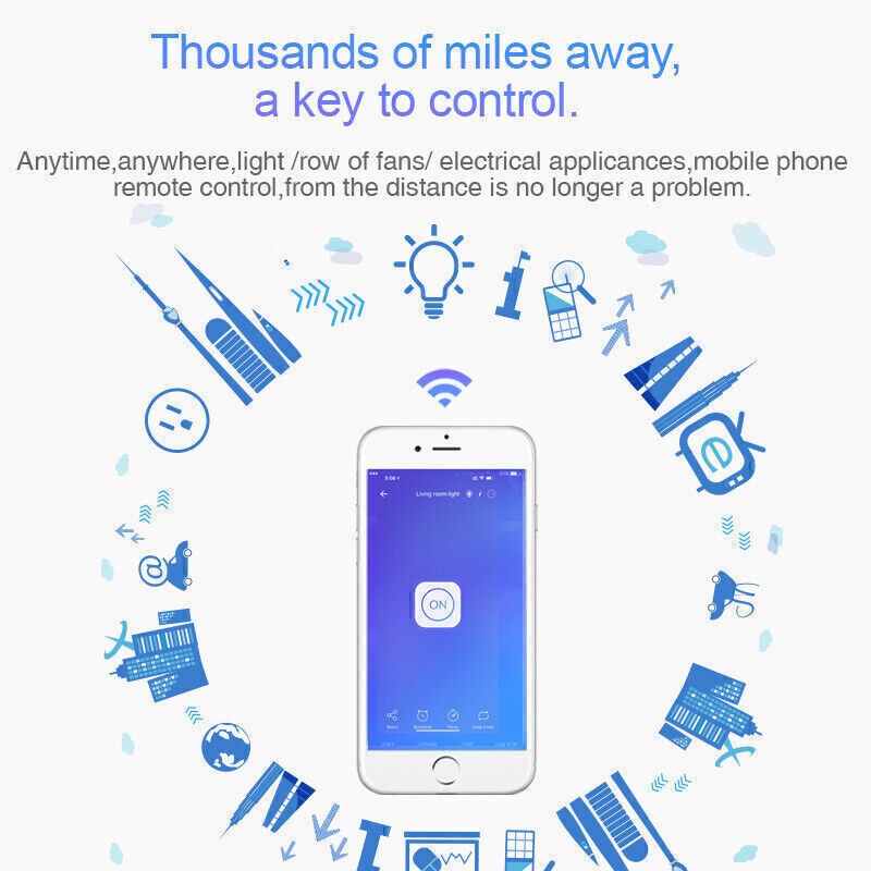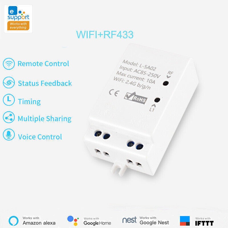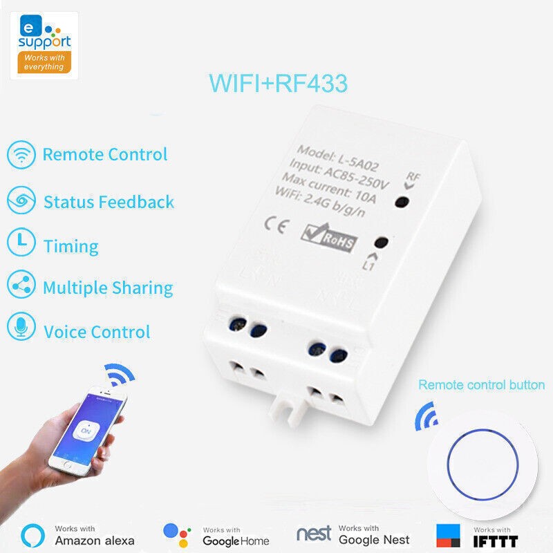 SAFE & SECURE SHOPPING 100% SATISFACTION GUARANTEED FAST SHIPPING Ewelink WiFi RF433 Wireless Smart Remote Control Switch Module Timer For Alexa Product Description If you have any questions, please contact customer service first, do not open disputes easily, thank you! Features: 100% brand new and high quality. Portable and durable, easy to carry, lightweight. Support WiFi network. Support 433 romote control. Support status tracking, home appliances status timely feedback to your APP. Support remotely turn on or off added devices. Support Max 8 timing tasks for each added device. Support numerous WiFi smart switches one smart phone. Easy installation, easy handling and can be activated immediately and stably. Specifications: Type: single remote control switch Working voltage: AC 100V ~ 250V Operating frequency: 50Hz Total load power: 10A / 2200W Remote distance: infinity Working temperature: -20 ~ 70℃ Scope: ceiling lamps, lighting, fans, drinking fountains, sockets Control: Mobile APP Transmission: WIFI communication Power consumption: smaller or equal to 0.5W Size: about 88 * 38 * 23mm Terminal platform: for Android / iOS Package Included: 1 * WiFi RF433 Wireless Smart Switch Module Note: The remote control buttons cannot be used alone. About Us About Us We accept all payments authorized by eBay. Copyright © 2022 Tongtool