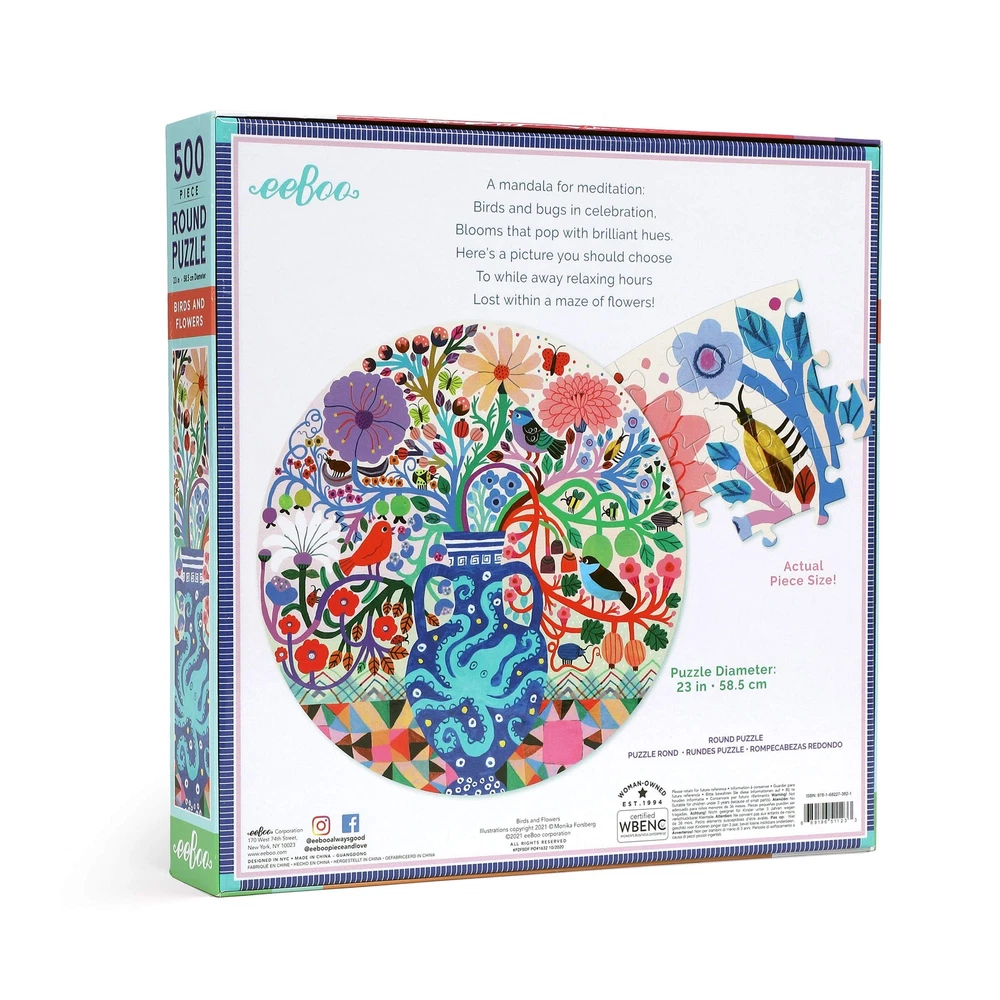 eeBoo: Piece and Love Birds and Flowers 500 Piece Round Adult Jigsaw Puzzle, Puzzle for Adults and Families, Glossy, Sturdy Pieces and Minimal Puzzle Dust eeBoo’s Piece and Love Birds and Flowers 500 piece round puzzle takes us to a white-washed Grecian cottage by the seaside. Resting upon a colorful mosaic tabletop is a water vessel showcasing a prominent and classic octopus icon. The azure-colored vase with its Greek key and evil eye graphics hold a willowy arrangement that is overflowing with flowers, vines, songbirds and insects. Illustrated by Monica Forsberg. Our 500-piece jigsaw puzzles are thoughtfully commissioned and designed to offer a screen-free, relaxing way to practice contemplative mindfulness or share a gentle cooperative activity with friends and family. The round jigsaw puzzle format lends additional clues to the pieces’ orientations. PIECE COUNT: 500 |Includes color insert Puzzle size is 23 inches in diameter when finished A HIGH-QUALITY jigsaw puzzle for adults and families, with glossy, sturdy pieces and minimal puzzle dust. SUSTAINABLY SOURCED: 90% recycled materials, printed with vegetable-based inks. The round jigsaw puzzle format lends additional clues to the pieces’ orientations. Shipping from the USA All of our products are shipped from the USA, ensuring quick delivery to your destination. Payment We offer the following payment methods: PayPal, credit card, bank transfer, and eBay's secure payment system. Free Shipping & Free Returns Shipping within the USA is FREE. Additionally, any return is absolutely free for you. Risk-Free Purchase You have the option to return an item within 30 days without any justification. We cover the return shipping costs! Fast Shipping We ship immediately upon receipt of payment. Generally, the package is delivered within 2-3 days in the USA. If it takes longer, we will contact you. Quality and Costs Made in Europe, USA, China No customs fees or additional charges Total satisfaction guarantee Invoice with declared VAT available upon request in .pdf format Feedback Your feedback is very important to us. After you pay for your purchase, you will automatically receive positive feedback from us.