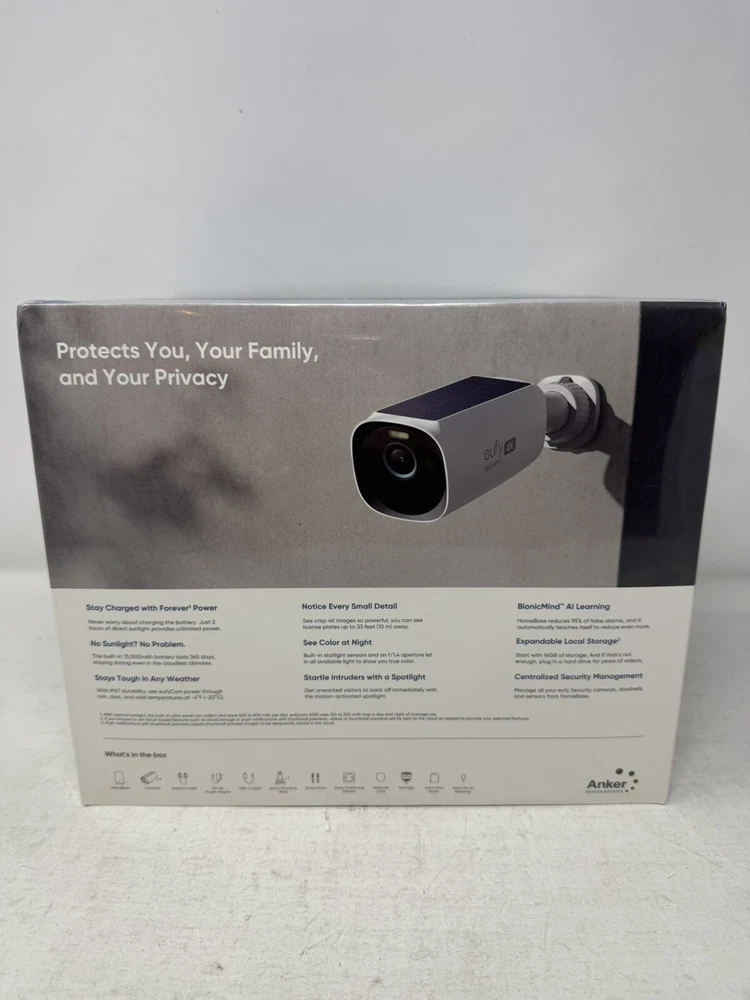 Factory sealed Crystal-Clear Night Surveillance: Achieve superior night vision with the eufy 4k camera's Starlight system, delivering 4K quality and vibrant colors in low-light conditions, outperforming traditional 1080p cameras. Intelligent Intruder Alert: The eufycam 3's BionicMind AI accurately identifies friends from strangers without additional charges, advancing beyond simple motion detection. Privacy-First Storage Solution: The eufycam 3 features military-grade encryption for local storage expandable up to 16 TB, ensuring safe data storage without the need for subscription-based cloud services. Eco-Friendly Security: With its solar panel, the eufycam 3 requires just two hours of sunlight for continuous operation, surpassing the battery life of standard security cameras. Tailored Smart Control: The eufycam 3 offers voice control through Alexa or Google Assistant and customizable activity zones for an enhanced smart home experience that goes beyond typical automation. 30 days free returns: Item must be returned in exact SAME condition, with all accessories, components and original packaging in order to receive a full refund, otherwise a deduction will be applied based on the condition of your return.