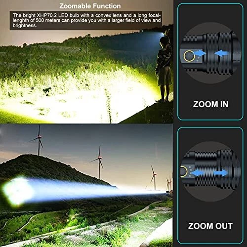 Return Policy Fast Delivery Trusted seller flashlights LED high lumens Rechargeable, Extremely Bright 50000 lumens Flashlight, IPX67 Water Resistant, 5 Light Modes, zoomable Tactical Flashlight for Emergency Camping Gift Product Description [LED Flashlight 50000 Lumens] This LED rechargeable flashlights high lumens is equipped with an advanced XHP70.2 LED chip, which is stable and super bright, 10 times brighter than ordinary light bulbs. Light up an entire room with ease and a maximum beam distance of up to 2000 ft . The flashlight is made of high quality aviation aluminum alloy and the surface coating has been specially oxidized to make it wear-resistant and anti-drop. [Type-C Rechargeable & POWER INDICATOR]This rechargeable flashlights can provide up to 12 hours of runtime, with upgraded overcharge protection, it can be charged by TYPE-C. cable(included). The flash light will stop charging when it fully charged, so we don't need worry about the safety when we forget the flashlight is charging. The power indicator above the flashlight helps you clearly understand the flashlight power (25%, 50%, 75%, 100%). [IP67 WATER Resistant & Widely Portable Camping Led Lamp] IP67 water Resistant tactical flashlights is made of aviation grade aluminum alloy,Can be used for camping, hiking, fishing, running, dog walking, repairing, power outage, emergency, ed search and home use. It's a good tool for home, night travel and outdoor activities. [Adjustable Focus & 5 Light Modes] This high lumen flashlight has 5 lighting modes: high light, middle light, low light, flash and sos. You can turn it off by long pressing the buttons for 3 seconds in any mode. Depending on your needs, you can extend the head of the flashlight to adjust the focus, the spot light for long-distance observation and the search light for large-area illumination. [Full Flashlight Kit] What you get: 1 x flashlights high lumens, 2*power resource, 1xflashlight holster,1 x Type-C charge cable, 1 x user manual and gift box.We have carefully checked all flashlight rechargeable before shipment and ensured that the products are working properly Most importantly, we are always available for customer service, if you have any questions, please feel free to contact us. Warmly tips:Don't worry if touch hot under the highest brightness for a while. This is a normal phenomenon of ultra-high lumens. We recommend adjusted to the low mode at this moment. Shipping Returns Payment Shipping Shipping is FREE to all addresses other than APO/PO boxes in the lower 48 states. All our stock ships from US-based warehouses. Shipped via USPS or UPS (depending on location and package weight) Unless stated otherwise, all orders will ship within 24-72 hours of your payment being processed. Check our feedback to see the great reviews of FAST shipping we offer. Returns Seller does not accept returns Payment We currently accept payment via eBay managed payments only. Once payment is cleared, we will dispatch your shipment within 1-3 business days. Please refer to the "Shipping" tab for more information regarding shipping speed to your destination.