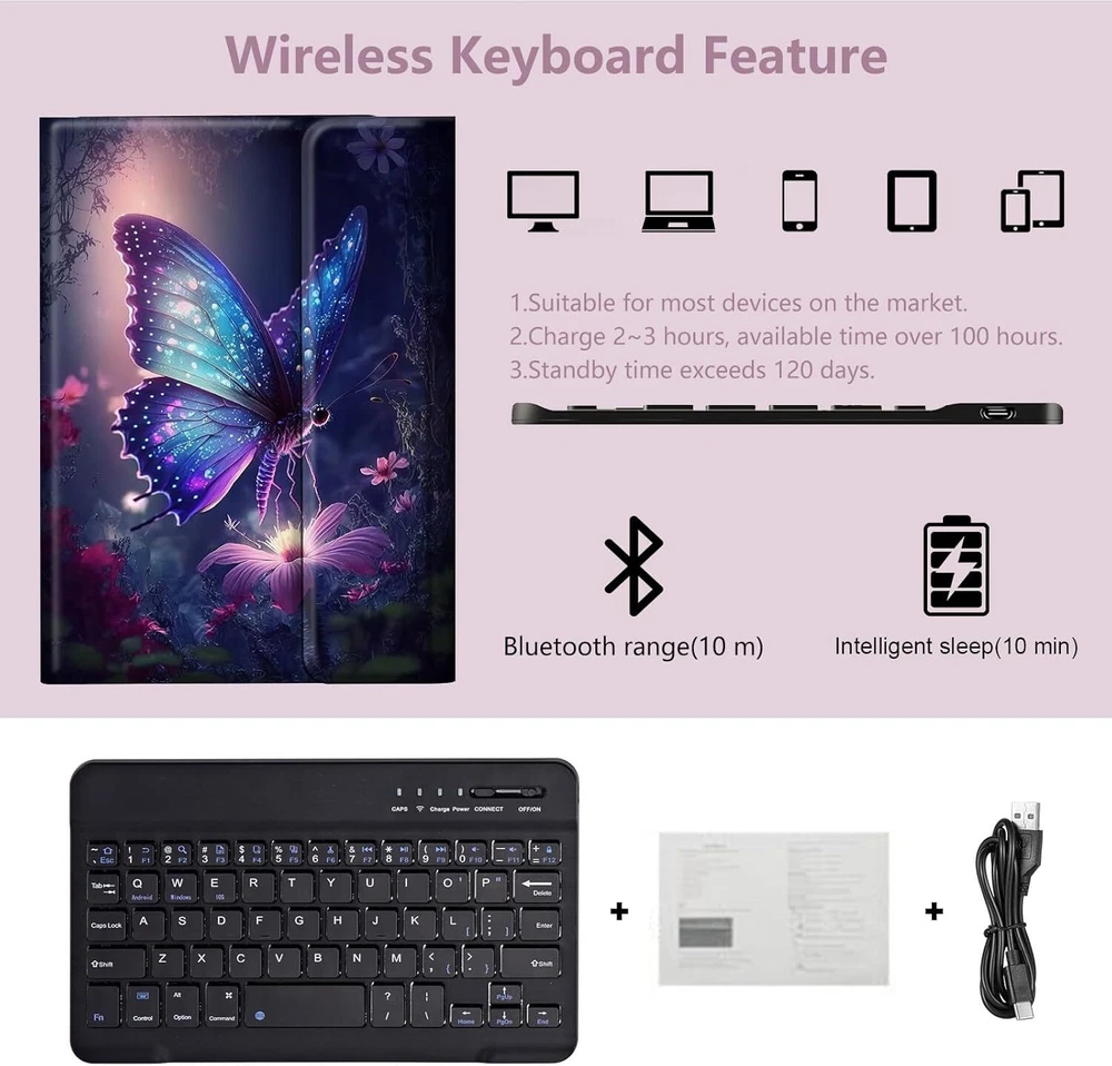 forFire Max 11 Keyboard 11 11", Glowing Purple Butterflies Product Details Product Dimensions: 9.79 x 6.44 x 0.3 inches Item Weight: 11 ounces Manufacturer: RMJKXQZG Item model number: Fire Max 11 (2023, 13th Gen) Is Discontinued By Manufacturer: No Brand: RMJKXQZG Connectivity Technology: Bluetooth Keyboard Description: Flexible Color: Glowing Purple Butterflies Style: Modern Product Dimensions: 9.79"L x 6.44"W x 0.3"H Material: pu leather Included Components: USB Cable Thoughtful Design: Built-in pencil holder is convenient to store and carry stylus pen for tablet to avoid the risk of losing the pencils; The fire max 11 Case with keyboard contains a non-slip lining and supports a multi-view bracket,allowing you to adjust the viewing angle as you like while keeping your tablet stand steadily; The detachable keyboard allows you to easily switch between laptop and tablet mode; This tablet case with keyboard has a magnet so the keyboard doesn’t move when typing. Heat Release & Full Protective: This tablet case for Fire Max 11 comes with honeycomb grid pattern design is better for heat release. The honeycomb cooling design keeps your tablet at the healthiest temperature. Thoughtful design to effectively extend life of your beloved tablet. Hard PU leather shell and soft flexible TPU bumper shock absorbtion give comprehensive protection for your kindle fire 11 model from scratches and damage. ★★★About The Product★★★ ♥The super-strong magnet ensures that the keyboard doesn't move while typing. ♥Honeycomb grid pattern design is better for heat release. ♥Supports multiple viewing angles while keeping the tablet firm. ♥Thin and light doesn't take up much space. ♥Super magnetic, won't fall off when lifted. ♥Built-in pencil holder is convenient to store and carry tablet Pencil. ♥The keyboard connection is pretty much immediate when you turn it on. ♥Detachable design allows you to easily switch between laptop and tablet mode. It is a very functional and practical design that can be used in the office or at home! ★★★Package Included★★★ ---1 X tablet keyboard case for 10th Generation 2022 ---1 X Operating manual for bluetooth keyboard ---1 X Charging cable for bluetooth keyboard ★★★Please Note★★★ ---This tablet keyboard case only for tablet 10th 10.9” 2022(Model Number: A2696/A2757/A2777). Not suitable for other tablet Tablets. ---There may be color differences due to light intensity and screen resolution. ★★★After-sales service★★★ We sincerely invite you to leave your usage experience to share with other customers! Also please do not hesitate to contact us if you have any questions about this case. We will get back to you within 24 hours.