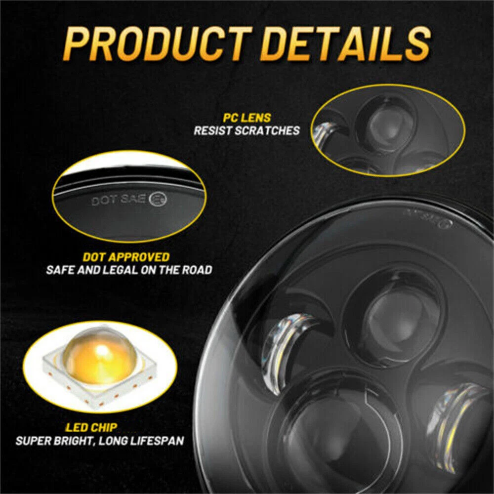for Jeep Wrangler JK LJ TJ CJ 7" Round Newest Led Headlight Headlamp Sealed Beam Packages We Send 1x 7" inch Round LED Headlight 1x H4 H13 Wiring Adapter About Our Items --- Simple and classic design, making your vehicle look more charming,wow,just like this! --- DOT SAE dual certification, compliant with US road law, safely driving! ---Adopting the best LED chips in the market as light sources, resulting in a 300% increase in brightness! ---The shell is made of higher-level aluminum alloy, with good quality visible and durable! ---Newly upgraded EMC is already built-in , so there is no need to worry about flickering, not working, dim, and other issues. Some Descriptions Have a Look • Power:75W • Voltage: DC 9-32V • Size: 7.09" x 7.09" x 3.23" • Color Temp: 6000K • IP Grade: IP 67 • Lifespan: 80,000 hours • Housing Color: Black • Luminous Flux: 6500LM@high beam,4800LM@low beam • Meterial: Die-cast Aluminum Housing + Clear Hardcoated PC Lens • Warranty: 3 Year