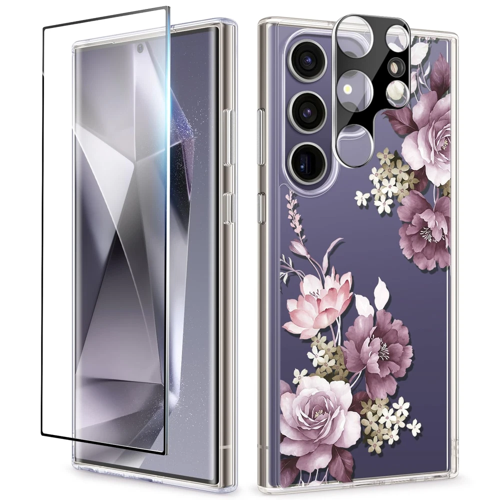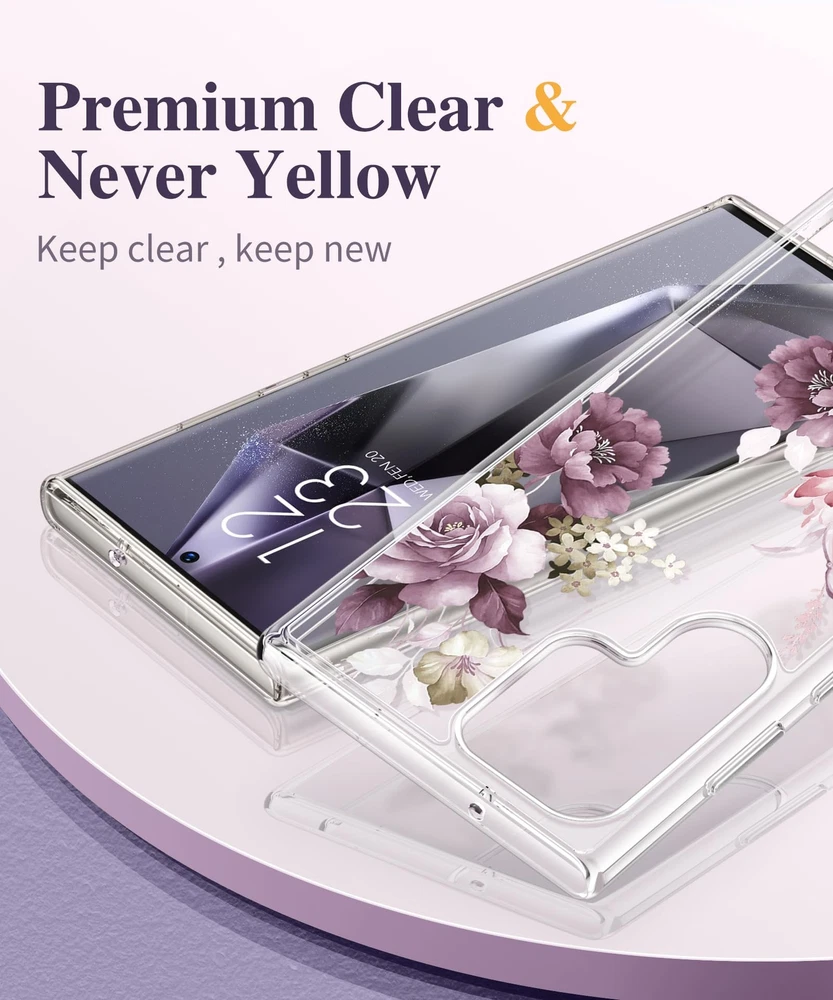 Compatibility- Ultimate Protective ONLY Compatible with Samsung Galaxy S24 Ultra Case 6.8 INCH 2024 Release. Elevate Your Style, Protect Your Device! MIL-Grade Protection & Raised Bezels Protection - Certified by military-grade drop protection standard, our compatible with Samsung S24 Ultra case can withstand drops of up to 10-foot without causing any damage. Reinforced corner bumper offers extra protection at every corner. Thoughtfully raised bezels around the screen and camera provide additional protection when laid on flat surfaces. It also comes with a screen and a camera protector. Feel confident, no matter where you go! Premium Material & Never Yellowing - This S24 Ultra case is made of high-quality PC and TPU materials. The hard PC back ensures robust protection, while the flexible TPU bumper provides a secure grip and shock absorption. Defy time with our non-yellowing formula. Revel in enduring transparency that keeps your phone looking as vibrant as the day you unboxed it. Flower Design & Precision Cutouts - Embrace elegance with our timeless floral print. Unleash your individuality while maintaining the phone's original aesthetic. Every cutout is meticulously crafted to match your device's buttons and curves. Enjoy unhindered access. blends seamless style with total device defense, achieving the perfect fusion of fashion and functionality. Satisfactory Service & Join Us - Our commitment to your satisfaction goes beyond the purchase. Experience peace of mind with our responsive after-sales service. We're here to address any concerns, ensuring your experience is nothing short of exceptional. Unlock the perfect fusion of style and protection with the Galaxy S24 Ultra cover set.