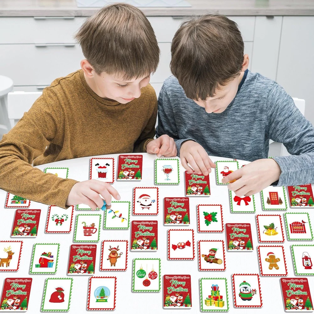 gisgfim 50 Pairs Memory Matching Game Merry Christmas Concentration Memory Games for Kids Educational Ages 3-8 A Fun & Fast Christmas Winter Theme Memory Matching Games Product Details 100 matching cards: This memory matching game set includes 100 cards featuring 50 cute Christmas themed pairs, all neatly packed in a durable and stylish storage box. With clear designs and vibrant colors, these cute winter pattern offers a fun way for your child to enhance their memory skills while enjoying hours of entertainment. Perfect for engaging learning and endless fun! High quality: Each merry Christmas concentration memory games measures approximately 6 x 8 cm (2 x 3 inches), features smooth surfaces with rounded edges, making them perfect for small hands. Crafted from thick cardboard, these cards are durable and resistant to bending or warping. They come in a sturdy, reusable box that allows for easy and compact storage. Printed on both sides with eco-friendly plant-based inks and coated with premium film, the cards can be easily cleaned with a damp cloth. Attractive matching game: This fun & fast memory game features a fun matching game cute Santa Claus, Christmas tree and snowman patterns. It sparks children's curiosity, enhances their attention, and boosts memory skills while they play. Plus, playing with a group can help improve their communication and expression skills! Educational matching card game: This educational matching card game is a fun game set that helps children stimulate their thinking in simple games and exercise children's memory, attention and hand-brain coordination. Wide application: This fun & fast Christmas theme memory matching games is designed for both kids and adults, making it easy to understand and fun for everyone. It offers a challenging and competitive experience whether you’re playing solo, with friends, or as a family. With its charming cartoon designs, this versatile game is perfect for family gatherings, game nights, or classroom activities. It delivers an inclusive and educational experience for players of all ages!