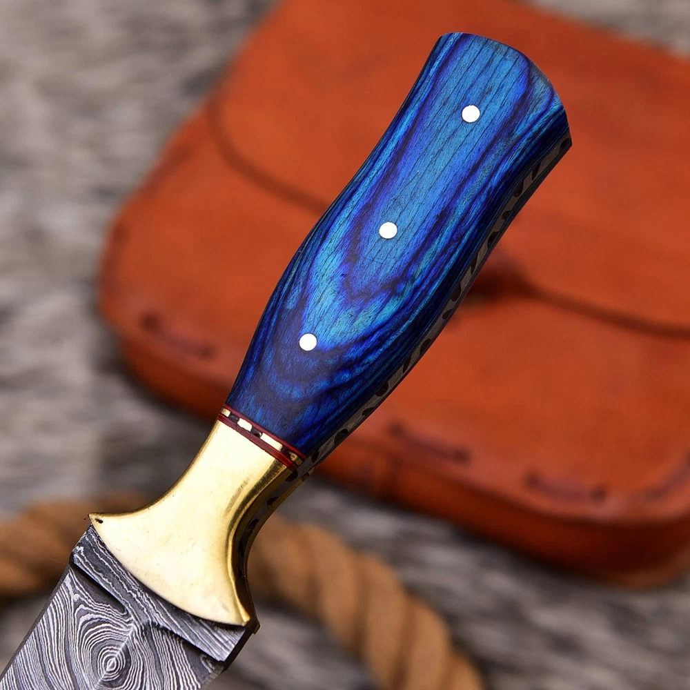 Introducing a beautifully crafted handmade double-edged dagger, perfect for combat, throwing, or even as a boot knife. The blade is made of high-quality Damascus steel, with a cutting edge that is sharp and precise. The handle is made of sturdy wood, providing a comfortable grip for both left and right-handed individuals. Overall length: 8.5” inch Blade : 4” inch Handle : 4.5” inch This dagger is a unique addition to any collection, with its blue color and original design. It is a one-of-a-kind piece, made in the United States and with a full tang for added strength and durability. Whether you're a collector or an enthusiast, this dagger is sure to impress.