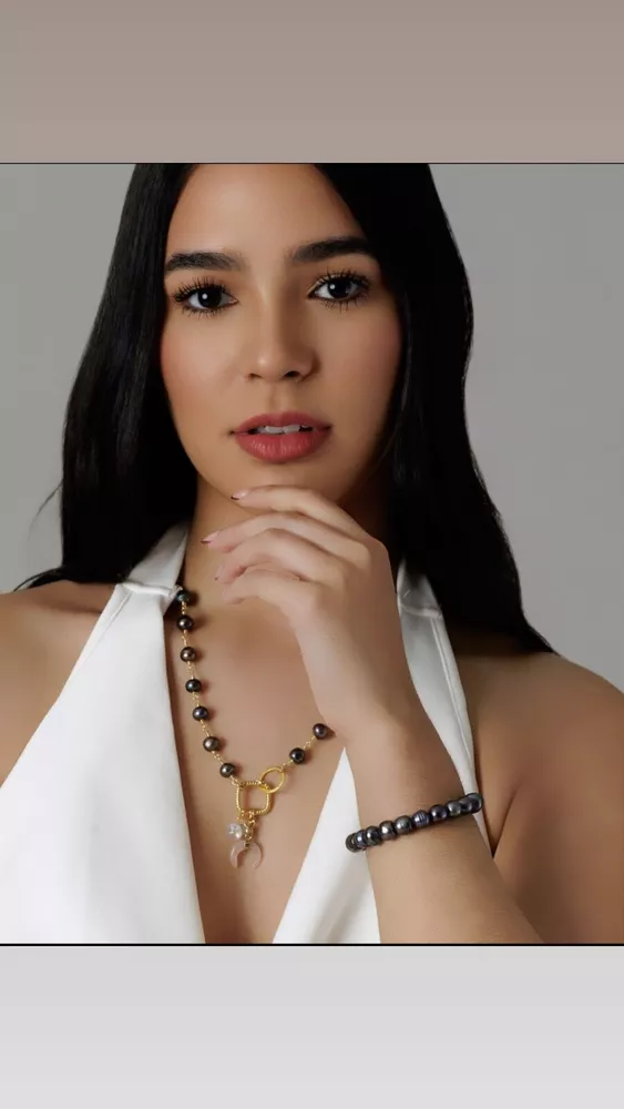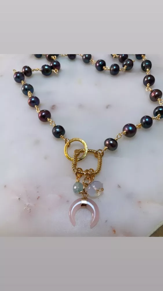 Handmade Black pearl necklace with rose quartz charm, handmade piece, unique piece.