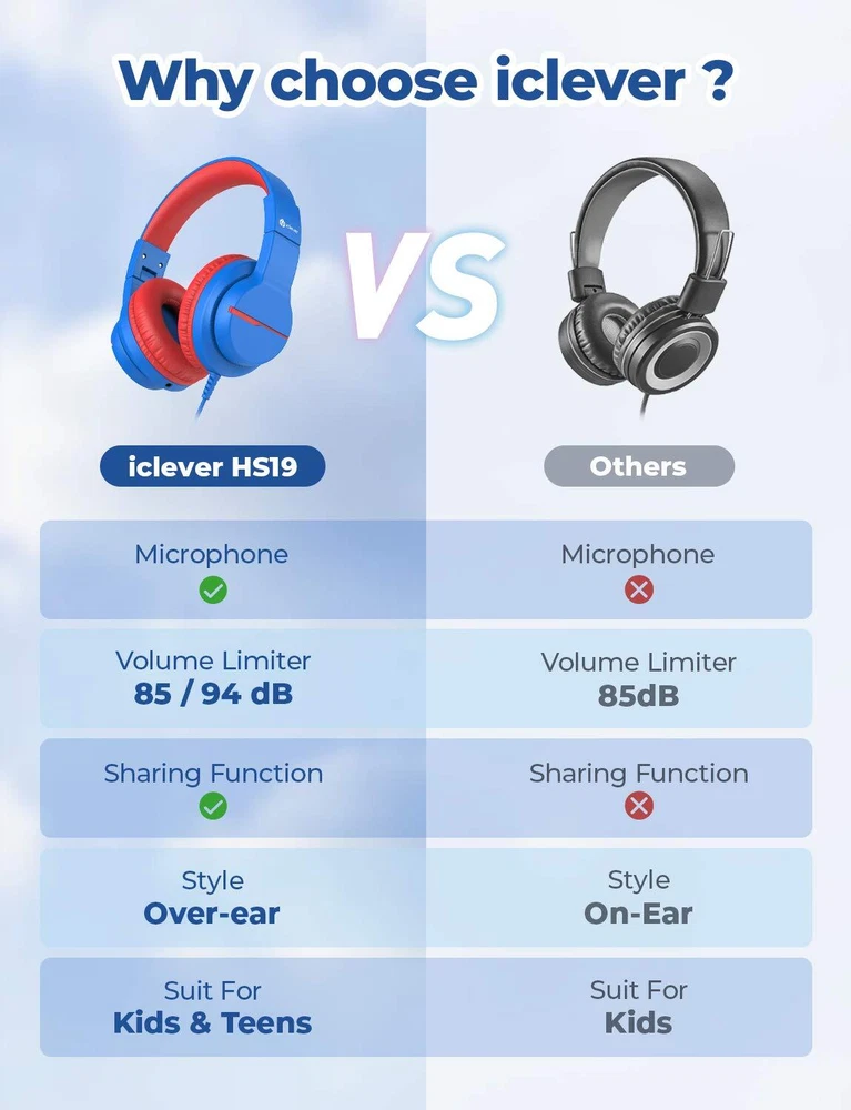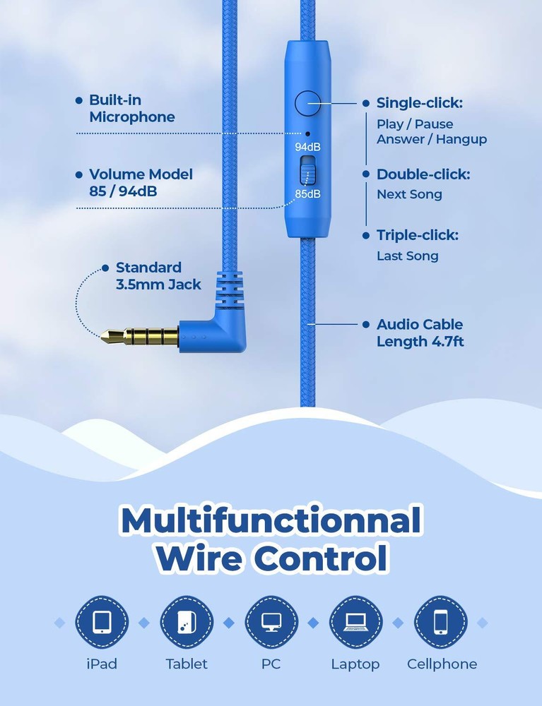 iClever Kids Headphones for School Travel, Safe Volume Limited, HD Mic Stereo So Features: 【Safe Volume Control】: Specially designed for children, the kids headphones can be limited to a sound level of 85dB to prevent damages to kid's ears in daily life. 【Built-in Microphone & Great Compatibility】: iClever wired headphones work with the In-line microphone making them perfect for Online Courses and Voice calls. These Over-Ear headphones support devices with 3.5mm audio jack like Chromebook, Kindle Fire Tablet, Switch, iPad, Laptop, PC etc. 【Stereo Sound & Share Port】 : With built-in 40mm drivers, our headphones emit a full balanced stereo sound, making them perfect for playing games and listening to music. Kids can insert another headphone plug into the sharing jack to share audio with friends or families, no splitters or special cables needed. 【Comfort Wear & Foldable Design】 : The ultra-soft earmuffs and over-ear design make better isolation from ambient noise and good breathability, thus your kids won't feel tired even for a long-time wear. kids headphones for travel are foldable and compact, convenient for carrying and storage. 【Generous Warranty】 : At iClever, we always put customers first, and we're proud to stand by the quality of our products. You are entitled to enjoy 24-hour Customer-friendly Support Service. Any questions please feel hassle-free to contact us. Features: 【Safe Volume Control】: Specially designed for children, the kids headphones can be limited to a sound level of 85dB to prevent damages to kid's ears in daily life. 【Built-in Microphone & Great Compatibility】: iClever wired headphones work with the In-line microphone making them perfect for Online Courses and Voice calls. These Over-Ear headphones support devices with 3.5mm audio jack like Chromebook, Kindle Fire Tablet, Switch, iPad, Laptop, PC etc. 【Stereo Sound & Share Port】 : With built-in 40mm drivers, our headphones emit a full balanced stereo sound, making them perfect for playing games and listening to music. Kids can insert another headphone plug into the sharing jack to share audio with friends or families, no splitters or special cables needed. 【Comfort Wear & Foldable Design】 : The ultra-soft earmuffs and over-ear design make better isolation from ambient noise and good breathability, thus your kids won't feel tired even for a long-time wear. kids headphones for travel are foldable and compact, convenient for carrying and storage. 【Generous Warranty】 : At iClever, we always put customers first, and we're proud to stand by the quality of our products. You are entitled to enjoy 24-hour Customer-friendly Support Service. Any questions please feel hassle-free to contact us. eBay integration by