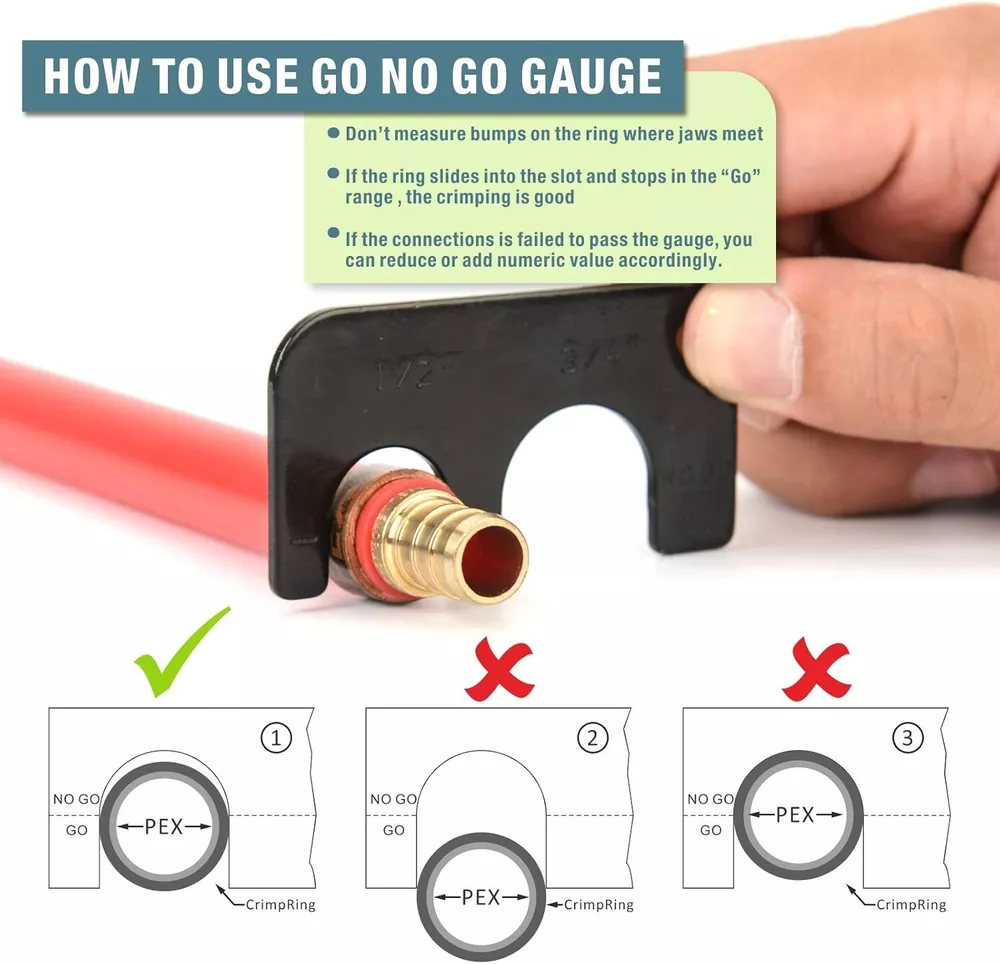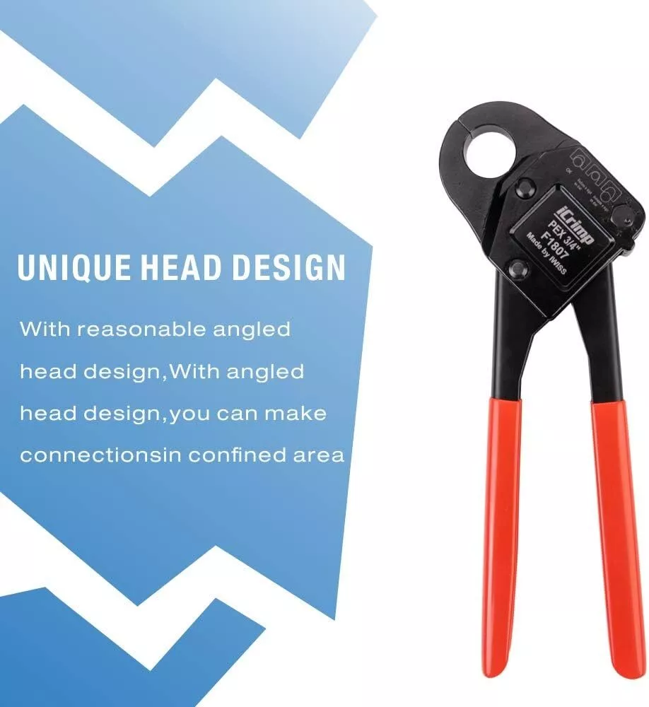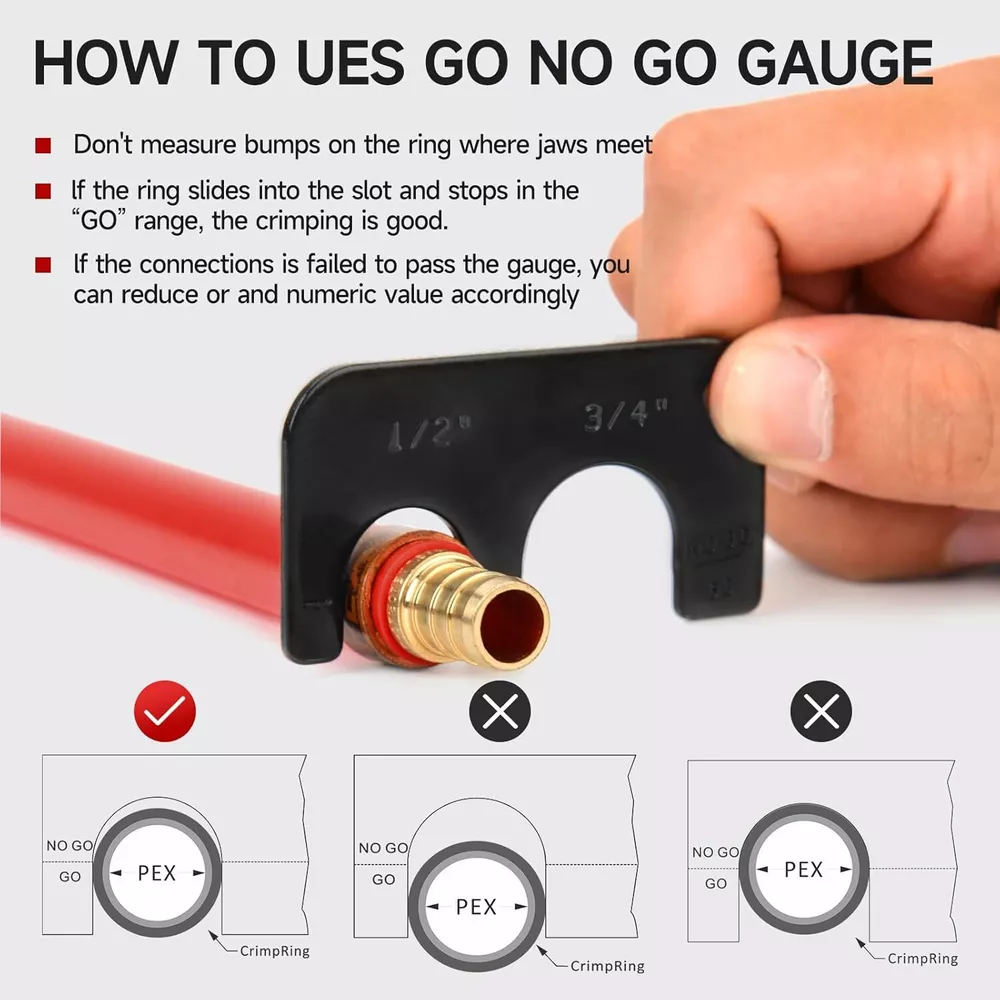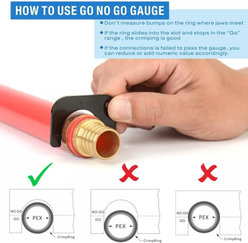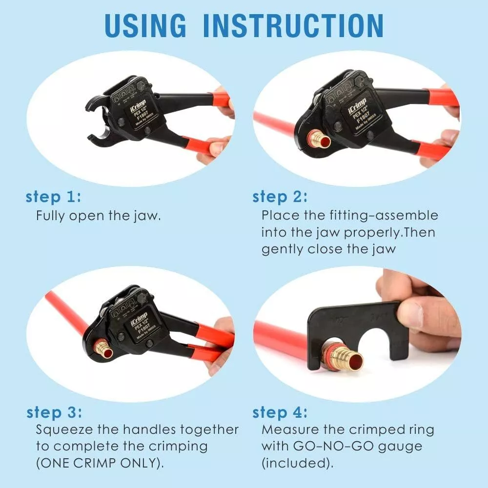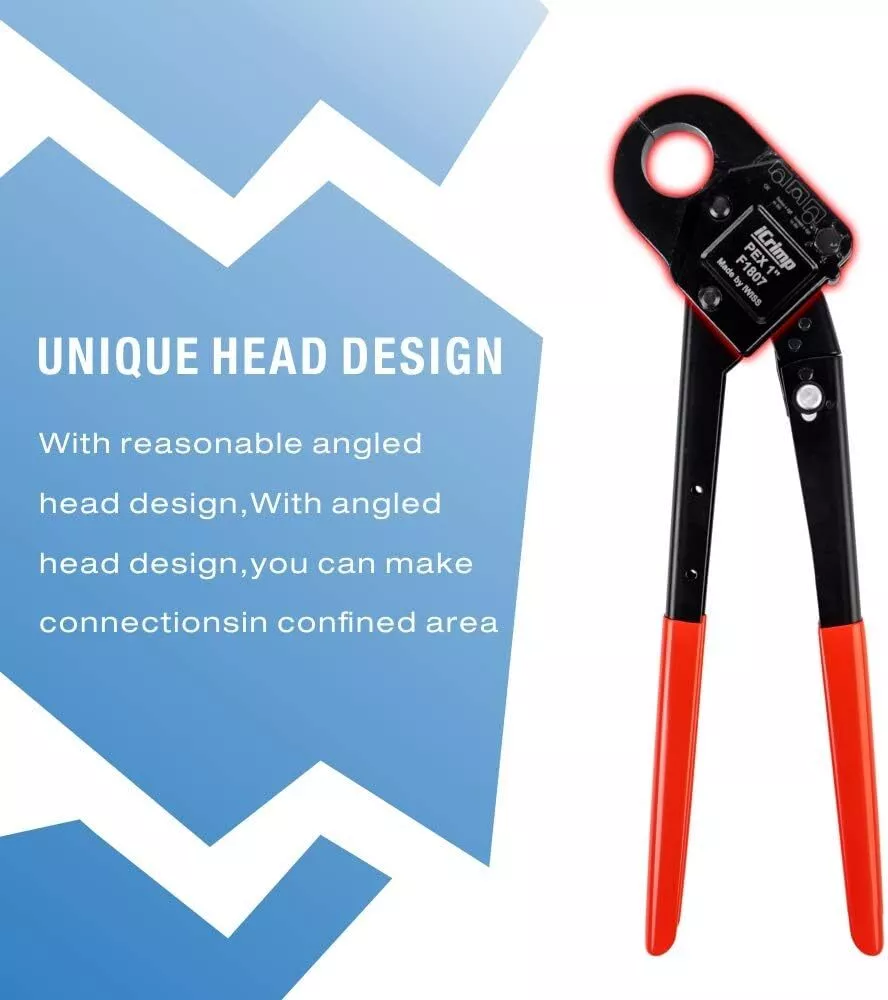 Product Description Previous page meets ASTM F1807 ANGLED PEX CRIMPER Constructed of durable carbon steel to ensure an integrated mechanical property Handy&Sturdy PEX CUTTER Spring-loaded handle brings smooth and clean cuts, like cutting butter Secure Connection GO/NO-GO GAUGE For the accuracy of the PEX crimper, ensure the fittngs and tubes has been crimped properly. Stronger Biting Force GROOVE JOINT PLIERS Pre-crimped copper ring to prevent slippingstronger, long time use without deformation Next page 1 ANGLED PEX CRIMPER 2 PEX CUTTER 3 GO/NO-GO GAUGE 4 GROOVE JOINT PLIERS WHY CHOOSE US UNIQUE ANGLED HEAD DESIGN permits good accessibility in confined space or at heights WELL POLISHED JAWS makes sure no burr and create leaking-free connection. CALIBRATION SUPPORTED factory-adjusted, only requires calibration if crimp fails to pass the gauge. SCIENTIFIC LOCATOR ensures no damage for copper rings during crimping.
