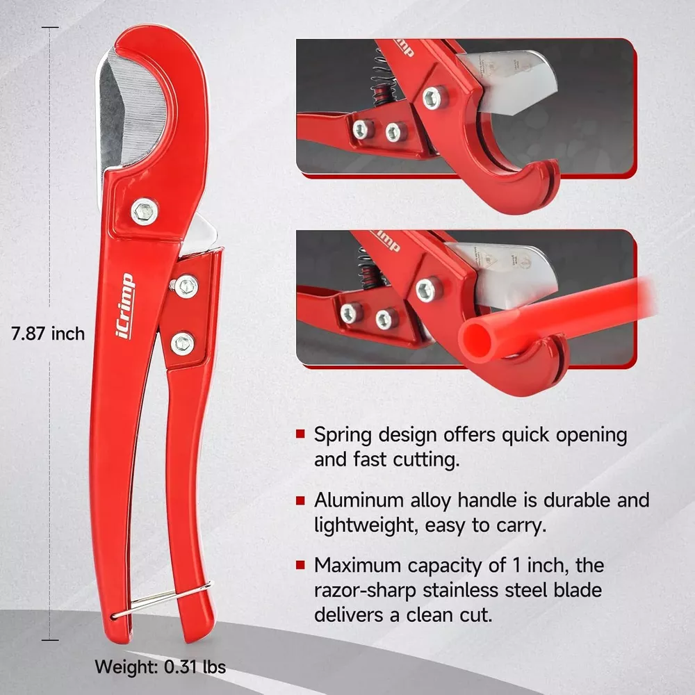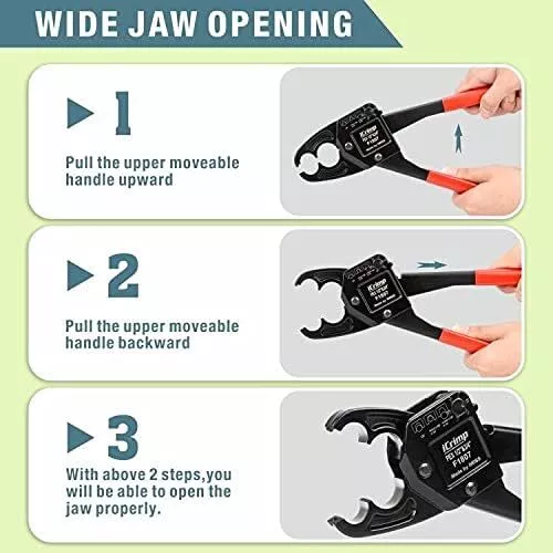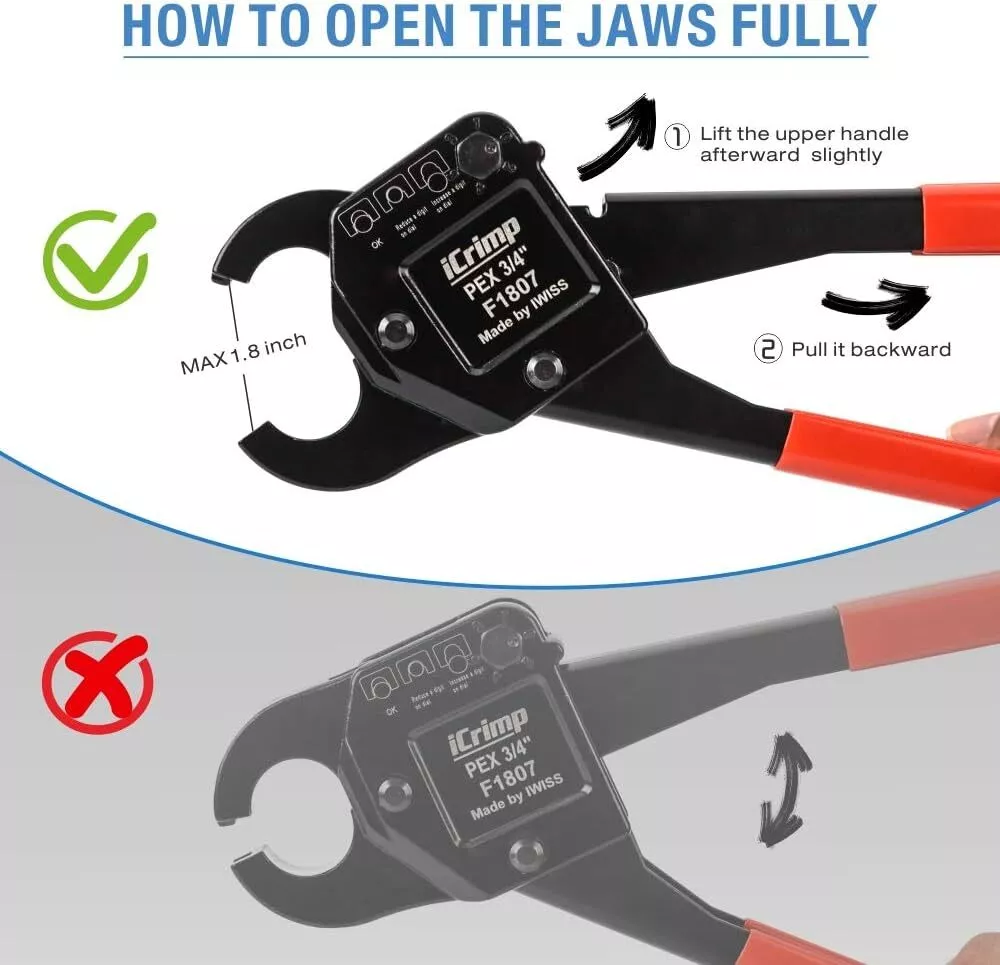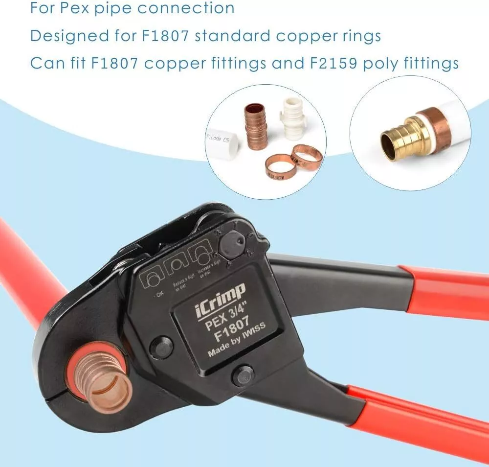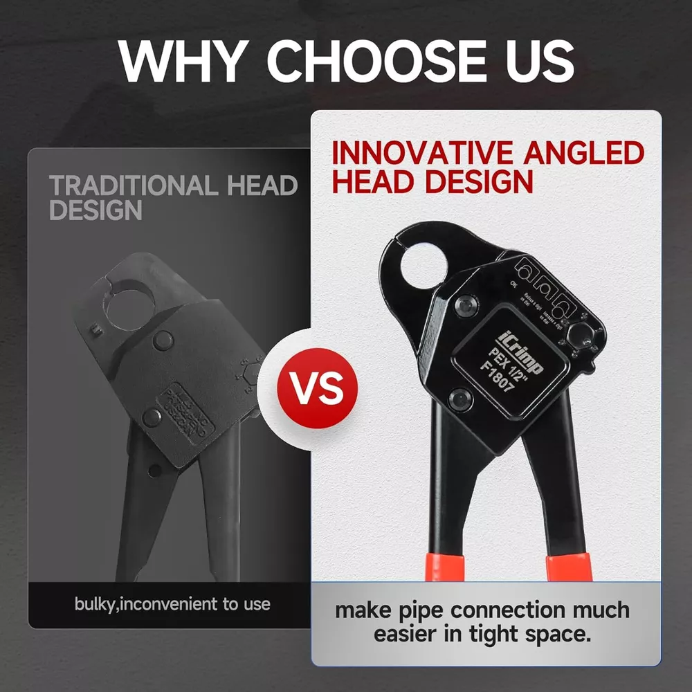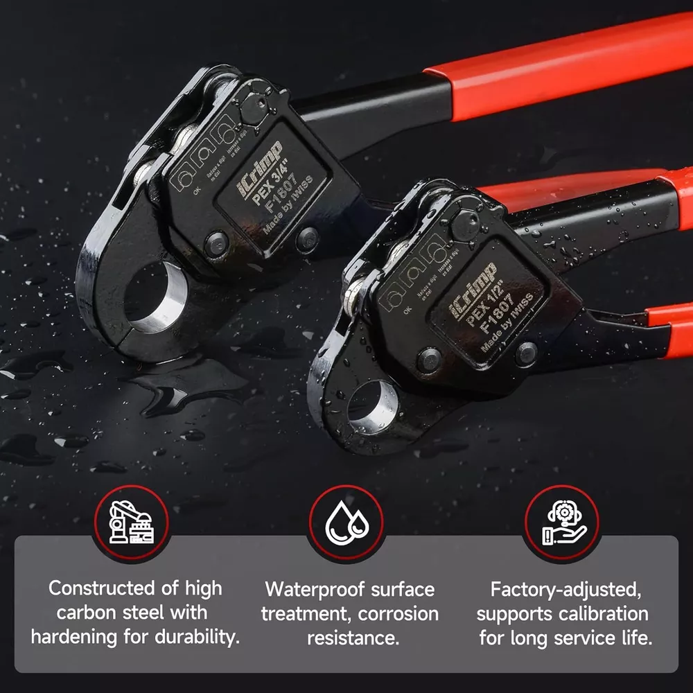 Product Description Previous page meets ASTM F1807 ANGLED PEX CRIMPER Constructed of durable carbon steel to ensure an integrated mechanical property Handy&Sturdy PEX CUTTER Spring-loaded handle brings smooth and clean cuts, like cutting butter Secure Connection GO/NO-GO GAUGE For the accuracy of the PEX crimper, ensure the fittngs and tubes has been crimped properly. Stronger Biting Force GROOVE JOINT PLIERS Pre-crimped copper ring to prevent slippingstronger, long time use without deformation Next page 1 ANGLED PEX CRIMPER 2 PEX CUTTER 3 GO/NO-GO GAUGE 4 GROOVE JOINT PLIERS WHY CHOOSE US UNIQUE ANGLED HEAD DESIGN permits good accessibility in confined space or at heights WELL POLISHED JAWS makes sure no burr and create leaking-free connection. CALIBRATION SUPPORTED factory-adjusted, only requires calibration if crimp fails to pass the gauge. SCIENTIFIC LOCATOR ensures no damage for copper rings during crimping.
