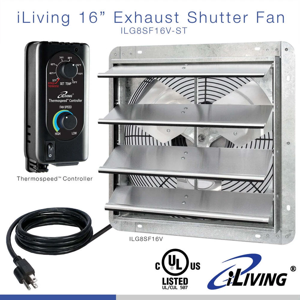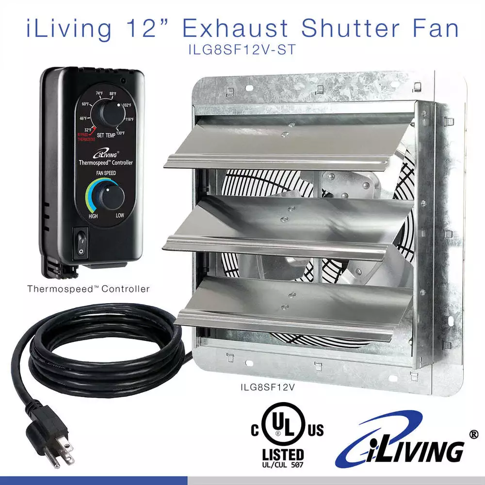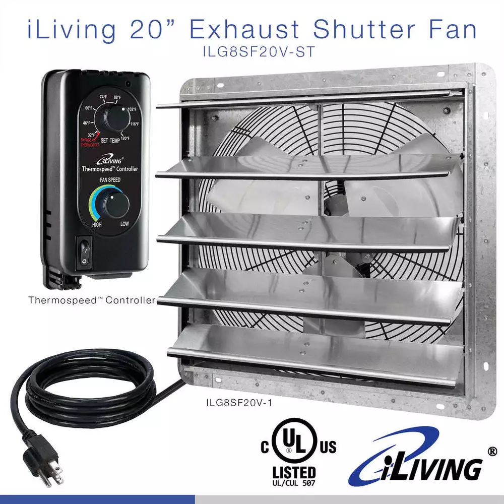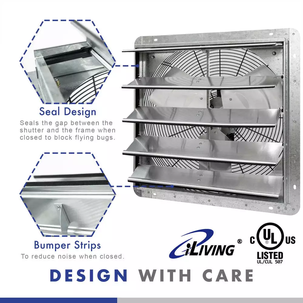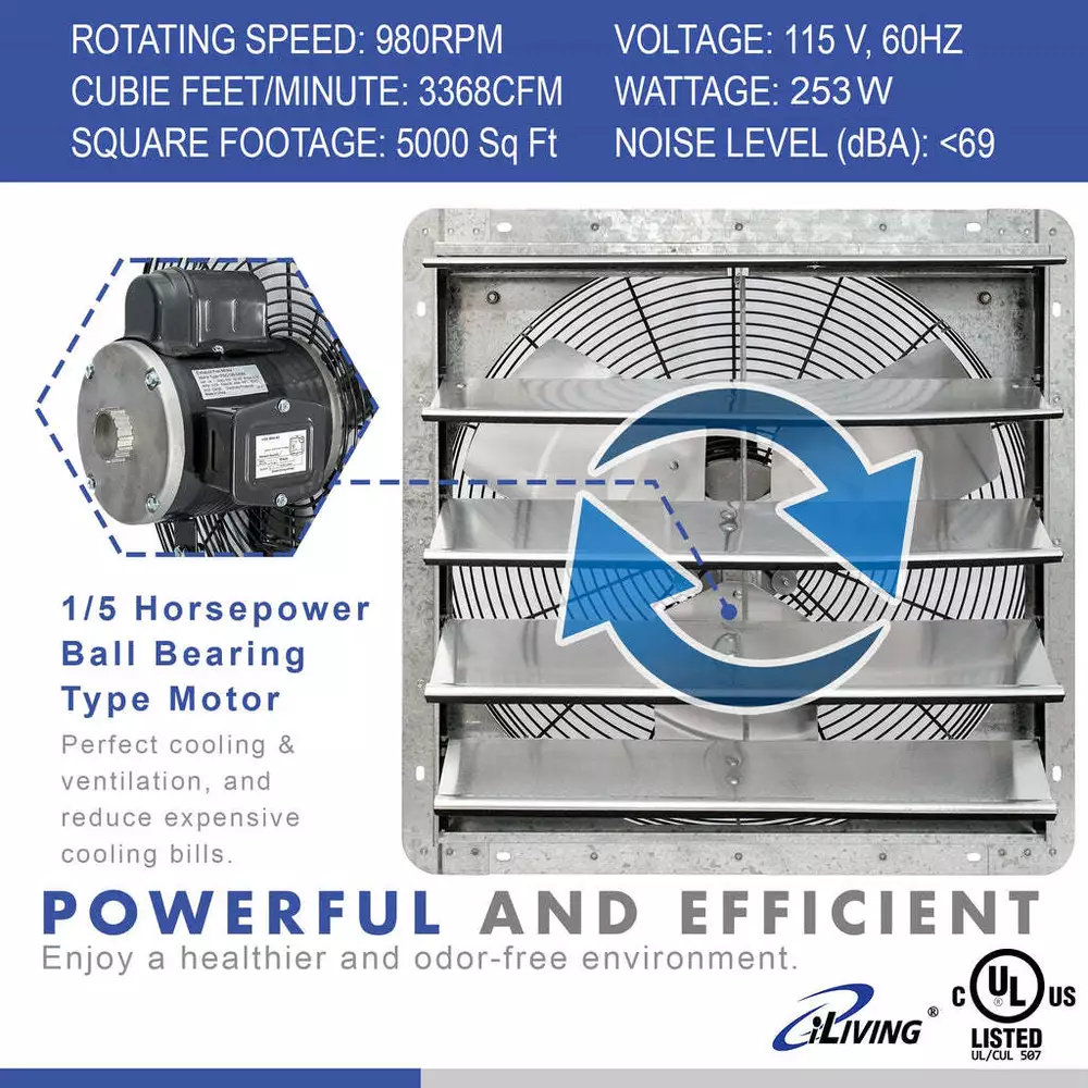 POWERFUL AIR VENTILATOR -Industrial ventilation fan with shutter. Variable Speed Shutter Exhaust Fan with automatic shutters SPEED AND THERMAL CONTROL - Variable speed and temperature regulation control, comes with Variable speeds and thermal control features of newest Thermospeed(TM) Controller ILG8SFST, temperature control range 32 - 130F BUILD TO LAST - Industrial grade galvanized steel frame with aluminum shutters and fan blades, reliable direct drive motor, Variable speed, UL certified, Noise Level < 69dB. Ideal for warehouse, garage, greenhouse, workshop exhaust and dust extraction. Corrosion-resistant with OSHA compliant wire guards. UL Listed with speed controllable, permanently lubricated motor EFFICIENT - Mounting type: Wall Mount CUSTOMER SUPPORT - Local customer support to address all questions and concerns. Product is UL/cUL Listed. The iLIVING Shutter Exhaust Fan is perfect for removing excess heat, moisture, and unpleasant odors from virtually any commercial location, including restaurants, factories, warehouses, barns, and greenhouses. This fan features aluminum blades, OSHA compliant wire guards, and automatic shutters that open and close in tandem with the operation of the fan. The completely enclosed motor is thermally protected and permanently lubricated. Equipped with the newest Thermospeed Controller which can easily control the temperature and speed. Auto cycle ON/OFF at your desired temperature. The fan comes fully assembled out of the box.