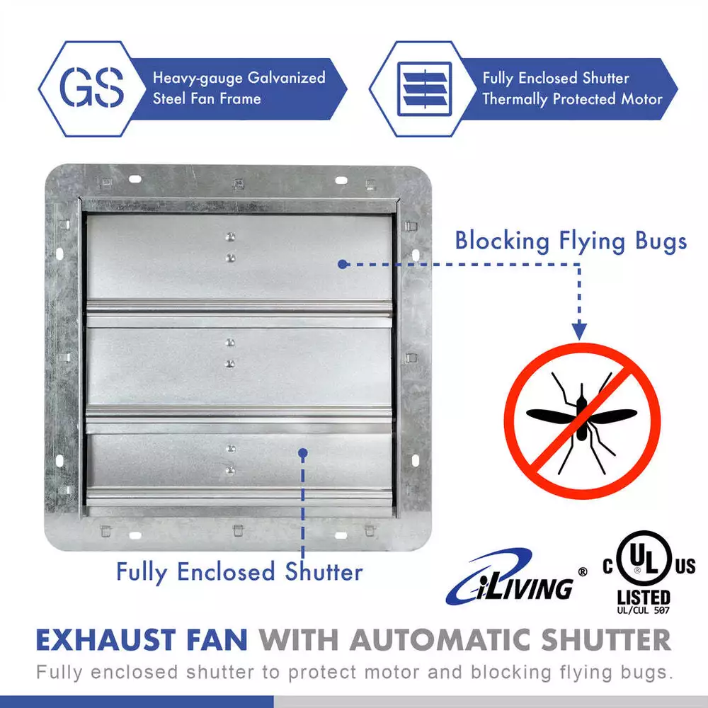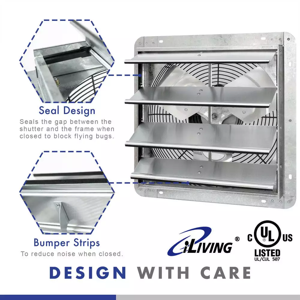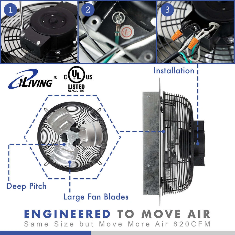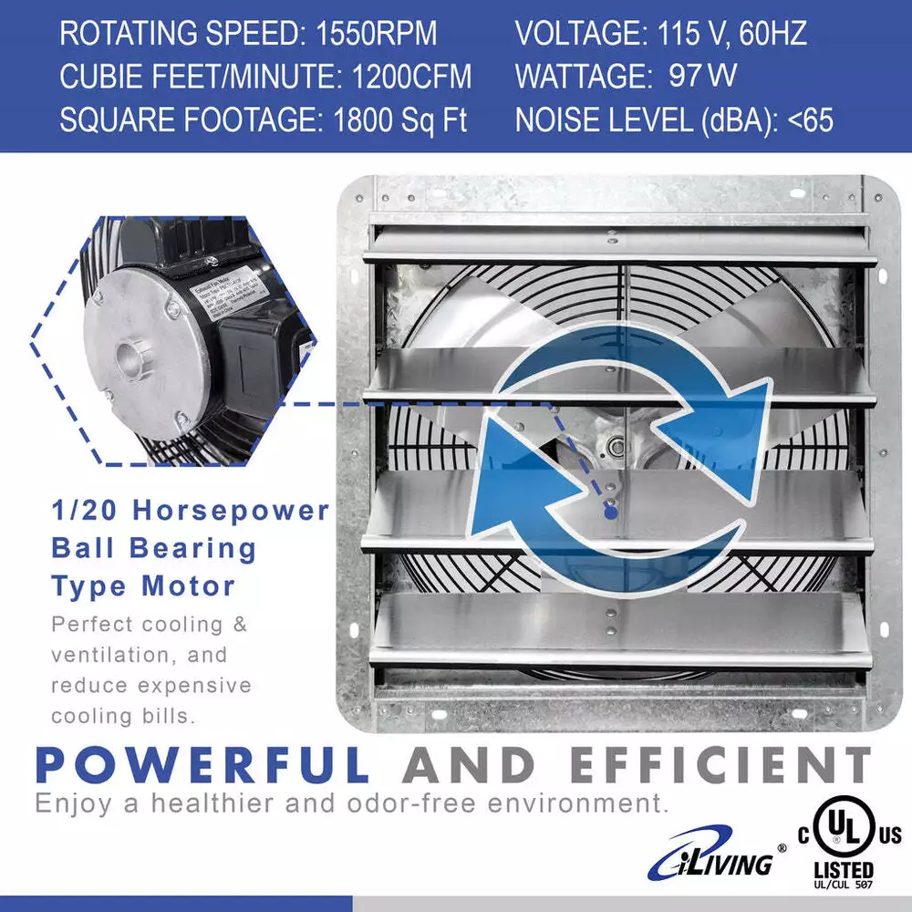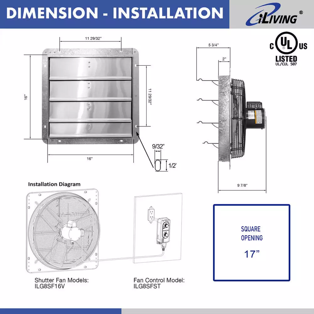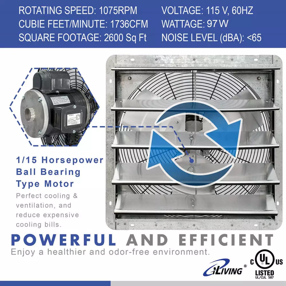 POWERFUL AIR VENTILATOR -Industrial ventilation fan with shutter. Variable Speed Shutter Exhaust Fan with automatic shutters SPEED AND THERMAL CONTROL - Variable speed and temperature regulation control, comes with Variable speeds and thermal control features of newest Thermospeed(TM) Controller ILG8SFST, temperature control range 32 - 130F BUILD TO LAST - Industrial grade galvanized steel frame with aluminum shutters and fan blades, reliable direct drive motor, Variable speed, UL certified, Noise Level < 69dB. Ideal for warehouse, garage, greenhouse, workshop exhaust and dust extraction. Corrosion-resistant with OSHA compliant wire guards. UL Listed with speed controllable, permanently lubricated motor EFFICIENT - Mounting type: Wall Mount CUSTOMER SUPPORT - Local customer support to address all questions and concerns. Product is UL/cUL Listed. The iLIVING Shutter Exhaust Fan is perfect for removing excess heat, moisture, and unpleasant odors from virtually any commercial location, including restaurants, factories, warehouses, barns, and greenhouses. This fan features aluminum blades, OSHA compliant wire guards, and automatic shutters that open and close in tandem with the operation of the fan. The completely enclosed motor is thermally protected and permanently lubricated. Equipped with the newest Thermospeed Controller which can easily control the temperature and speed. Auto cycle ON/OFF at your desired temperature. The fan comes fully assembled out of the box.