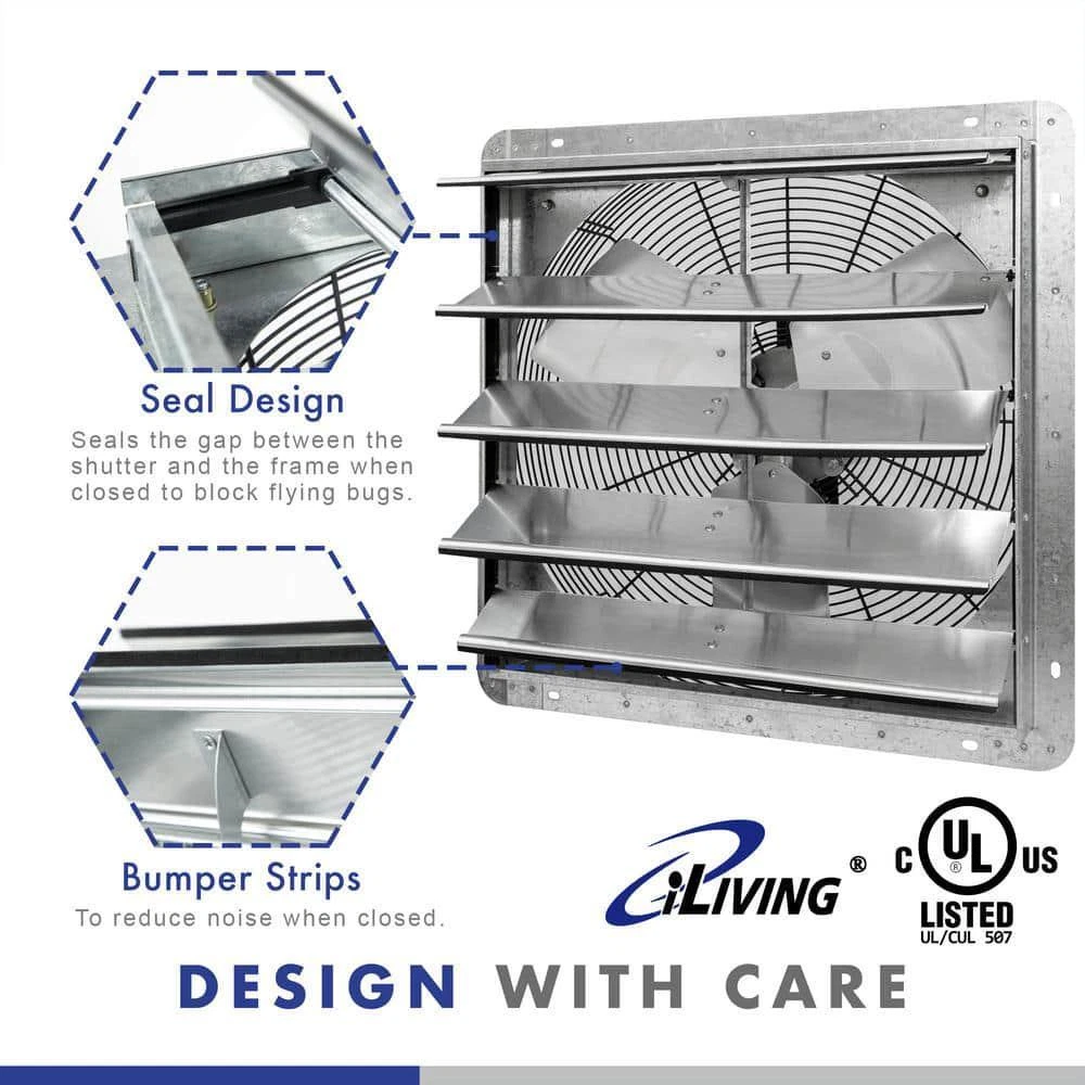 18 In. Wall Mounted Shutter Exhaust Fan, Automatic Shutter, With Thermostat And Variable Speed Controller, 1736 CFM Store New Arrivals Add to Saved Sellers View Feedback Contact 18 In. Wall Mounted Shutter Exhaust Fan, Automatic Shutter, With Thermostat And Variable Speed Controller, 1736 CFM High Airflow: 1736 CFM for effective ventilation in large areas Versatile Control: Variable speed and temperature adjustment Durable Design: Galvanized steel frame, aluminum shutters The iLIVING Shutter Exhaust Fan is perfect for removing excess heat, moisture, and unpleasant odors from virtually any commercial location, including restaurants, factories, warehouses, barns, and greenhouses. This fan features aluminum blades, OSHA compliant wire guards, and automatic shutters that open and close in tandem with the operation of the fan. The completely enclosed motor is thermally protected and permanently lubricated. Equipped with the newest Thermospeed Controller which can easily control the temperature and speed. Auto cycle ON/OFF at your desired temperature. The fan comes fully assembled out of the box. Airflow (CFM): 1736 Amperage (A): 0.85 A Color Family: Silver Color/Finish: Silver Drive Type: Direct Drive Features: Automatic Shutter,Corrosion Resistant,Speed Control,Thermostat Controlled,Weather Resistant Horsepower (hp): 1/15 hp Intake/Exhaust: Exhaust Material: Galvanized Steel Mounting Position: Gable Mount Power Type: Electric Powered Product Weight (lb.): 16.7 lb Recommended Sq. Ft.: 2600 Ventilation Type: Exhaust Voltage (V): 115 V Wattage (watts): 97 Manufacturer Warranty: 1-Year Limited Component Warranty Coverage Area (Sq.Ft): 2600 Cut-Out Diameter (in.): 19 Net-Free Area (Sq. In.): 18 Product Depth (in.): 5.75 in Product Height (in.): 21 in Product Width (in.): 21 in Rough Opening Height (in.): 19 in Rough Opening Width (in.): 19 in ABOUT US Customer service is our top priority! Please be sure to read the description thoroughly to make sure that this is the item you want before making a purchasing decision. If you have any questions about this item, please contact us via eBay messages before placing your order. We make every effort possible to accurately describe and depict the items. Please be aware that slight variations in color may be due to differences in lighting and computer monitor resolutions. All items are in stock at the time of listing; however, in the unlikely and unforeseen event that we are unable to fulfill your order through any of our networked warehouses, we will notify you as quickly as possible and offer you a 100% refund on your purchase. Thank you for shopping with us. We appreciate your business! SHIPPING We provide fast, free shipping. Most items are shipped within 3-5 business days of receiving cleared payment. We ship to the lower 48 contiguous United States only. We do not ship to P.O. Boxes or APOs. For select items, we ship internationally through eBays Global Shipping Program. We do ship most of our smaller items internationally using eBays Global Shipping Program. If ordering electrical items outside of the U.S., please note that they will come equipped with a standard U.S. voltage plugs. You will need a suitable adapter to use the item in your country. Certain restrictions apply. Standard or Economy Shipping is ALWAYS FREE! You will be notified via eBay messages as soon as your items ship. Special Notice for Freight Items: If an item ships via Freight (Truck) Delivery, a valid phone number will be required so that we can contact you to schedule delivery. The item may be delivered with curbside delivery. An adult signature will be required. Please be sure to have available help on hand to assist you with moving the item to the desired location in or outside of your home. Freight items must be inspected upon delivery. In the unlikely event that damage is observed, you MUST refuse delivery and note the damage on the shipping receipt and send it back via the Freight carrier. Returns will not be accepted on Freight items after they have been delivered, inspected, and the driver has left the premises. RETURNS When returning an item, it must be in all of the original packaging and include all of the original accessories or items that came with it. The item and package should be in original and perfect condition. You will be required to cover shipping on the return of non-defective items. All returns MUST be done within 30 days of date of purchase. Please note that we cannot give refunds or replacements after the 30 day limit has expired. When sending in a return, please note that it can take up to 7 business days for the return to be processed. We do our best to process as quickly as possible. We are extremely fair, and in the rare event of something out of the ordinary happening with our products or shipping, we will gladly work with you to find a fair resolution. PAYMENT We accept all of the standard payment options offered at eBay checkout. To provide a safe experience, eBay only allow payment methods that offer strong protection for buyers and sellers. Your order will be processed pending receipt of cleared payment. Sales tax may be charged depending on your location. DISCLAIMER We are sorry, but we do not honor product exchange requests. If you need to exchange an item received, you will need to go through the normal returns process identified in our returns section and then order the correct item, if it is still available. Orders are processed immediately and dispatched to fulfillment as soon as they are received. For this reason, we are typically unable to honor cancellation requests. If you need to cancel the transaction, please contact us as soon as possible and we will attempt to cancel the order. If the order has gone too far through the fulfillment process, we will be unable to cancel. In that event, you would need to wait until you receive the item and go through the normal returns process as mentioned in the returns section of our policies. Please