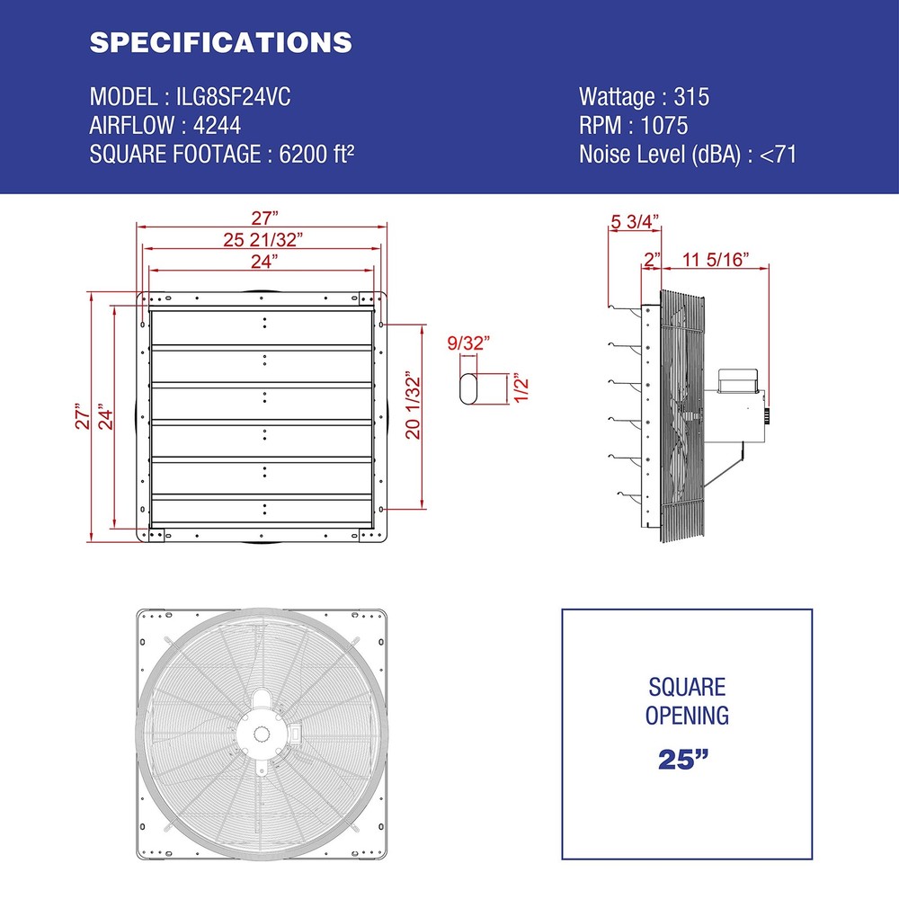 CUT COOLING COSTS: Reduce expensive cooling bills at home. Ready to install, our wall-mounted automatic shutter vent fan is designed to help to keep your living space cooler and more comfortable year-round. MULTIPURPOSE: Perfect cooling and ventilation solution for any space at your home - including the attic, garage, shed, and more. Corrosion resistant, the fully enclosed motor is thermally protected and permanently lubricated for easy maintenance. REMOTE CONTROL, VARIABLE SPEED SETTINGS: Customize your comfort with Digital Display remote controller. Control Speed, regulate temperature, and humidity using iLiving Exhaust Fan smart controller, ILG8SFRC speed controller. WEATHER RESISTANT SHUTTERS: Constructed from durable, high-grade aluminum, these shutters can withstand moisture and heat longer than other competitors’ products adding to the fan’s longevity. POWERFUL AND EFFICIENT: Small but mighty, you’ll enjoy the power and efficiency of iLiving’s Shutter Exhaust Fan. The 16 inch runs onstandard 120 volts at 1/4 HP, 2.75 amps with 1075 RPM, cooling and ventilating an area of 4244 cubic feet per minute!