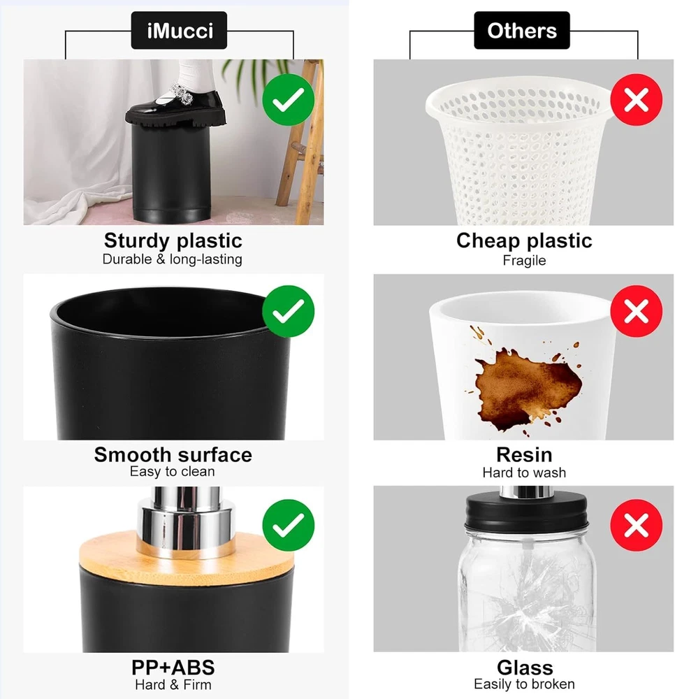iMucci Bathroom Accessories Set with Trash Can,Toothbrush Bath Set, Black Product Details Brand: iMucci Material: Plastic Color: Black Finish Type: IZ0124 Special Feature: Durable, Dust Proof, Easy to clean Package Information: Holder, Cup Age Range (Description): Adult Number of Items: 9 Number of Compartments: 1 Model Name: IZ0124WDBA Manufacturer: iMucci Package Dimensions: 11.85 x 8.03 x 7.72 inches Item Weight: 2.97 pounds Country of Origin: China Item model number: IZ0124 Fabric Type: Plastic Finish types: IZ0124 Number of pieces: 9 Batteries required: No Included Components: 1*toothbrush holder, 1*toothbrush cup, 1*lotion soap dispenser, 1*soap dish, 1*toilet brush,1*trash can,1*Vanity Tray,2*Qtip Plastic STURDY AND DURABLE PLASTIC - iMucci 8 pieces bathroom accessory set is known for its incredible strength and long-lasting.Whether you're looking for a kit that extreme Enduring or stylish, its lightweight nature and versatility make it the perfect choice for a wide range of your bathroom decor. MULTIFUNCTIONAL BATHROOM ACCESSORY SET - 8 pieces bathroom accessories set complete, including 1*toothbrush holder, 1*toothbrush cup, 1*soap dispenser, 1*soap dish, 1*toilet brush holder, 1*trash can, 2*Qtip holder. Makes the bathroom both well organized and adds a simple textured style. SOAP DISPENSER & TOOTHBRUSH HOLDER - Bathroom Lotion Dispensers really works great. No chance of breaking it because the top is a sturdy surface.Pump can be pressed by one hand and rebound automatically to press .Toothbrush holder fit most sizes of toothbrushes, toothpaste tubes, flossers, razors and more.Made of amazing bamboo wood and ABS material, durable and rust-proof. QTIP HOLDER & SOAP DISH - Bathroom Soap Dishes are an attractive way to organize items like Qtips, cotton balls,flossers, bath salts, hair bands or any other bathroom necessities and accessories. Drain design construction makes the soap durable for years of use. Classic soap tray matches a variety of bathroom decors TOILET BRUSH & TRASH CAN -The brush head can be extended to a deeper place to more effectively 360°clean the corners and crevices of the toilet. MULTIPURPOSE: Bathroom kit perfect for bathroom decors, , dorm, hotel, apartment, laundry room, basement, RV, etc.Perfect for wedding,housewarming/new home gift,birthday gift, mother’s day gift , valentine’s day gift,thanksgiving gift,Christmas gift,bridal or baby shower gifts,friend, sister, co-worker or just about anyone to use all year round.