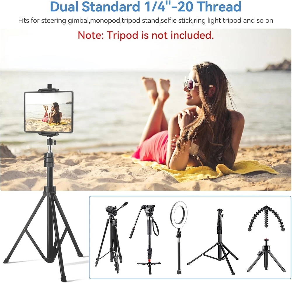 iPad and Phone Tripod Mount Adapter with Ball Head iPad Holder for Tripod 360 Color: Black Compatible Devices: For iPad 1 2 3 4 5 6 7 8 9, iPad Mini 1 2 3 4 5 6, iPad Air 1 2 3 4, iPad Pro 12.9" 11" 10.5" 9.7" Mounting Type: ['Tripod Mount', 'Clamp'] The upgraded iPad tripod mount adapter is built-in reinforcing rib in the middle of the base. Powerful spring-loaded arms and large jaws combined to make sure your device being held steadily. Moreover, the iPad clamp mount base and jaws are covered with non-slip pads to protect your device from scratches and slips, reducing the risk of its falling. KDD tablet tripod mount has the 5.3-10.6” width opening, which fits different size screen cell phones and tablets, such as iPad 1 2 3 4 5 6 7 8 9, iPad Mini 1 2 3 4 5 6, iPad Air 1 2 3 4, iPad Pro 12.9" 11" 10.5" 9.7", iPhone 15/15pro/15pro max,14/14pro/14pro max, 13/13pro/13pro max, 12/12 Pro/12 Pro, 11/11 Pro/11 Pro Max, X/XS/XR/XS Max, Galaxy tab, Surface Pro, Nexus etc. Equipped with 2 standard 1/4" screw holes on the bottom and back of base, this iPad holder for tripod supports mounting tablet to steering gimbal, tripod stand, selfie stick, ring light tripod or any devices with standard 1/4"-20 thread. Perfect for video recording, selfie, remote teaching, online courses, live music shoot, Zoom meeting, watching movies and more. This ipad mount for tripod comes with a high-quality & durable swivel metal ball head, allowing you rotate or adjust the angle of the tablet between portrait and horizontal orientations to meet your needs at different angles. PS: It does not include a tripod stand. The ipad holder stand, based on a stretchable spring design, has a locking knob for easy width adjustment to fit different sized devices. Jaws on both sides have reserved charging space which make it easier for tablet charging. Return Policy: We offer a 30 day return policy from the receiving date. Please contact us for a Free Return Label. Please use our return label so it will go back to our supplier and we can do a refund or replacement afterwards. Feedback: Your satisfaction is very important to us! If you have any problem with your order, please contact us and we will do our very best to make you satisfied. As long as you are happy with your purchase, please leave a positive feedback for us. We will always leave you a positive feedback in return. If you have any problem with your purchase, please do not leave a negative feedback. Please Contact us ... and your issue will be solved quickly and positively We are a small family-owned business trying to make a living, not a huge company that does not care ... We will ALWAYS do our best for you!