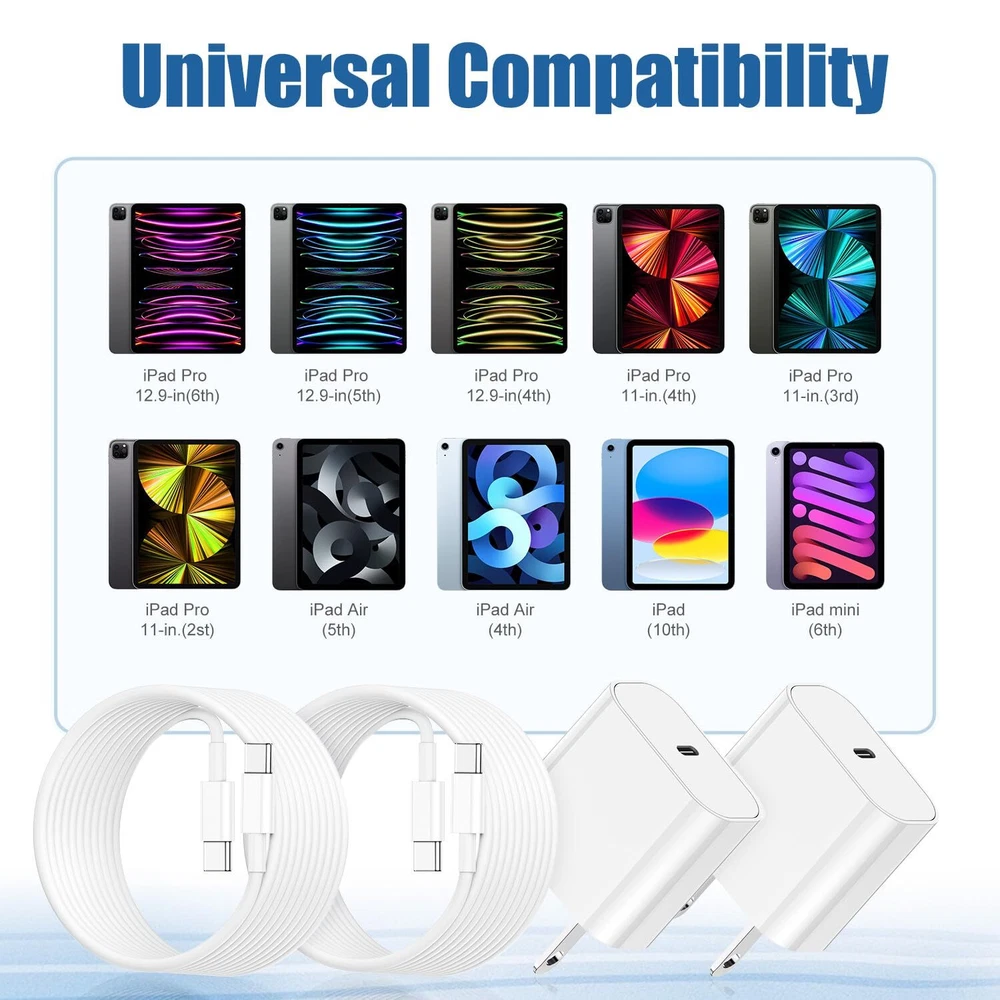 iPhone 15 Fast Charger/10ft Type C to C Cable Cord Long, USB C Charging Block/iPad Pro Wall Plug Power Adapter Cube Brick for Apple iPhone 15 Plus/15 Pro Max/12.9/11 inch/Air/Mini/4/5th/6 Generation Apple ipad Charger Compatible with USB C Devices: For Apple iPhone 15/15 Pro Max/15 Plus/15 Pro, 2022 iPad 10.9'' (10rd Gen)- Model A2696, A2757, A2777; -2021 iPad Pro 12.9'' (5th Gen) - Model A2378, A2461, A2379; -2020 iPad Pro 12.9'' (4th Gen) - Model A2229, A2069, A2232; -2018 iPad Pro 12.9'' (3rd Gen) - Model A1876, A2014, A1895; -2021 iPad Pro 11'' - Model A2377, A2459, A2301; -2020 iPad Pro 11'' - Model A2228, A2068, A2230; -2018 iPad Pro 11'' - Model A1980, A2013, A1934; -2020 iPad Air 4 10.9'' - Model A2316, A2324, A2325, A2072; -2022 iPad Air 5 10.9'' - Model A2589, A2591; -2021 iPad Mini 6 - Model A2567, A2568 【2Pack 20W Super Fast Charger】: 20W power delivery USB-C fast charger kit, 3 times faster than standard USB chargers. Charge iPad Pro up to 60% in just 30 minutes. Charging current up to 3A, save your time. Our charger support multiple fast charging technologies, PD 3.0, PPS, and QC 4.0. It provides super-fast charging for 2022/2021/2020/2018 iPad Pro 12.9/11/10.9 inch 5/4/3/2/1th Generation,iPad Air 5/4th,iPad Mini 6 Gen. 【Certified and Safety】:With the Apple MFi Certified chip, iPad fast charger automatic recognition the max current required by your devices. Multiple safety protections protect your ipad from over-current, over-voltage, over-heating and short-circuit, ensure the charging process is stable, safe, and efficient. 【Extra Long 60W USB C Charger Cable】: With 2Pack 10 Feet Type C to Type C ipad charger cord, long charging distance, fast charging. Built-in smart chip, no warning message will pop up, ensures that your USB C devices are loaded and charge safely and faster at maximum speed, latest-generation, future-proof fast charging technology, no error message pops up and works perfectly with your device while charging fast. 10FT Extra Long cable can give you more space to move while charging. 【Wide Compatible Devices】: Fast charging for most USB-C Devices, including for Apple iPhone 15/15 Pro Max/15 Plus/15 Pro, 2022 New iPad Air 5th, iPad Pro 12.9 in 5th/4th/3rd Generation(2021/2020/2018), iPad Pro 11 in 3rd/2nd/1st Generation(2021/2020/2018), iPad Air 4th Generation(2020), iPad Mini 6 Generation(2021), iPad 10rd Generation(2022), Note:Pls comfirm your ipad is usb c connector before purchase. Samsung Galaxy S23/S22/S22 Ultra/S22 Plus/S21/S21+/S10/S9,Note 20/10,LG and any other usb-c enabled devices. 【What You Get】You will get 2Pack 20W PD 3.0 Applicable Apple Charger Plug and 10 FT USB C to USB C Cable, 1-Years worry-free refund and replacement guarantee. if you have any questions, please feel free to contact us, we have confidence in our products and we are responsible to our customers,We promise to solve your problems within 24 Hours.(Contact method: "Account service" → "Order history" → "Contact seller") Shipping from the USA All of our products are shipped from the USA, ensuring quick delivery to your destination. Payment We offer the following payment methods: PayPal, credit card, bank transfer, and eBay's secure payment system. Free Shipping & Free Returns Shipping within the USA is FREE. Additionally, any return is absolutely free for you. Risk-Free Purchase You have the option to return an item within 30 days without any justification. We cover the return shipping costs! Fast Shipping We ship immediately upon receipt of payment. Generally, the package is delivered within 2-3 days in the USA. If it takes longer, we will contact you. Quality and Costs Made in Europe, USA, China No customs fees or additional charges Total satisfaction guarantee Invoice with declared VAT available upon request in .pdf format Feedback Your feedback is very important to us. After you pay for your purchase, you will automatically receive positive feedback from us.