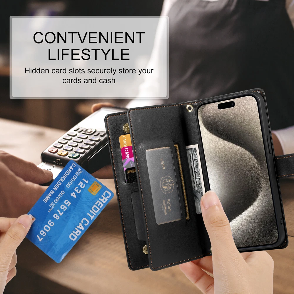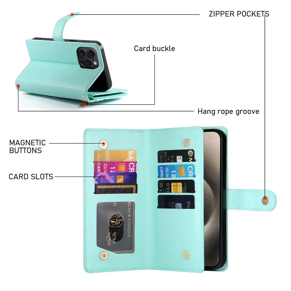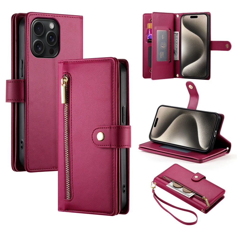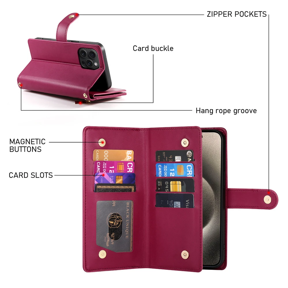Fr iPhone 16 Pro Max 15 14 13 12 11 Leather Wallet Zipper Case with 9 Card Slots Key Features: Convenience: Built in kickstand for hands free viewing. Includes a premium leather wrist strap for easy carrying. Timeless Style: Crafted in a classic, sleek design ideal for daily use and travel. Thin yet secure, with precise cutouts for ports and responsive button covers. Premium Material: Made from high grade TPU and PU leather to prevent scratches and ensure durability. Comprehensive Protection: Provides full coverage to safeguard your phone from drops and shocks, including camera and screen protection. Multifunctional Design: Includes 9 card slots, and 1 wallet compartment. Features a detachable zippered coin purse and matching wrist strap.