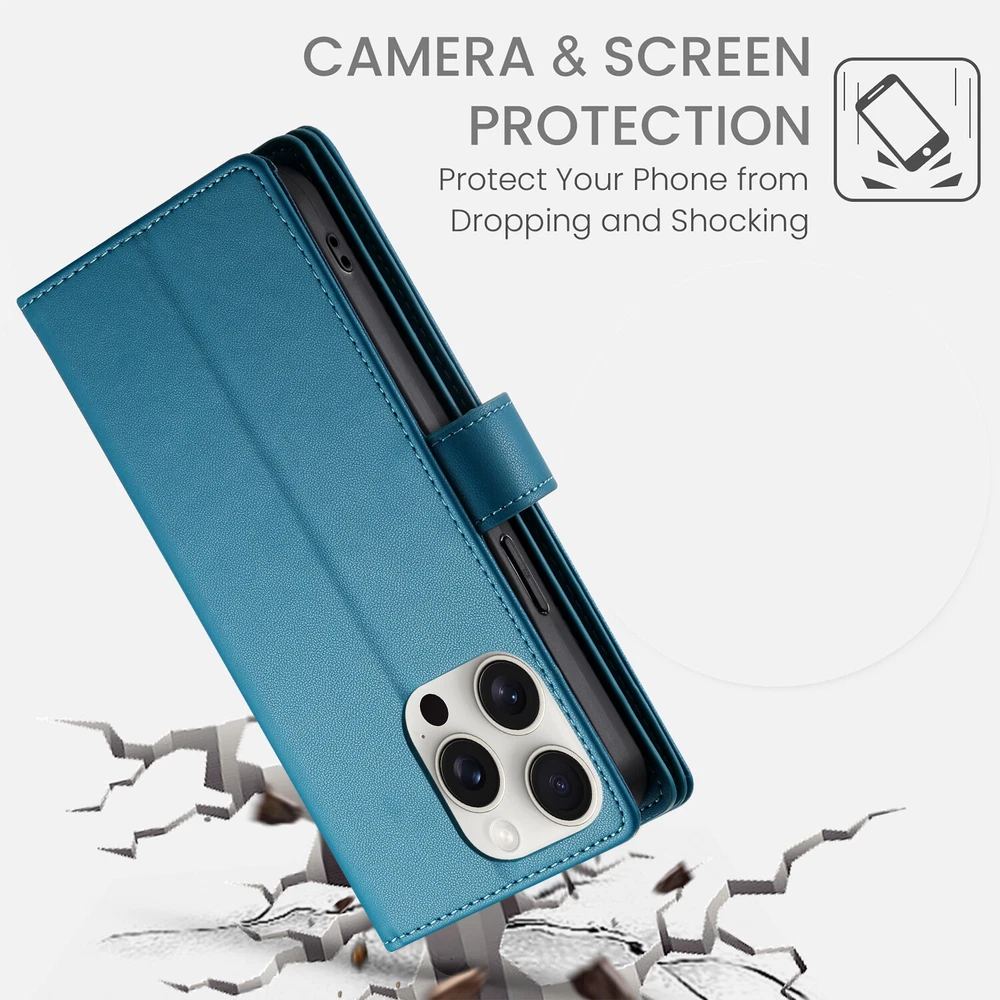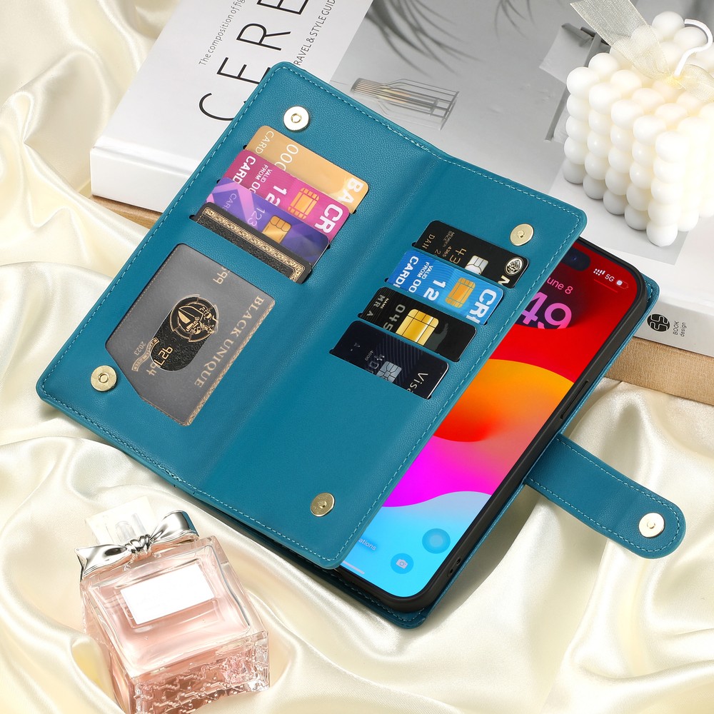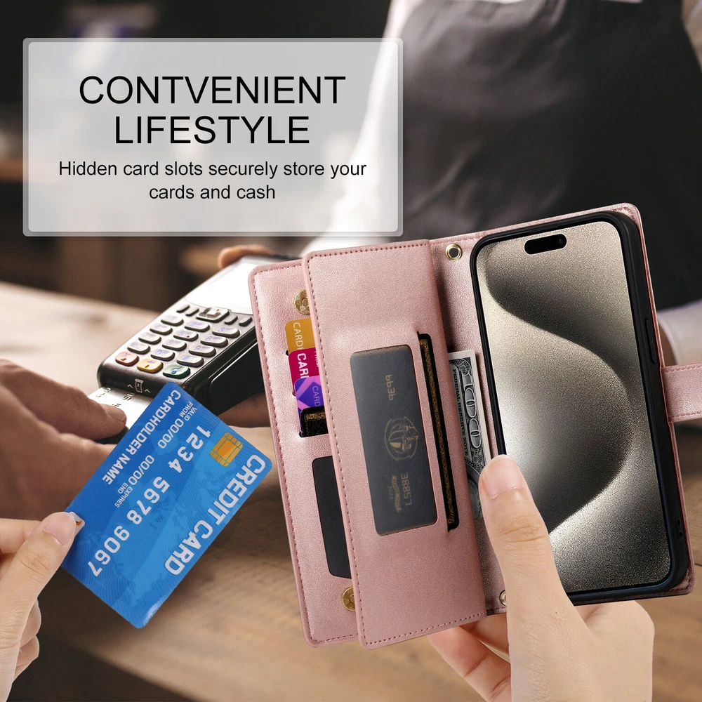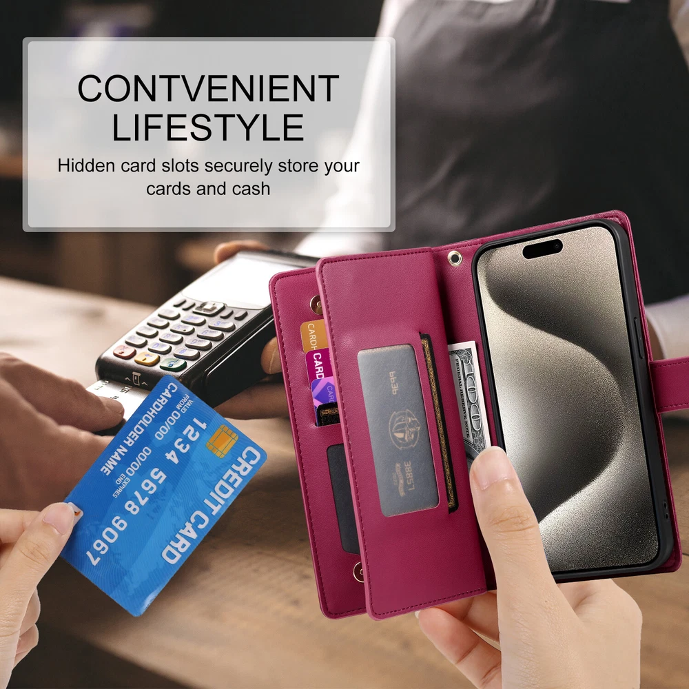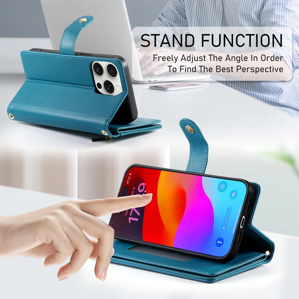Fr iPhone 16 Pro Max 15 14 13 12 11 Leather Wallet Zipper Case with 9 Card Slots Key Features: Convenience: Built in kickstand for hands free viewing. Includes a premium leather wrist strap for easy carrying. Timeless Style: Crafted in a classic, sleek design ideal for daily use and travel. Thin yet secure, with precise cutouts for ports and responsive button covers. Premium Material: Made from high grade TPU and PU leather to prevent scratches and ensure durability. Comprehensive Protection: Provides full coverage to safeguard your phone from drops and shocks, including camera and screen protection. Multifunctional Design: Includes 9 card slots, and 1 wallet compartment. Features a detachable zippered coin purse and matching wrist strap.