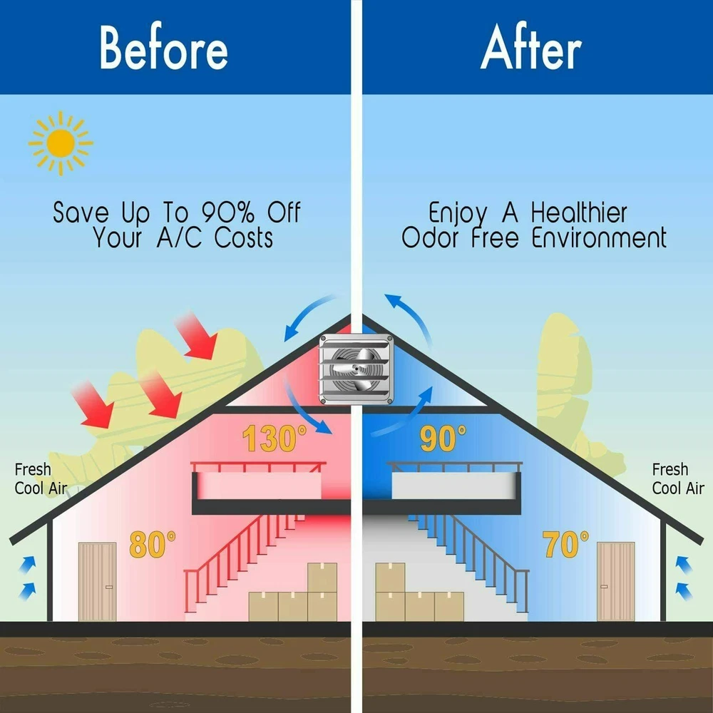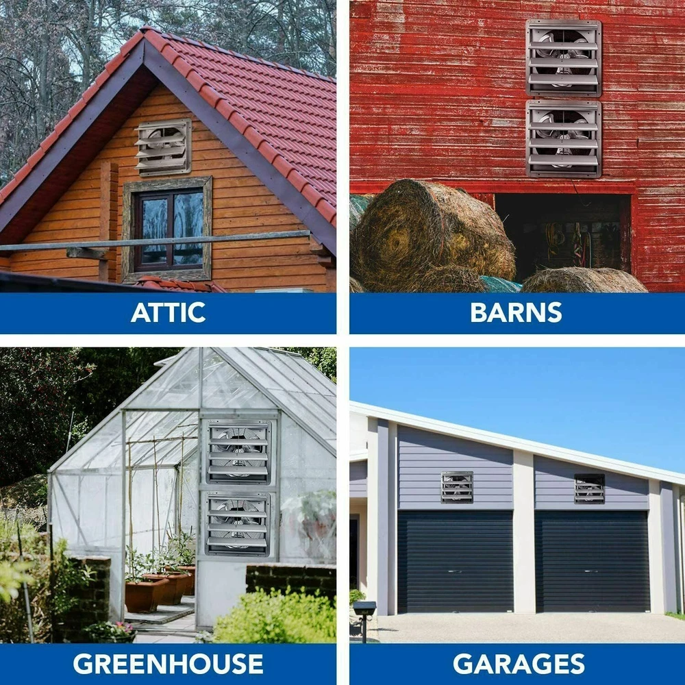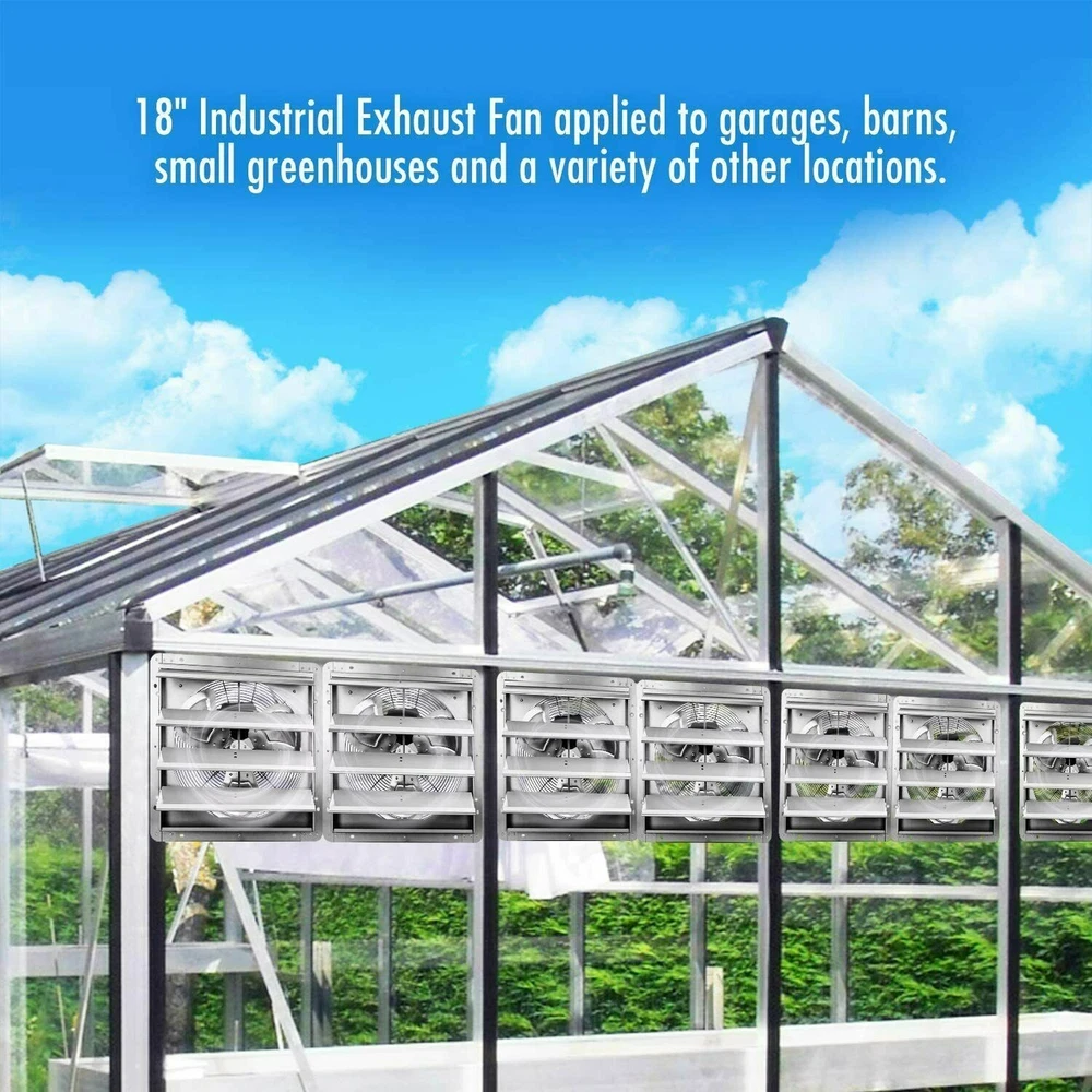 iPower Shutter Exhaust Fan iPower Shutter Exhaust Fan is perfect for removing excess heat, moisture, dust and odors from virtually any residential or commercial space. Applications include: workshops, welding rooms, factories, warehouses, barns, and greenhouses.This wall mounted exhaust fan includes automatic gravity shutters that open and close in conjunction with the operation of the fan. The completely enclosed motor is thermally protected and permanently lubricated.This fan comes fully assembled and ready to install out of the box. Rotating Speed:1450 RPM Air volume:2000 CFM Watts : 110W Voltage: 115V/60Hz Product Detail Automatic Gravity Shutters Safety Grille and Large Fan Blade Bare Leads For Custom Application Application Sheds Barn Greenhouse iPower 18 Inch Wall Mounted Shutter Exhaust Fan, Aluminum, 1400 RPM, 2000 CFM, for Attic, Garage, Louvered Vent, Plant, Greenhouse, Silver Product description The power shutter exhaust fan is perfect for removing excess heat moisture and unpleasant odors from virtually any commercial location including restaurants factories warehouses barns and greenhouses This fan features aluminium blades automatic shutters that open and close in tandem with the operation of the fan The completely enclosed motor is thermally protected and permanently lubricated The fan comes fully assembled out of the box only installation required is the electrical hardwire. Features APPLICATIONS: This 18 inch shutter/exhaust fan with automatic Shutters can help replace your ac unit by cooling your garage, attic, greenhouse shop or chicken coop. INSTALLATION: Can easily be added to a window opening or opening in the wall along with a thermostat to optimize cooling. COOLIN AND GVENTILATION: This industrial grade shutter fan can solve all of your cooling and ventilation needs. RUST PROOF ALUMINUM SHUTTERS: This shutter fan is made with corrosion resistant aluminum shutters and blades. This provides longevity to the fan and will prevent any rust from forming. 115 Volts, 110W, 0. 52A, 1450RPM, 2000CFM. Package Include 1-Pack iPower 18 Inch Shutter Exhaust Fan iPower 20 Inch Wall Mounted Shutter Exhaust Fan, Aluminum, 1200 RPM, 3368 CFM, for Attic, Garage, Louvered Vent, Plant, Greenhouse, Silver About this item [SPECIFICATION] Fan: 20 Inch, 1200 RPM, 3368 CFM, 120V, 60HZ, 125W, Aluminum louvers and blades, Steel frame [HIGH QUALITY] This louvered fan features corrosion-resistant aluminum louvers and blades. This extends the life of the fan and prevents rust. [STRONG PROTECTION]Automatic shutters are open when the fan is running, and close automatically due to gravity when the fan stops running, preventing mosquitoes and dust from entering the room [EASY TO INSTALL] The fan will be delivered to you fully assembled, all you need to do is to use the tools to mount the frame on the wall and connect the power cord and it will be ready to use! [MULTI- PUROPSE] This fan can circulate indoor and outdoor air to freshen up the indoor air, in addition to lowering or raising the indoor temperature, it can be used in warehouses, barns, garages, greenhouses,