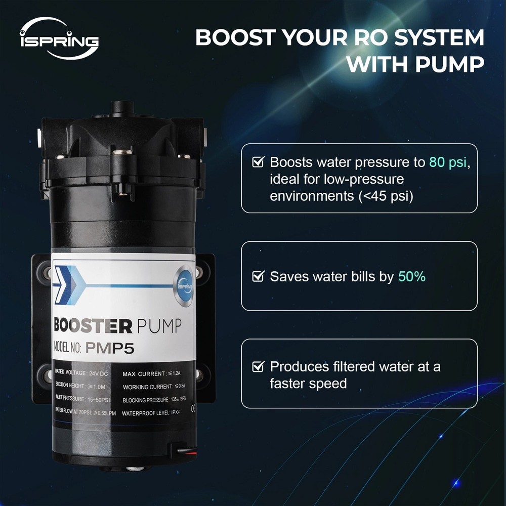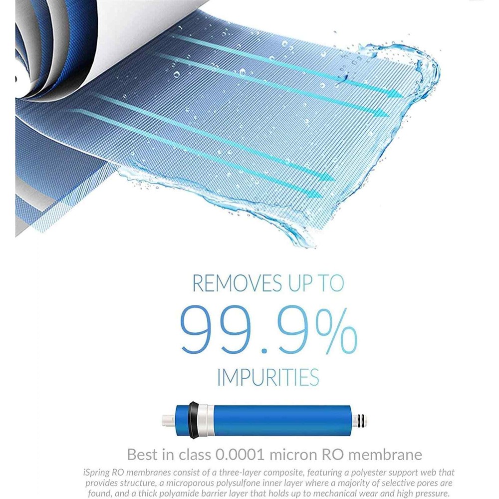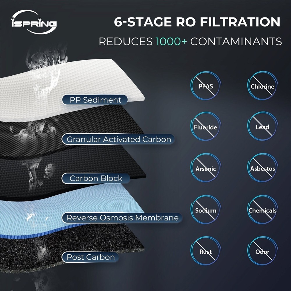 Purify your water while minimizing waste with this ingenious system. The six-stage design removes impurities that leave a bad taste, while the food-grade materials ensure safety. The alkaline stage adds healthy minerals back into the water for a better taste, and the booster pump fills the tank faster so you always have fresh water available.Complete set includes everything you need to install the filter system, including 3.2-gallon tank and gooseneck faucetBooster pump raises pressure to 65 psi to fill the tank fasterEfficient system has a 2:1 waste ratio compared to 3:1 or more for similar systems and removes more than 99-percent of pollutantsFeatures WPA Gold Seal and independently tested against NSF standardsFirst stage is a 5-micron, 10-inch, high-capacity polypropylene sediment Free Shipping Over $49.99* Details iSpring RCC7P-AK Boosted Performance Under Sink 6-Stage RO Drinking Water Product Description: Purify your water while minimizing waste with this ingenious system. The six-stage design removes impurities that leave a bad taste, while the food-grade materials ensure safety. The alkaline stage adds healthy minerals back into the water for a better taste, and the booster pump fills the tank faster so you always have fresh water available. Complete set includes everything you need to install the filter system, including 3.2-gallon tank and gooseneck faucet Booster pump raises pressure to 65 psi to fill the tank faster Efficient system has a 2:1 waste ratio compared to 3:1 or more for similar systems and removes more than 99-percent of pollutants Features WPA Gold Seal and independently tested against NSF standards First stage is a 5-micron, 10-inch, high-capacity polypropylene sediment filter to remove sediment Second stage is a 5-micron, 10-inch granular activated carbon filter to remove odors Third stage is a 5-micron, 10-inch carbon block to remove residual odors and colors Fourth stage is a 0.0001-micron high-rejection TFC reverse osmosis membrane Fifth stage is a 1-micron, 10-inch total polishing inline carbon filter Sixth stage is an alkaline pH filter Installation hardware includes tank valve, feed water adapter, drain saddle, teflon tape, two wrenches, 3 spare O-rings, 2 spare elbow fittings, and user manuals Made from metal, plastic, and other food-grade materials Assembly required