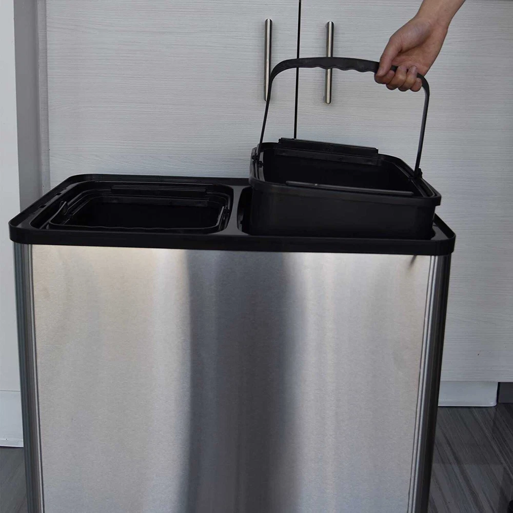This stainless steel commercial grade 16 gallon touchless Recycle/Trash Can has two separate 8 gallon lidded compartments. One compartment for trash and one for recycle, or one for paper and one for bottles and cans. It uses the latest sensor technology, simply place your hand or debris about 6 inches away from one of two infrared sensors on top of the trash can and the lids will open automatically independent of each other. Each lid will remain open if debris or your hand is within the 6 inch range of the infrared sensor. It will close automatically 3 seconds after debris has been released and your hand has been moved away. There are two sets of buttons to open and close each lid manually, and a power switch to turn on/off the recycle can. You can also lift the lids manually without Free Shipping Over $49.99* Details iTouchless 16 Gallon Stainless Steel Dual-Compartment (8 Gal each) Sensor Trash Product Description: This stainless steel commercial grade 16 gallon touchless Recycle/Trash Can has two separate 8 gallon lidded compartments. One compartment for trash and one for recycle, or one for paper and one for bottles and cans. It uses the latest sensor technology, simply place your hand or debris about 6 inches away from one of two infrared sensors on top of the trash can and the lids will open automatically independent of each other. Each lid will remain open if debris or your hand is within the 6 inch range of the infrared sensor. It will close automatically 3 seconds after debris has been released and your hand has been moved away. There are two sets of buttons to open and close each lid manually, and a power switch to turn on/off the recycle can. You can also lift the lids manually without using the battery. Fits any regular 8 to 13 gallon size trash bags in each compartment or just use the two included inner plastic buckets.