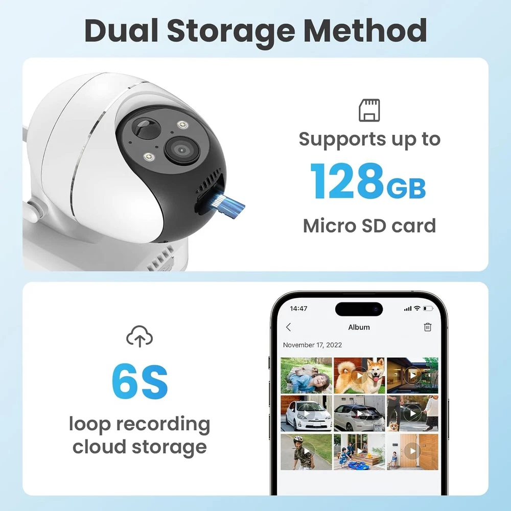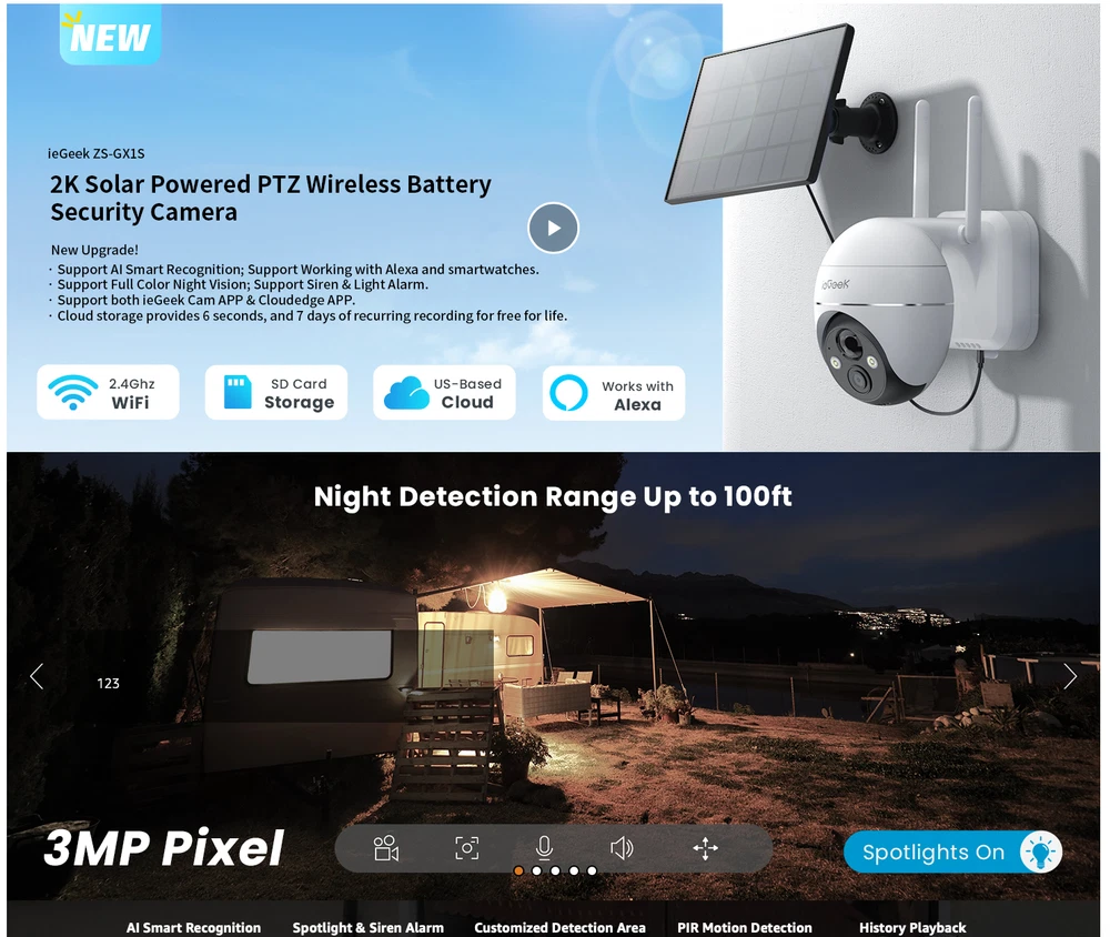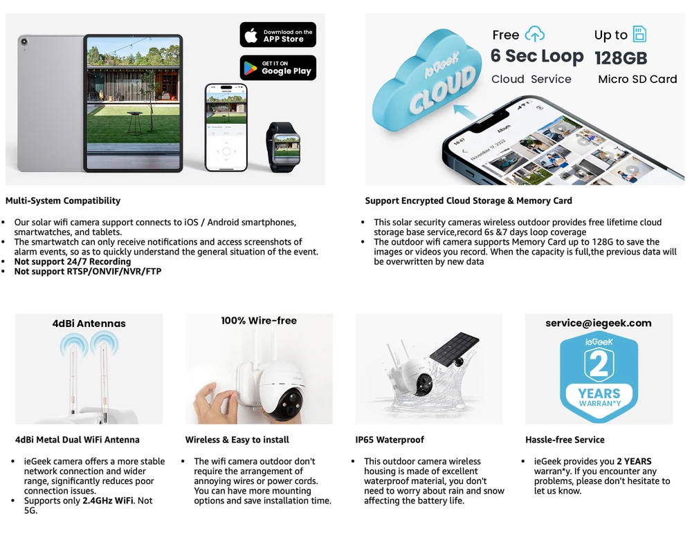 ieGeek Security Camera Outdoor, 2K Wireless WiFi 360°PTZ Camera, Solar Battery Powered Surveillance Camera with Spotlight/Siren/Motion Detection/3MP Color Night Vision,Compatible with Alexa Recommended Uses For Product Outdoor Security Brand ieGeek Model Name ZS-GX1S Connectivity Technology Wireless Special Feature 2k QHD, Solar & Battery Powered, Color Night Vision, Spotlight & Siren, Intelligent Motion Detection, 2-Way Talk, Multi-User Sharing, IP65 Weatherproof, Compatible with Alexa, Not support 24/7 Recording, Not support RTSP/ONVIF/NVR/FTP 2k QHD, Solar & Battery Powered, Color Night Vision, Spotlight & Siren, Intelligent Motion Detection, 2-Way Talk, Multi-User Sharing, IP65 Weatherproof, Compatible About this item 2K/3MP Quad HD & 100ft Color Night Vision - ieGeek cameras for home security are equipped with 1/3 CMOS color sensor, providing crystal clear images and videos regardless of weather conditions. 4 IR lights automatically sense ambient light and switch to color night vision mode, the monitor distance is up to 100ft/30m. In addition, we offer a 2-year warranty, to keep your safety and trust. Solar Powered & 100% Wire-Free & 4dbi Dual Antennas - The solar camera outdoor wireless with a 30% high conversion rate monocrystalline silicon solar panel and rechargeable batteries ensures eternal power. No hassle of removing camera to charge. 4dbi Dual antennas entitle the camera to a stronger and more stable network reception. Only supports 2.4Ghz WiFi which has better penetration and wider wifi range to realize longer distance wifi connection, not 5GHz. Flexible Pan Tilt & 360°Coverage & 2-Way Audio - 355°horizontal rotation & 120°vertical rotation & 4X digital zoom is controllable on the app, with 130-degree wide-angle, the home security cameras guarantee a panoramic shot of every corner of your home, shop, garage. You can also make real-time calls through the built-in microphone and speaker. This outdoor security camera wireless will be a great tool to scare off intruders. PIR Motion Detection & Real-time Alerts - Adapt optimized AI algorithms, ieGeek security cameras wireless outside significantly enhance human-like recognition to reduce false alarms, and human detection is switchable. You can even Customize the Alarm plan, Alarm Interval, and sensitivity level between 1-10. Built-in Photo-diode supports instant alert notifications(in 0.2s-2s), you can download and share events with others at any time. Multiple users Access Control & IP65 Waterproof - Easily share the home security camera with your families or friends just with a QR scan. All video from security camera outdoor is encrypted and no one will get it without your permission. IP65 waterproof design can completely prevent dust and splash water from entering. The solar security camera outdoor can work flawlessly outdoors, regardless of heavy rain or sun exposure. The standard operating temperature should be from -13°F to 140°F.