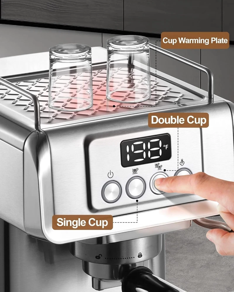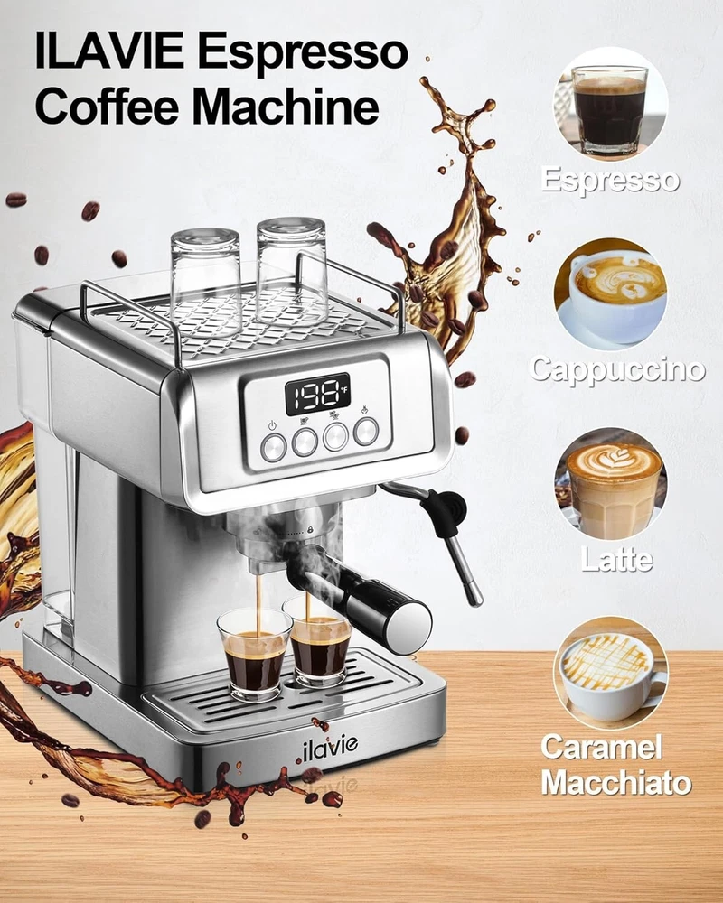Espresso Machine 20 Bar, Professional Espresso Maker Cappuccino Machine with Steam Milk Frother, Stainless Steel Espresso Coffee Machine with 61oz Removable Water Tank, for Home Office Rich Crema & Full Favor Espresso : With 20 bar pump pressure, it creates the balance between flavor extraction and crema formation. Now you can make a nice espresso at home with ilavie espresso machine. PID Temperature Control : Intelligent temperature control system maintains stable water temperatures during the brewing and steaming process so that it can keep the original taste of coffee and the creamy texture of milk foam. Make Your Latte Art Always : Our espresso machine has a powerful steam wand, which can create amazing smooth milk foam with thousand of tiny bubles. It's essential for latte art. Durable & Food-Grade Material : We provide food grade stainless steel filters for single shot and double shot, you can choose what you like. The 304 stainless steel appearance is long-lasting and fashional in your kitchen or office. Useful Tips: Please kindly note that if you need to brew coffee immediately after frothing milk. The screen will show "E-2" and over-heating protection mode will be on automatically to protect the machine. At this time, you only need to release some hot water through the steam wand for 5-10 second. Then the screen will show "198F" and you can brew a next cup of espresso, don't need shut it down to wait for 5-10 mins. US buyer pays $15.00 shipping!