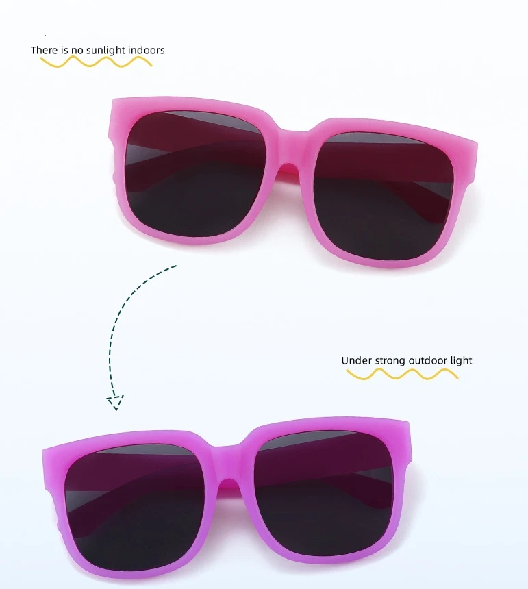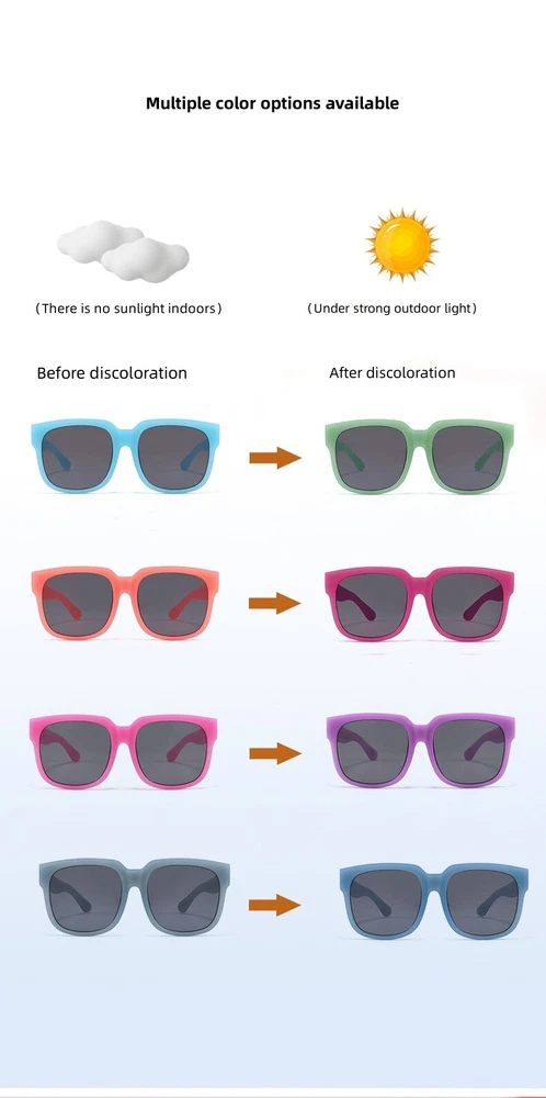 Discover fashionable and comfortable children's sunglasses that every fashion conscious child will love! With its charming design and vibrant colors such as gray, pink, green, and yellow, boys and girls can express their personalities and emphasize their personal styles. The sturdy plastic frame and rubber eyeglass legs provide optimal support and comfort, while TAC lenses ensure a 100% UV protection factor of 380 to protect your child's sensitive eyes from harmful radiation. Polarized lenses can also reduce glare, making them ideal for strong sunlight without affecting STVO approval. The carefully selected sizes of these children's sunglasses ensure a comfortable fit and a comfortable fit See for yourself the perfect combination of functionality and fashionable design, which makes these sunglasses a must-have for every fashion-conscious child. With relevant keywords such as UV protection factor 380, polarization, lens opacity, children's sunglasses and STVO approved, this product stands out from the crowd and impresses with its quality and functionality. The children's sunglasses have a 100% UV protection factor 380 and polarization filter With these glasses you have a lens opacity of up to class 3, making these glasses well suited for very strong sunlight. The upgraded frame adopts a color changing factor. When the ultraviolet light is strong, the color blocks are obvious, and when the ultraviolet light is weak, the color change transition period is slower, making your life more interesting.