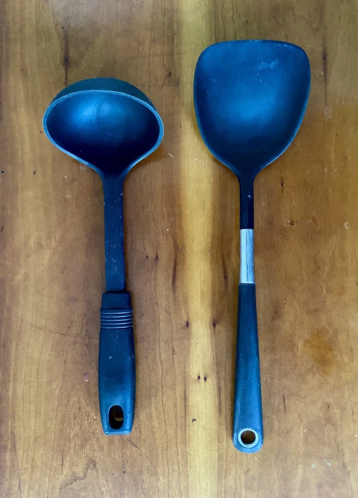5 used kitchen utensils in good condition. Some handles show some wear but the tools are in good shape.