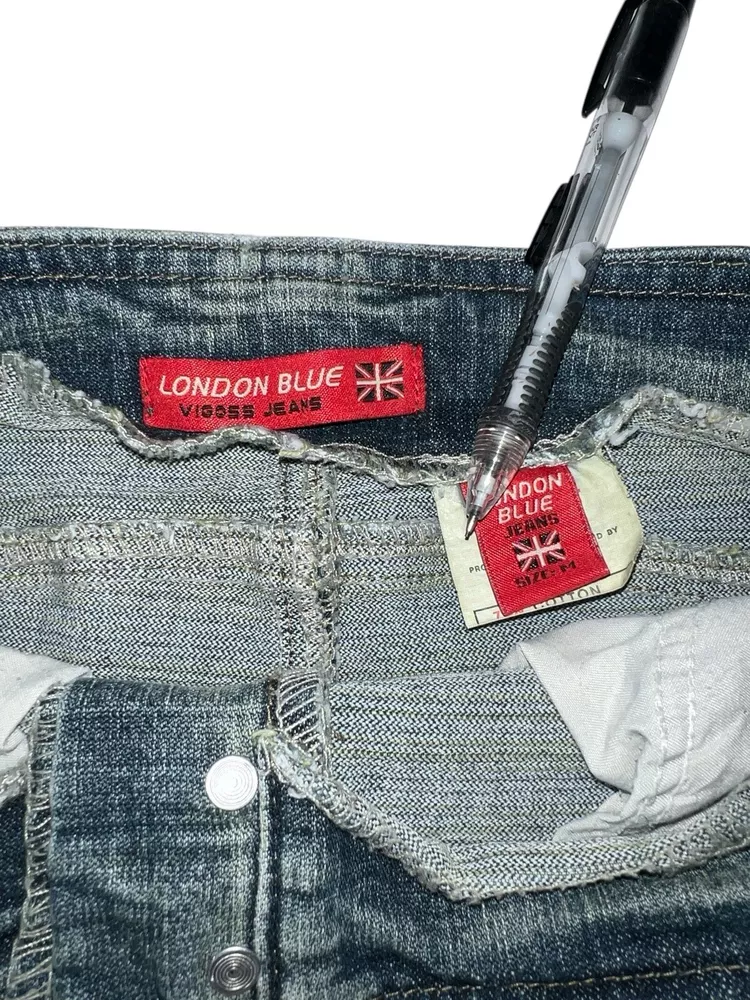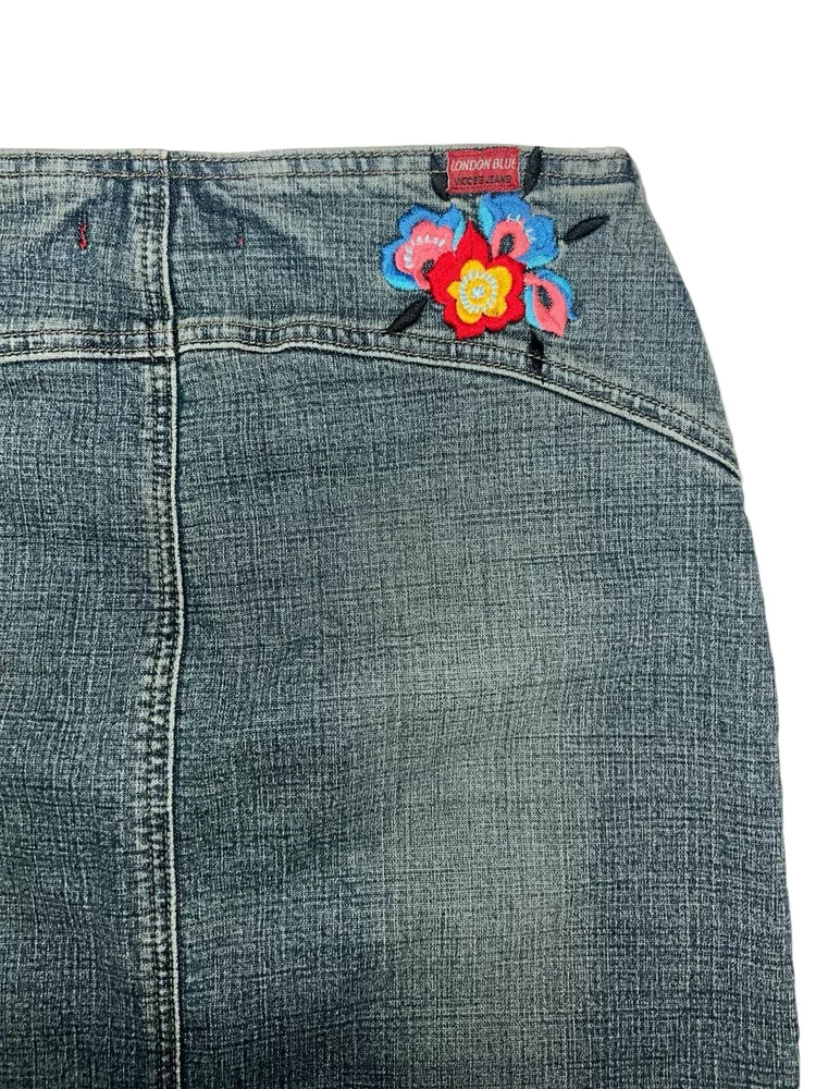 Vintage Y2K funky embroidered jean skirt by London Blue Vigoss Jeans. Four button buttonfly closure. Rainbow and flower embroidery on the left side and additional flowers on the back near waist. Two front pockets and no belt loops. Tag says size M (see measurements) 70% cotton and has some stretch to it.