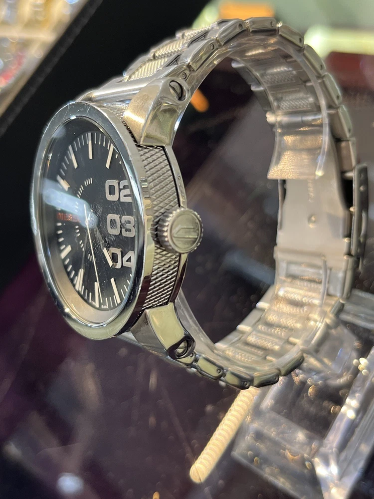 Bold & handsome in Mint condition. Check out the knurling on the case, and the high polished bezel, all crafted from 316L stainless steel. It is running, and keeping great time. I only ship within the U.S.. Thank you for looking, and happy bidding… Drinda