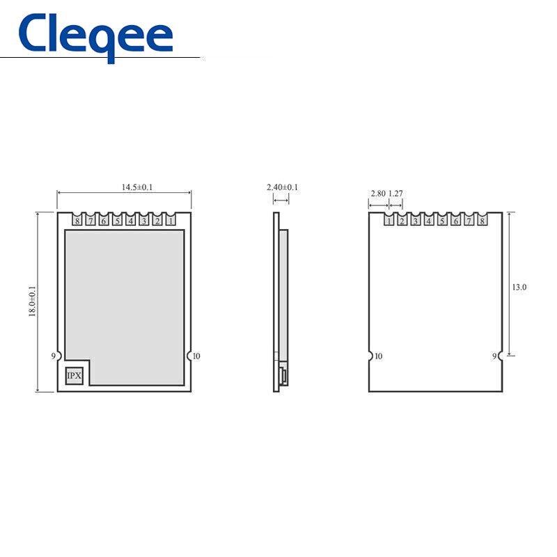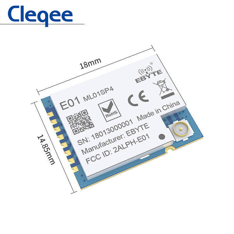 20dBm 2.4Ghz nRF24L01P SPI Wireless Module IPX Transmitter Receiver E01-ML01SP4 RF Parameter Value Remark Working frequency 2400~2525 MHz Default: 2.4GHz (16MHz oscillator) Transmitting power 20 dBm Max. Power (100mW) Receiving sensitivity -96 dBm Air data rate: 250kbps Air data rate 250k~2Mbps Default: 250kbps Test distance 2000m In open and clear air, with maximum power, 5dBi antenna gain, height of 2m, air data rate: 250kbps Hardware Parameter Value Remark Size 14.8 * 18 mm Without SMA Antenna type IPEX Communication interface SPI Package SMD Electronic parameter Min. Typ. Max. Unit Condition Power supply 2.0 3.3 3.6 V Communication level 2.0 3.3 3.6 V Transmitting current 110 120 130 mA 20dBm(100mW) Receiving current 24 26 28 mA Sleep current 0.5 1.0 2.0 μA Operating temperature -40 20 +85 ℃ Operating humidity 10 60 90 % Storage temperature -40 20 +125 ℃