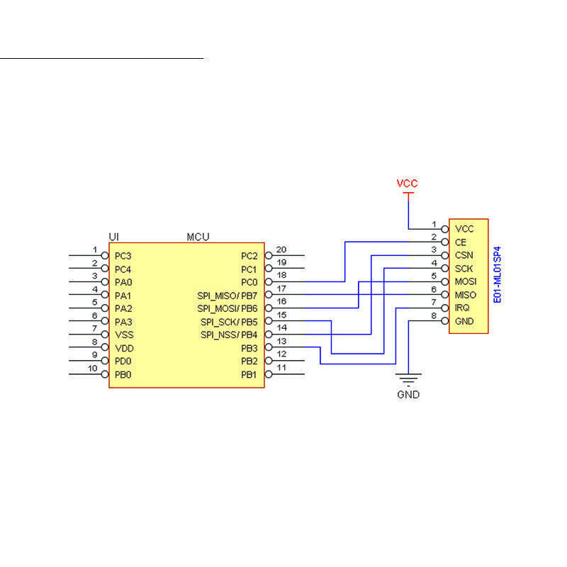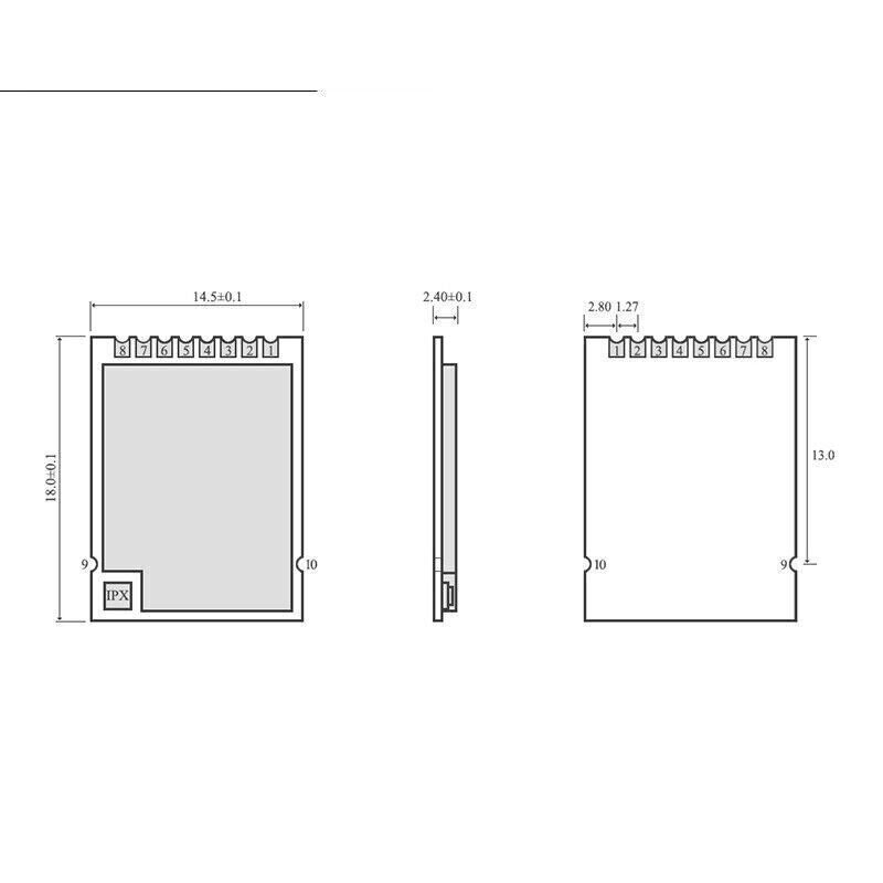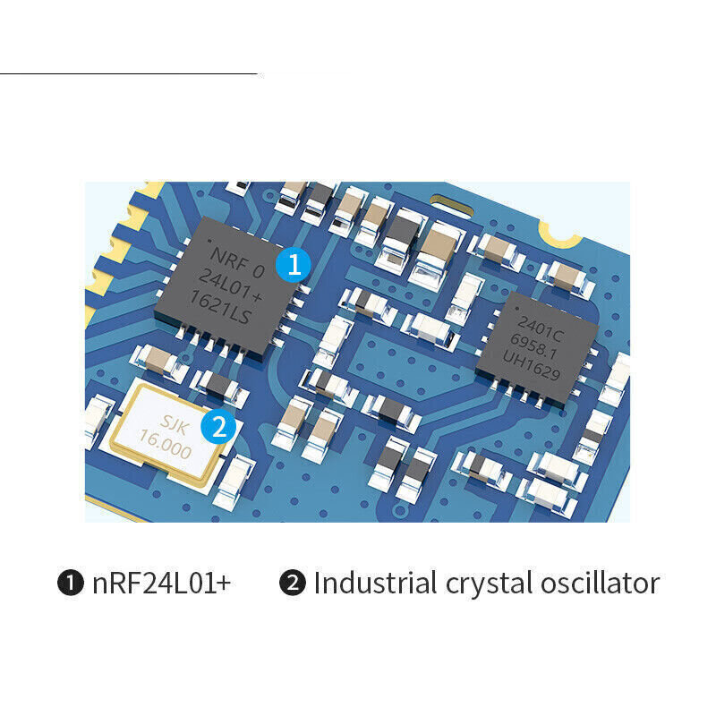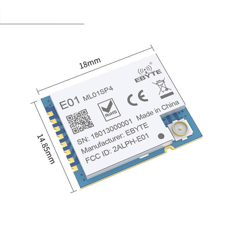 20dBm 2.4Ghz nRF24L01P SPI Wireless Module IPX Transmitter Receiver E01-ML01SP4 RF Parameter Value Remark Working frequency 2400~2525 MHz Default: 2.4GHz (16MHz oscillator) Transmitting power 20 dBm Max. Power (100mW) Receiving sensitivity -96 dBm Air data rate: 250kbps Air data rate 250k~2Mbps Default: 250kbps Test distance 2000m In open and clear air, with maximum power, 5dBi antenna gain, height of 2m, air data rate: 250kbps Hardware Parameter Value Remark Size 14.8 * 18 mm Without SMA Antenna type IPEX Communication interface SPI Package SMD Electronic parameter Min. Typ. Max. Unit Condition Power supply 2.0 3.3 3.6 V Communication level 2.0 3.3 3.6 V Transmitting current 110 120 130 mA 20dBm(100mW) Receiving current 24 26 28 mA Sleep current 0.5 1.0 2.0 μA Operating temperature -40 20 +85 ℃ Operating humidity 10 60 90 % Storage temperature -40 20 +125 ℃