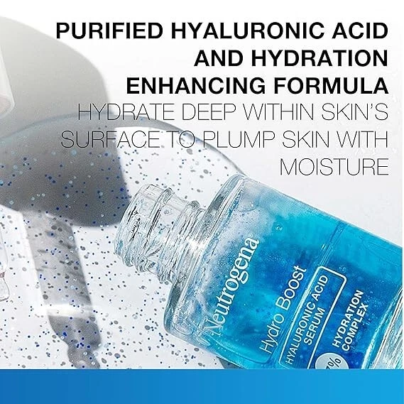 Fragrance Free Hydro Boost Hyaluronic Acid Serum for face, daily face serum deeply quenches skin for extra smooth, supple skin Face and neck serum is free of fragrances, parabens and mineral oil and formulated with two sizes of hyaluronic acid and the skin-mimicking water-magnet trehalose and dermatologist-recommended glycerin, leaving skin feeling supple and smooth Dermatologist-tested daily lightweight face serum instantly quenches and infuses moisture deep into skin's surface and is suitable for all skin types, including sensitive skin Every morning and evening, apply 4-5 drops of hyaluronic acid serum to your face and neck as a part of your daily skin care routine after cleansing with Hydro Boost Cleanser and before moisturizing with Hydro Boost Water Gel 1-fluid ounce bottle of Neutrogena Hydro Boost Hyaluronic Acid Fragrance-Free Facial Serum deeply quenches for extra-smooth, supple skin as part of your at-home skincare routine