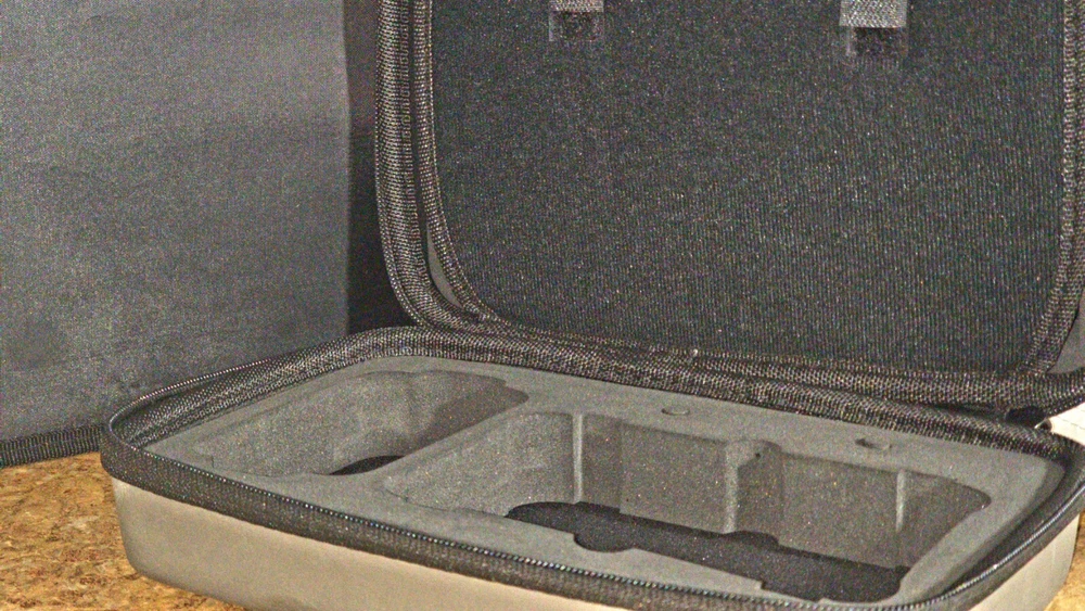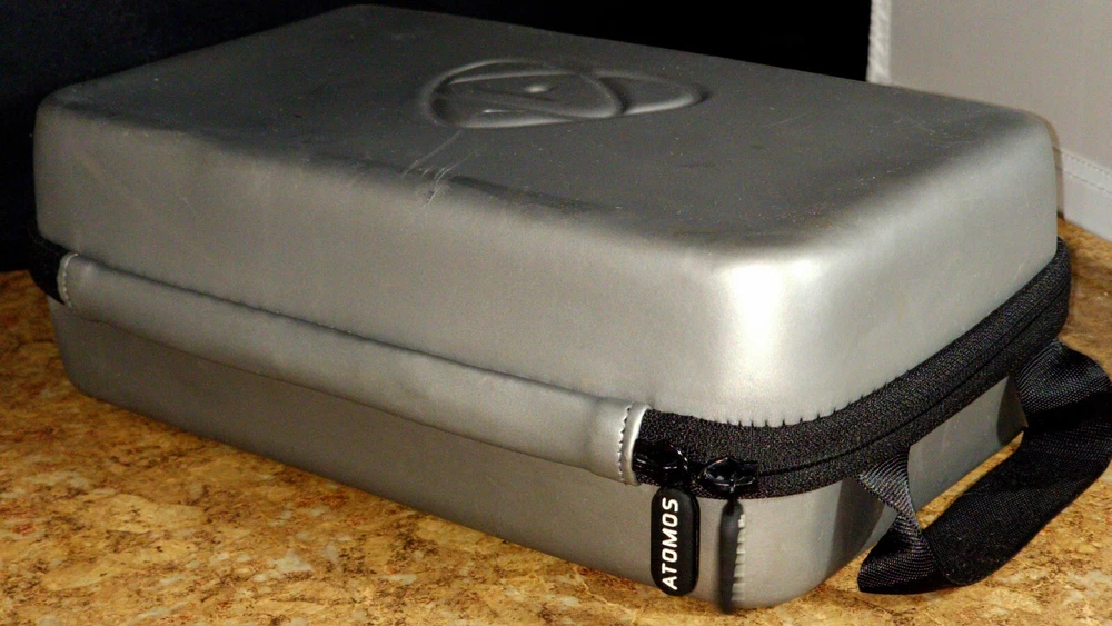 The Atomos Ninja Atomos V softshell case in gray glossy color is a Neoprene carry-on designed to fit a camera. It features an adjustable design to securely hold the camera while providing protection during transport.