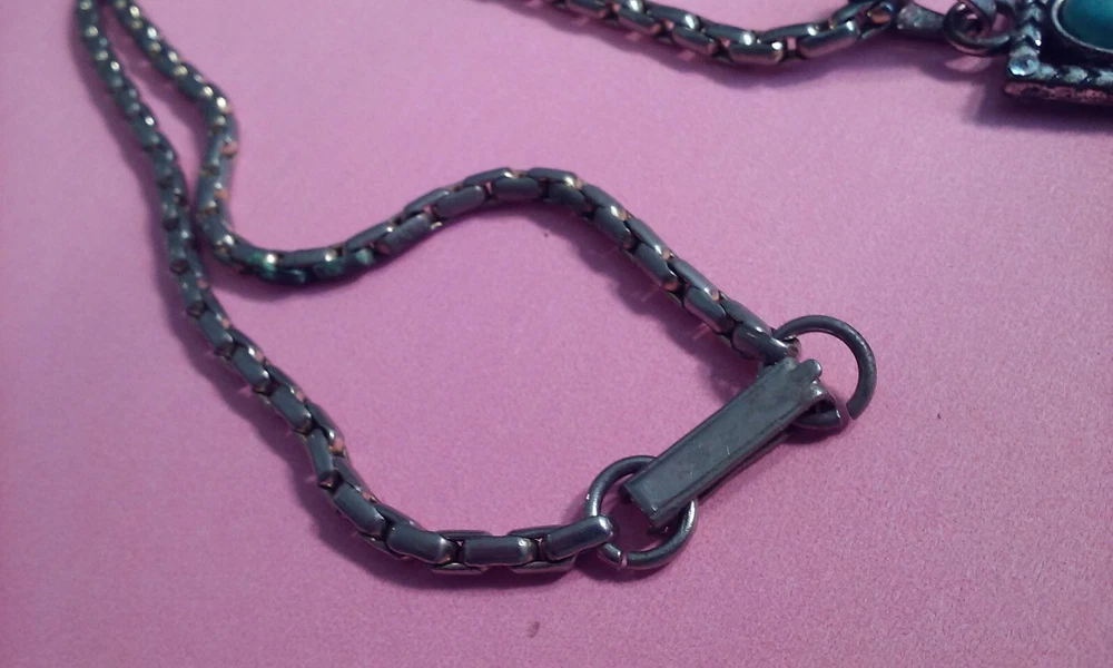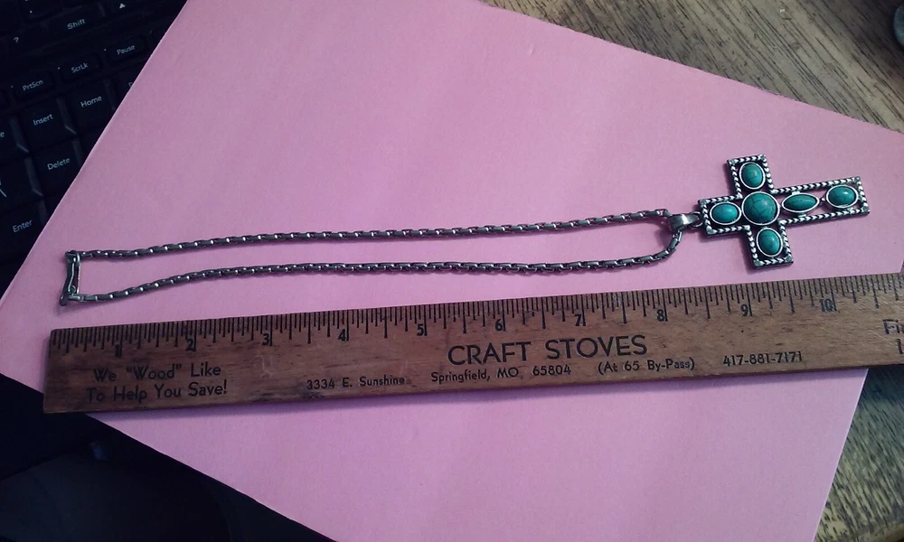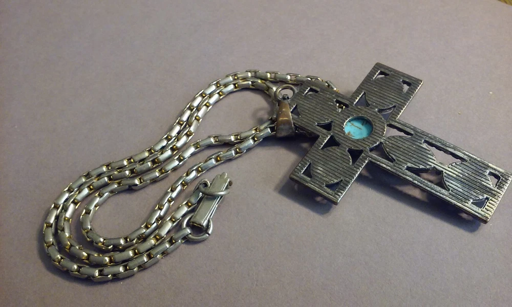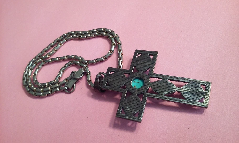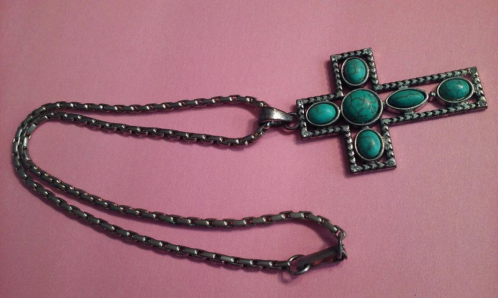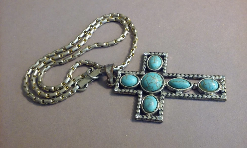 old Christian Silver-Tone CROSS & 18" Inch Chain Pendant Necklace & Blue Natural Stones Turquoise? The chain has neat unusual type links, not your normal chain.