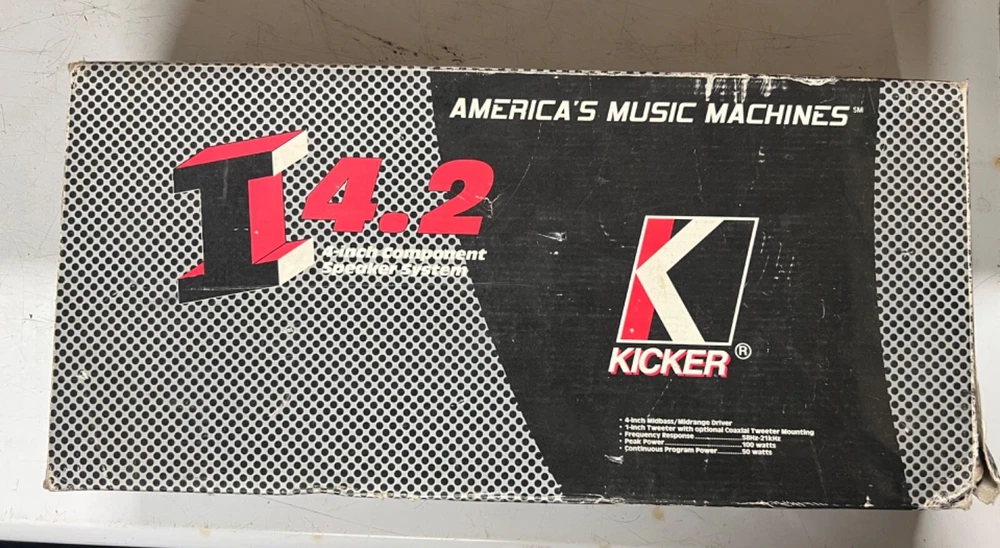 This old school kicker component system is a must-have for any car audio enthusiast. With a brand name like KICKER, you know you're getting a high-quality product that will last. The system includes a 4in. speaker size and a model number of Kicker i 4.2, making it a great addition to any vehicle.The RMS power of this system is 50W, providing clear and powerful sound. It's perfect for those who want to upgrade their car's audio system and experience the difference in sound quality. This component speaker system is ideal for anyone who loves music and wants to enjoy it at its best. Everything is new in box never used or mounted. Outer shipping box is in rough shape but still is together. This is Oldschool 1997. These sets were made from 1994 to 1998. Do to the age of the product there is no warranty. I do not accept returns sales are final it is as is.