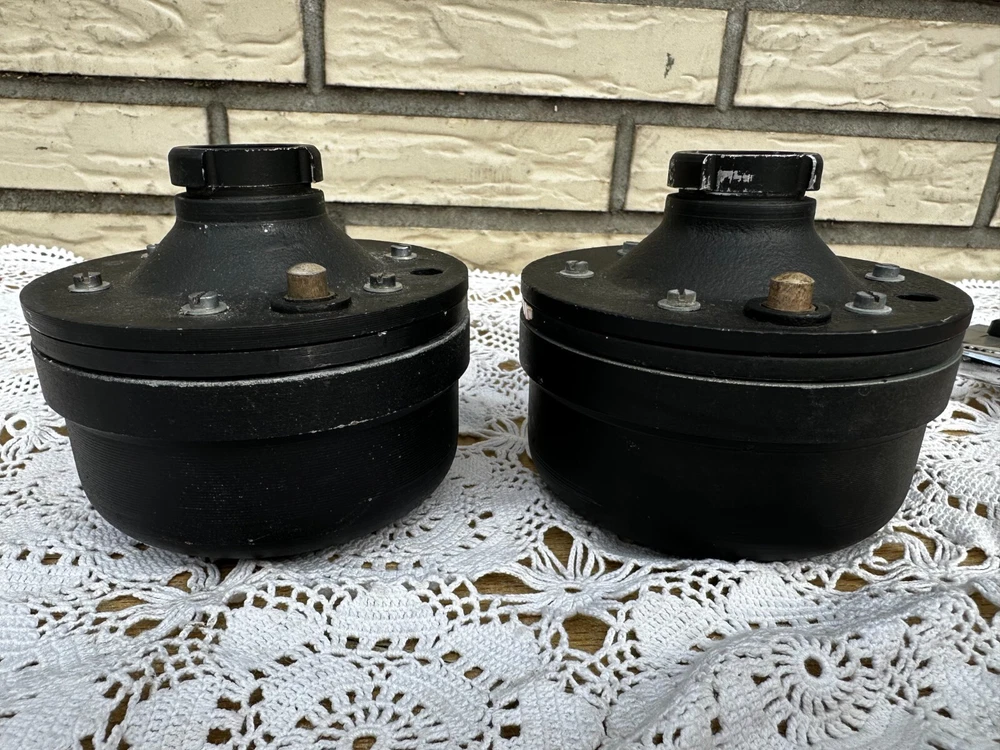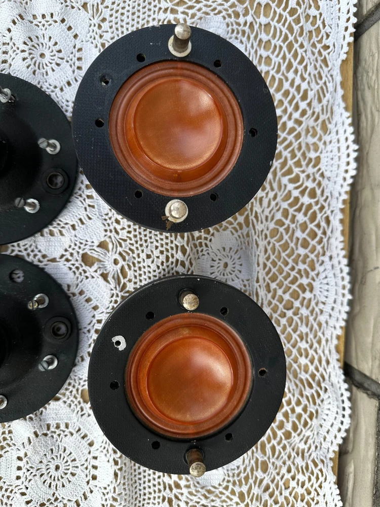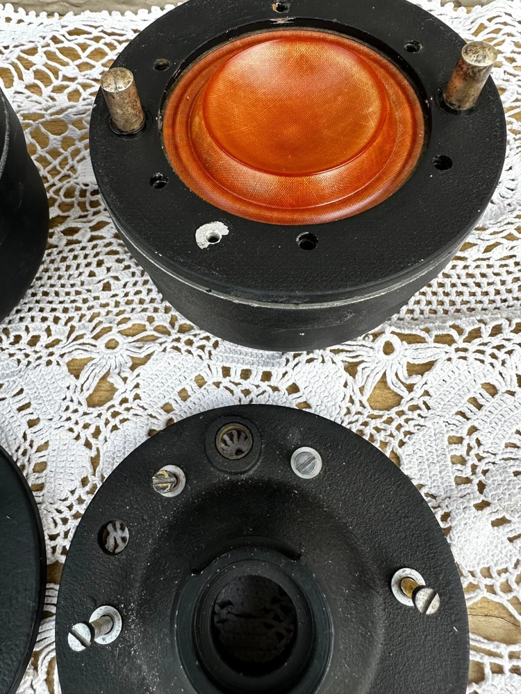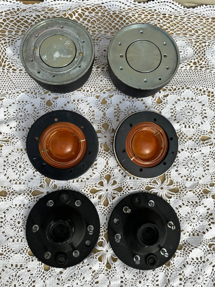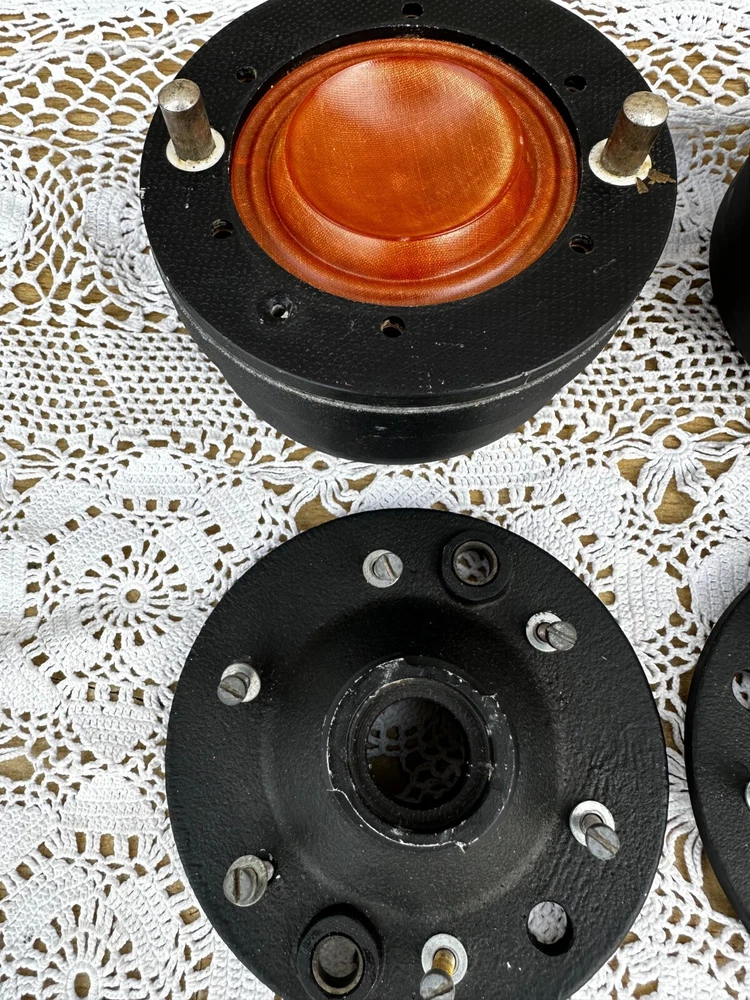 Here we have a pair Telefunken horn driver speaker , made in the 1960ies by Telefunken , West-Germany These drivers have phenolic membranes and 8 Ohm impedance. The Pout is around 40 Watt The Magnets are type AlNiCo , very big and heavy units ! High efficient . powerful sound, perfect for any low power single ended tube amp. price is for the pair ! worldwide shipping