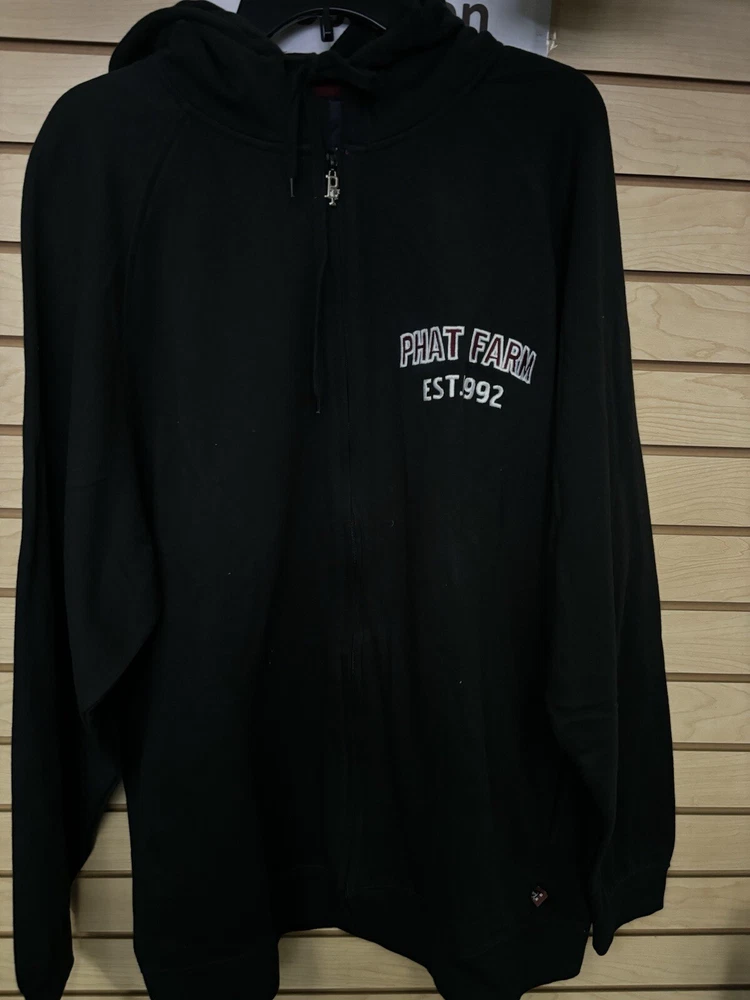 This Phat Farm hoodie is the perfect addition to any streetwear lover's wardrobe. With a full zip closure and hood, this black hoodie is both stylish and practical. The fleece fabric type ensures warmth and comfort, while the hip hop theme adds a touch of personality. The hoodie features pockets for added convenience, making it perfect for everyday wear or for carrying essentials. The size type is regular, and the department is men's. This hoodie is a must-have for any man looking to add a touch of style to their wardrobe. We have size Large to 3XL if any questions please call 213)746-4500 or visit us in store at 1031 S. Los Angeles St. Los Angeles, CA 90015.