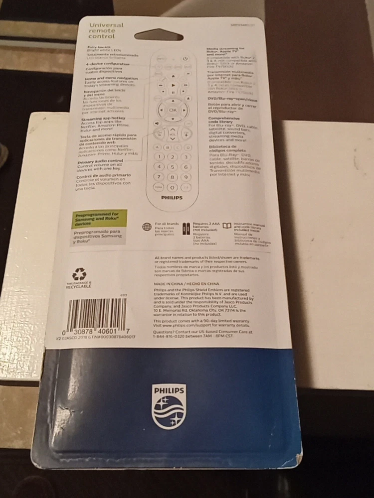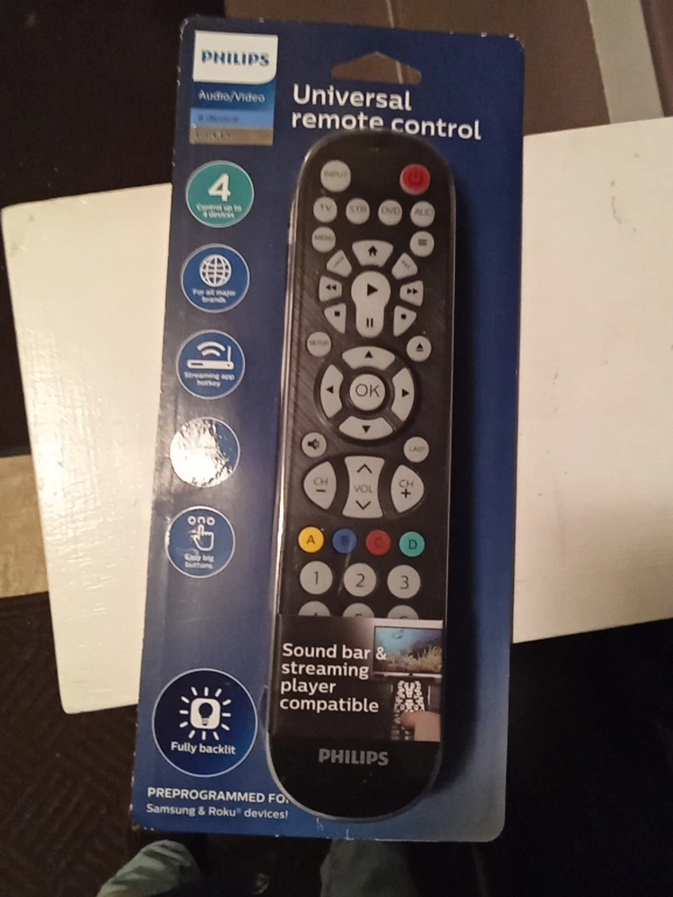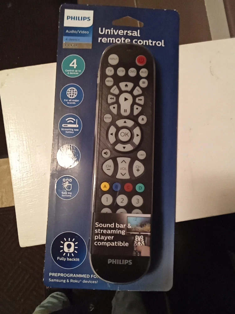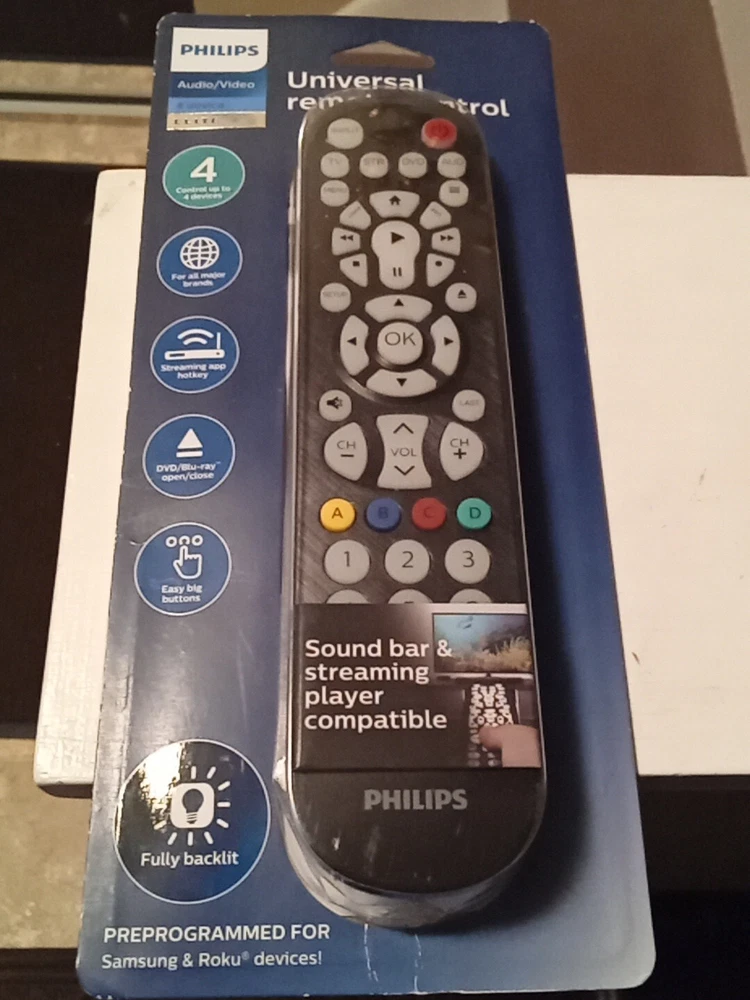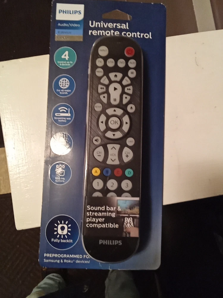 This is a universal remote control made by Philips that is compatible with Samsung and Roku devices. It has a wireless range of 5-10 meters and comes in black. The remote is feature-rich and can be used to control your TV, audio system, and other compatible devices with ease. It is made in China and is suitable for use with Philips GoGear and other compatible models.
