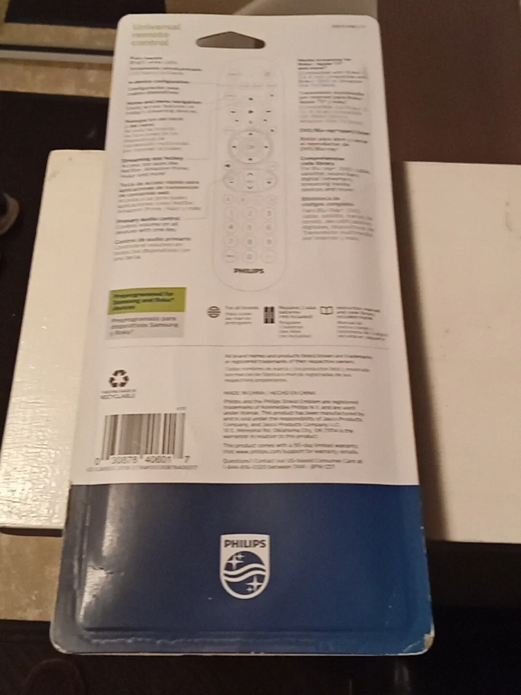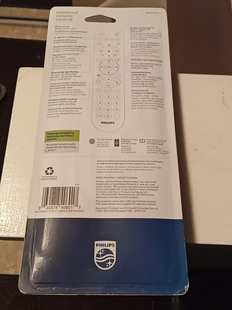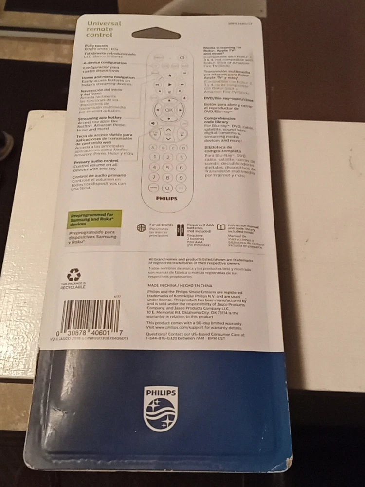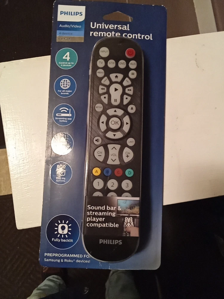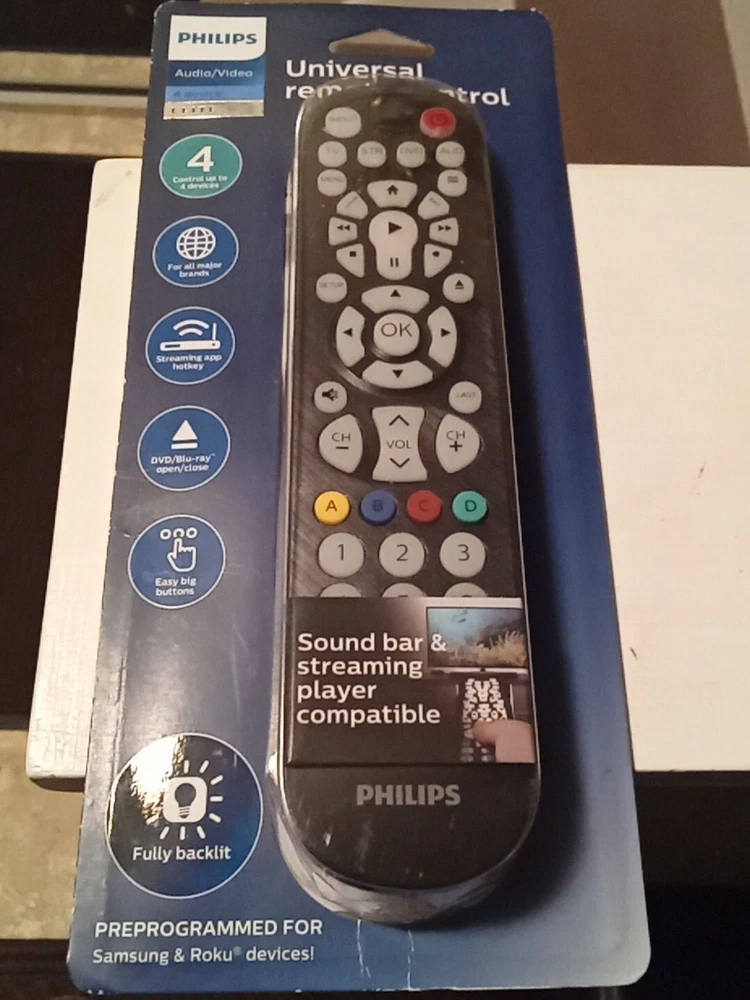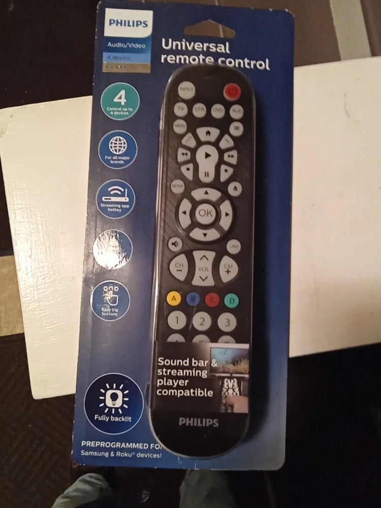 This is a universal remote control made by Philips that is compatible with Samsung and Roku devices. It has a wireless range of 5-10 meters and comes in black. The remote is feature-rich and can be used to control your TV, audio system, and other compatible devices with ease. It is made in China and is suitable for use with Philips GoGear and other compatible models.
